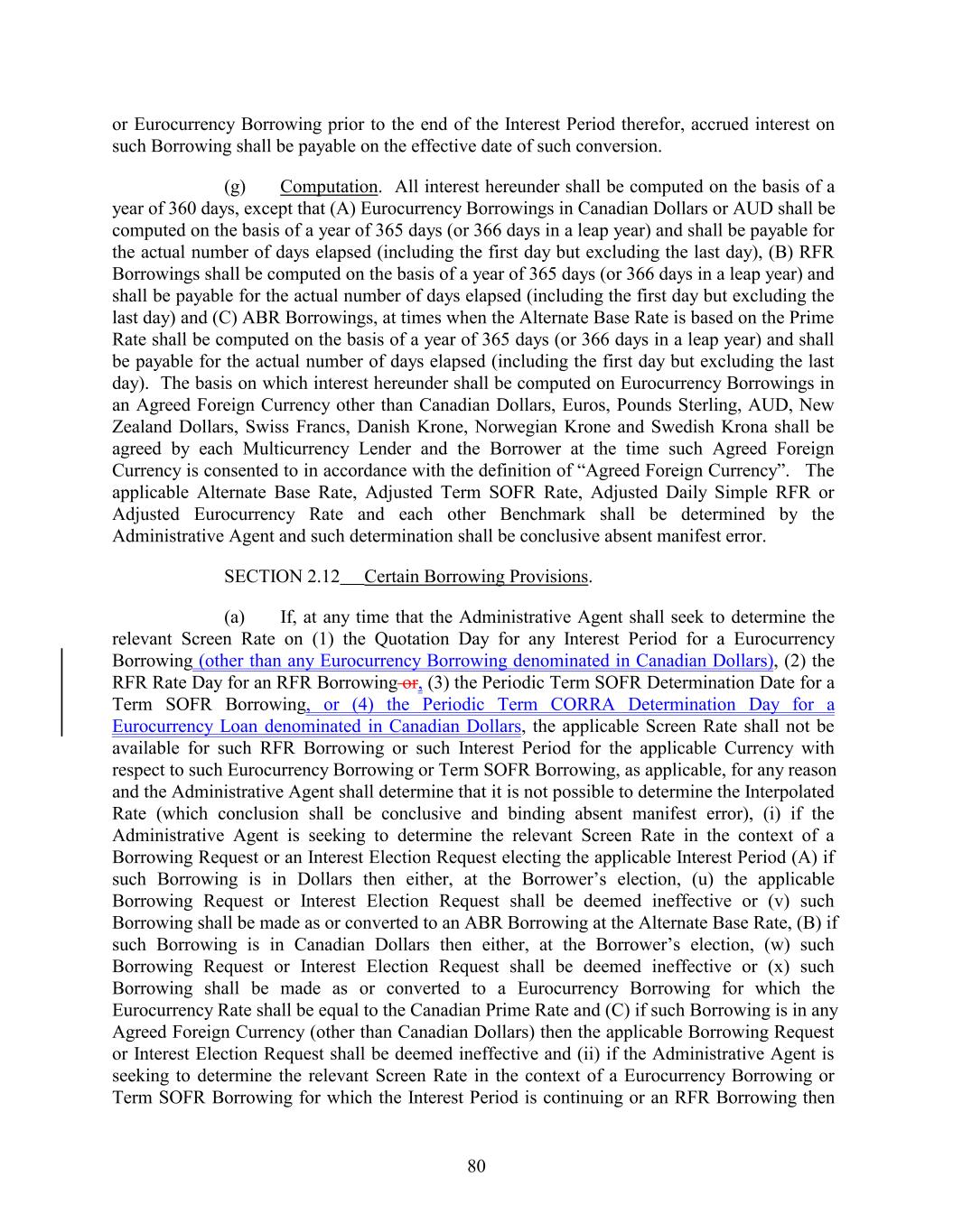 or Eurocurrency Borrowing prior to the end of the Interest Period therefor, accrued interest on such Borrowing shall be payable on the effective date of such conversion. (g) Computation. All interest hereunder shall be computed on the basis of a year of 360 days, except that (A) Eurocurrency Borrowings in Canadian Dollars or AUD shall be computed on the basis of a year of 365 days (or 366 days in a leap year) and shall be payable for the actual number of days elapsed (including the first day but excluding the last day), (B) RFR Borrowings shall be computed on the basis of a year of 365 days (or 366 days in a leap year) and shall be payable for the actual number of days elapsed (including the first day but excluding the last day) and (C) ABR Borrowings, at times when the Alternate Base Rate is based on the Prime Rate shall be computed on the basis of a year of 365 days (or 366 days in a leap year) and shall be payable for the actual number of days elapsed (including the first day but excluding the last day). The basis on which interest hereunder shall be computed on Eurocurrency Borrowings in an Agreed Foreign Currency other than Canadian Dollars, Euros, Pounds Sterling, AUD, New Zealand Dollars, Swiss Francs, Danish Krone, Norwegian Krone and Swedish Krona shall be agreed by each Multicurrency Lender and the Borrower at the time such Agreed Foreign Currency is consented to in accordance with the definition of “Agreed Foreign Currency”. The applicable Alternate Base Rate, Adjusted Term SOFR Rate, Adjusted Daily Simple RFR or Adjusted Eurocurrency Rate and each other Benchmark shall be determined by the Administrative Agent and such determination shall be conclusive absent manifest error. SECTION 2.12 Certain Borrowing Provisions. (a) If, at any time that the Administrative Agent shall seek to determine the relevant Screen Rate on (1) the Quotation Day for any Interest Period for a Eurocurrency Borrowing (other than any Eurocurrency Borrowing denominated in Canadian Dollars), (2) the RFR Rate Day for an RFR Borrowing or, (3) the Periodic Term SOFR Determination Date for a Term SOFR Borrowing, or (4) the Periodic Term CORRA Determination Day for a Eurocurrency Loan denominated in Canadian Dollars, the applicable Screen Rate shall not be available for such RFR Borrowing or such Interest Period for the applicable Currency with respect to such Eurocurrency Borrowing or Term SOFR Borrowing, as applicable, for any reason and the Administrative Agent shall determine that it is not possible to determine the Interpolated Rate (which conclusion shall be conclusive and binding absent manifest error), (i) if the Administrative Agent is seeking to determine the relevant Screen Rate in the context of a Borrowing Request or an Interest Election Request electing the applicable Interest Period (A) if such Borrowing is in Dollars then either, at the Borrower’s election, (u) the applicable Borrowing Request or Interest Election Request shall be deemed ineffective or (v) such Borrowing shall be made as or converted to an ABR Borrowing at the Alternate Base Rate, (B) if such Borrowing is in Canadian Dollars then either, at the Borrower’s election, (w) such Borrowing Request or Interest Election Request shall be deemed ineffective or (x) such Borrowing shall be made as or converted to a Eurocurrency Borrowing for which the Eurocurrency Rate shall be equal to the Canadian Prime Rate and (C) if such Borrowing is in any Agreed Foreign Currency (other than Canadian Dollars) then the applicable Borrowing Request or Interest Election Request shall be deemed ineffective and (ii) if the Administrative Agent is seeking to determine the relevant Screen Rate in the context of a Eurocurrency Borrowing or Term SOFR Borrowing for which the Interest Period is continuing or an RFR Borrowing then 80