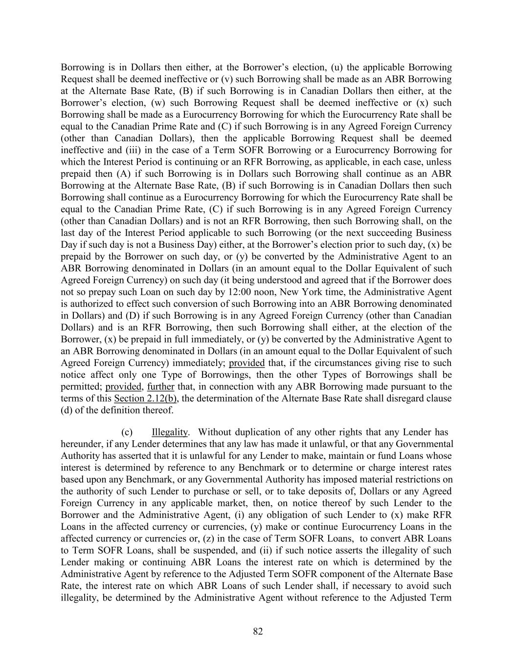 Borrowing is in Dollars then either, at the Borrower’s election, (u) the applicable Borrowing Request shall be deemed ineffective or (v) such Borrowing shall be made as an ABR Borrowing at the Alternate Base Rate, (B) if such Borrowing is in Canadian Dollars then either, at the Borrower’s election, (w) such Borrowing Request shall be deemed ineffective or (x) such Borrowing shall be made as a Eurocurrency Borrowing for which the Eurocurrency Rate shall be equal to the Canadian Prime Rate and (C) if such Borrowing is in any Agreed Foreign Currency (other than Canadian Dollars), then the applicable Borrowing Request shall be deemed ineffective and (iii) in the case of a Term SOFR Borrowing or a Eurocurrency Borrowing for which the Interest Period is continuing or an RFR Borrowing, as applicable, in each case, unless prepaid then (A) if such Borrowing is in Dollars such Borrowing shall continue as an ABR Borrowing at the Alternate Base Rate, (B) if such Borrowing is in Canadian Dollars then such Borrowing shall continue as a Eurocurrency Borrowing for which the Eurocurrency Rate shall be equal to the Canadian Prime Rate, (C) if such Borrowing is in any Agreed Foreign Currency (other than Canadian Dollars) and is not an RFR Borrowing, then such Borrowing shall, on the last day of the Interest Period applicable to such Borrowing (or the next succeeding Business Day if such day is not a Business Day) either, at the Borrower’s election prior to such day, (x) be prepaid by the Borrower on such day, or (y) be converted by the Administrative Agent to an ABR Borrowing denominated in Dollars (in an amount equal to the Dollar Equivalent of such Agreed Foreign Currency) on such day (it being understood and agreed that if the Borrower does not so prepay such Loan on such day by 12:00 noon, New York time, the Administrative Agent is authorized to effect such conversion of such Borrowing into an ABR Borrowing denominated in Dollars) and (D) if such Borrowing is in any Agreed Foreign Currency (other than Canadian Dollars) and is an RFR Borrowing, then such Borrowing shall either, at the election of the Borrower, (x) be prepaid in full immediately, or (y) be converted by the Administrative Agent to an ABR Borrowing denominated in Dollars (in an amount equal to the Dollar Equivalent of such Agreed Foreign Currency) immediately; provided that, if the circumstances giving rise to such notice affect only one Type of Borrowings, then the other Types of Borrowings shall be permitted; provided, further that, in connection with any ABR Borrowing made pursuant to the terms of this Section 2.12(b), the determination of the Alternate Base Rate shall disregard clause (d) of the definition thereof. (c) Illegality. Without duplication of any other rights that any Lender has hereunder, if any Lender determines that any law has made it unlawful, or that any Governmental Authority has asserted that it is unlawful for any Lender to make, maintain or fund Loans whose interest is determined by reference to any Benchmark or to determine or charge interest rates based upon any Benchmark, or any Governmental Authority has imposed material restrictions on the authority of such Lender to purchase or sell, or to take deposits of, Dollars or any Agreed Foreign Currency in any applicable market, then, on notice thereof by such Lender to the Borrower and the Administrative Agent, (i) any obligation of such Lender to (x) make RFR Loans in the affected currency or currencies, (y) make or continue Eurocurrency Loans in the affected currency or currencies or, (z) in the case of Term SOFR Loans, to convert ABR Loans to Term SOFR Loans, shall be suspended, and (ii) if such notice asserts the illegality of such Lender making or continuing ABR Loans the interest rate on which is determined by the Administrative Agent by reference to the Adjusted Term SOFR component of the Alternate Base Rate, the interest rate on which ABR Loans of such Lender shall, if necessary to avoid such illegality, be determined by the Administrative Agent without reference to the Adjusted Term 82