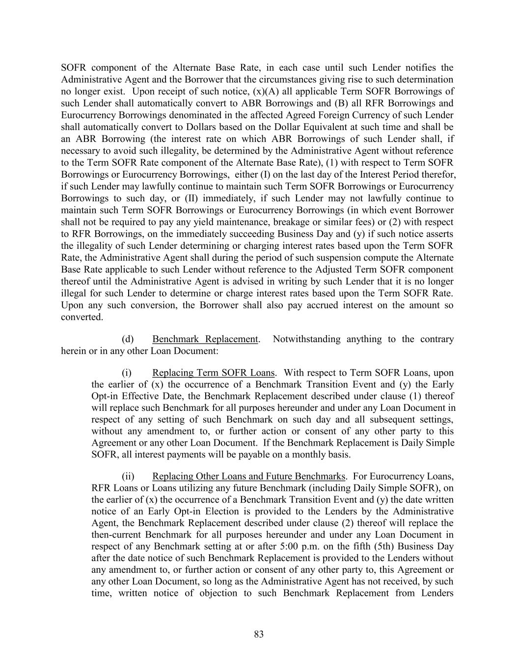 SOFR component of the Alternate Base Rate, in each case until such Lender notifies the Administrative Agent and the Borrower that the circumstances giving rise to such determination no longer exist. Upon receipt of such notice, (x)(A) all applicable Term SOFR Borrowings of such Lender shall automatically convert to ABR Borrowings and (B) all RFR Borrowings and Eurocurrency Borrowings denominated in the affected Agreed Foreign Currency of such Lender shall automatically convert to Dollars based on the Dollar Equivalent at such time and shall be an ABR Borrowing (the interest rate on which ABR Borrowings of such Lender shall, if necessary to avoid such illegality, be determined by the Administrative Agent without reference to the Term SOFR Rate component of the Alternate Base Rate), (1) with respect to Term SOFR Borrowings or Eurocurrency Borrowings, either (I) on the last day of the Interest Period therefor, if such Lender may lawfully continue to maintain such Term SOFR Borrowings or Eurocurrency Borrowings to such day, or (II) immediately, if such Lender may not lawfully continue to maintain such Term SOFR Borrowings or Eurocurrency Borrowings (in which event Borrower shall not be required to pay any yield maintenance, breakage or similar fees) or (2) with respect to RFR Borrowings, on the immediately succeeding Business Day and (y) if such notice asserts the illegality of such Lender determining or charging interest rates based upon the Term SOFR Rate, the Administrative Agent shall during the period of such suspension compute the Alternate Base Rate applicable to such Lender without reference to the Adjusted Term SOFR component thereof until the Administrative Agent is advised in writing by such Lender that it is no longer illegal for such Lender to determine or charge interest rates based upon the Term SOFR Rate. Upon any such conversion, the Borrower shall also pay accrued interest on the amount so converted. (d) Benchmark Replacement. Notwithstanding anything to the contrary herein or in any other Loan Document: (i) Replacing Term SOFR Loans. With respect to Term SOFR Loans, upon the earlier of (x) the occurrence of a Benchmark Transition Event and (y) the Early Opt-in Effective Date, the Benchmark Replacement described under clause (1) thereof will replace such Benchmark for all purposes hereunder and under any Loan Document in respect of any setting of such Benchmark on such day and all subsequent settings, without any amendment to, or further action or consent of any other party to this Agreement or any other Loan Document. If the Benchmark Replacement is Daily Simple SOFR, all interest payments will be payable on a monthly basis. (ii) Replacing Other Loans and Future Benchmarks. For Eurocurrency Loans, RFR Loans or Loans utilizing any future Benchmark (including Daily Simple SOFR), on the earlier of (x) the occurrence of a Benchmark Transition Event and (y) the date written notice of an Early Opt-in Election is provided to the Lenders by the Administrative Agent, the Benchmark Replacement described under clause (2) thereof will replace the then-current Benchmark for all purposes hereunder and under any Loan Document in respect of any Benchmark setting at or after 5:00 p.m. on the fifth (5th) Business Day after the date notice of such Benchmark Replacement is provided to the Lenders without any amendment to, or further action or consent of any other party to, this Agreement or any other Loan Document, so long as the Administrative Agent has not received, by such time, written notice of objection to such Benchmark Replacement from Lenders 83