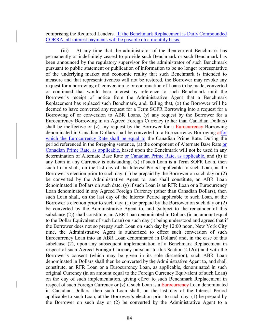 comprising the Required Lenders. If the Benchmark Replacement is Daily Compounded CORRA, all interest payments will be payable on a monthly basis. (iii) At any time that the administrator of the then-current Benchmark has permanently or indefinitely ceased to provide such Benchmark or such Benchmark has been announced by the regulatory supervisor for the administrator of such Benchmark pursuant to public statement or publication of information to be no longer representative of the underlying market and economic reality that such Benchmark is intended to measure and that representativeness will not be restored, the Borrower may revoke any request for a borrowing of, conversion to or continuation of Loans to be made, converted or continued that would bear interest by reference to such Benchmark until the Borrower’s receipt of notice from the Administrative Agent that a Benchmark Replacement has replaced such Benchmark, and, failing that, (x) the Borrower will be deemed to have converted any request for a Term SOFR Borrowing into a request for a Borrowing of or conversion to ABR Loans, (y) any request by the Borrower for a Eurocurrency Borrowing in an Agreed Foreign Currency (other than Canadian Dollars) shall be ineffective or (z) any request by the Borrower for a Eurocurrency Borrowing denominated in Canadian Dollars shall be converted to a Eurocurrency Borrowing atfor which the Eurocurrency Rate shall be equal to the Canadian Prime Rate. During the period referenced in the foregoing sentence, (a) the component of Alternate Base Rate or Canadian Prime Rate, as applicable, based upon the Benchmark will not be used in any determination of Alternate Base Rate or Canadian Prime Rate, as applicable, and (b) if any Loan in any Currency is outstanding, (x) if such Loan is a Term SOFR Loan, then such Loan shall, on the last day of the Interest Period applicable to such Loan, at the Borrower’s election prior to such day: (1) be prepaid by the Borrower on such day or (2) be converted by the Administrative Agent to, and shall constitute, an ABR Loan denominated in Dollars on such date, (y) if such Loan is an RFR Loan or a Eurocurrency Loan denominated in any Agreed Foreign Currency (other than Canadian Dollars), then such Loan shall, on the last day of the Interest Period applicable to such Loan, at the Borrower’s election prior to such day: (1) be prepaid by the Borrower on such day or (2) be converted by the Administrative Agent to, and (subject to the remainder of this subclause (2)) shall constitute, an ABR Loan denominated in Dollars (in an amount equal to the Dollar Equivalent of such Loan) on such day (it being understood and agreed that if the Borrower does not so prepay such Loan on such day by 12:00 noon, New York City time, the Administrative Agent is authorized to effect such conversion of such Eurocurrency Loan into an ABR Loan denominated in Dollars) and, in the case of this subclause (2), upon any subsequent implementation of a Benchmark Replacement in respect of such Agreed Foreign Currency pursuant to this Section 2.12(d) and with the Borrower’s consent (which may be given in its sole discretion), such ABR Loan denominated in Dollars shall then be converted by the Administrative Agent to, and shall constitute, an RFR Loan or a Eurocurrency Loan, as applicable, denominated in such original Currency (in an amount equal to the Foreign Currency Equivalent of such Loan) on the day of such implementation, giving effect to such Benchmark Replacement in respect of such Foreign Currency or (z) if such Loan is a Eurocurrency Loan denominated in Canadian Dollars, then such Loan shall, on the last day of the Interest Period applicable to such Loan, at the Borrower’s election prior to such day: (1) be prepaid by the Borrower on such day or (2) be converted by the Administrative Agent to a 84