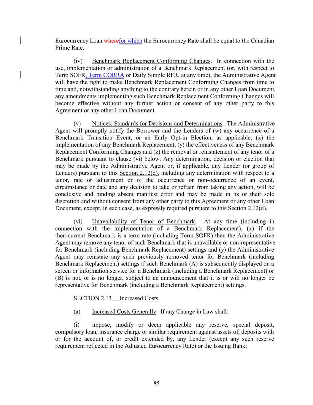 Eurocurrency Loan wherefor which the Eurocurrency Rate shall be equal to the Canadian Prime Rate. (iv) Benchmark Replacement Conforming Changes. In connection with the use, implementation or administration of a Benchmark Replacement (or, with respect to Term SOFR, Term CORRA or Daily Simple RFR, at any time), the Administrative Agent will have the right to make Benchmark Replacement Conforming Changes from time to time and, notwithstanding anything to the contrary herein or in any other Loan Document, any amendments implementing such Benchmark Replacement Conforming Changes will become effective without any further action or consent of any other party to this Agreement or any other Loan Document. (v) Notices; Standards for Decisions and Determinations. The Administrative Agent will promptly notify the Borrower and the Lenders of (w) any occurrence of a Benchmark Transition Event, or an Early Opt-in Election, as applicable, (x) the implementation of any Benchmark Replacement, (y) the effectiveness of any Benchmark Replacement Conforming Changes and (z) the removal or reinstatement of any tenor of a Benchmark pursuant to clause (vi) below. Any determination, decision or election that may be made by the Administrative Agent or, if applicable, any Lender (or group of Lenders) pursuant to this Section 2.12(d), including any determination with respect to a tenor, rate or adjustment or of the occurrence or non-occurrence of an event, circumstance or date and any decision to take or refrain from taking any action, will be conclusive and binding absent manifest error and may be made in its or their sole discretion and without consent from any other party to this Agreement or any other Loan Document, except, in each case, as expressly required pursuant to this Section 2.12(d). (vi) Unavailability of Tenor of Benchmark. At any time (including in connection with the implementation of a Benchmark Replacement), (x) if the then-current Benchmark is a term rate (including Term SOFR) then the Administrative Agent may remove any tenor of such Benchmark that is unavailable or non-representative for Benchmark (including Benchmark Replacement) settings and (y) the Administrative Agent may reinstate any such previously removed tenor for Benchmark (including Benchmark Replacement) settings if such Benchmark (A) is subsequently displayed on a screen or information service for a Benchmark (including a Benchmark Replacement) or (B) is not, or is no longer, subject to an announcement that it is or will no longer be representative for Benchmark (including a Benchmark Replacement) settings. SECTION 2.13 Increased Costs. (a) Increased Costs Generally. If any Change in Law shall: (i) impose, modify or deem applicable any reserve, special deposit, compulsory loan, insurance charge or similar requirement against assets of, deposits with or for the account of, or credit extended by, any Lender (except any such reserve requirement reflected in the Adjusted Eurocurrency Rate) or the Issuing Bank; 85