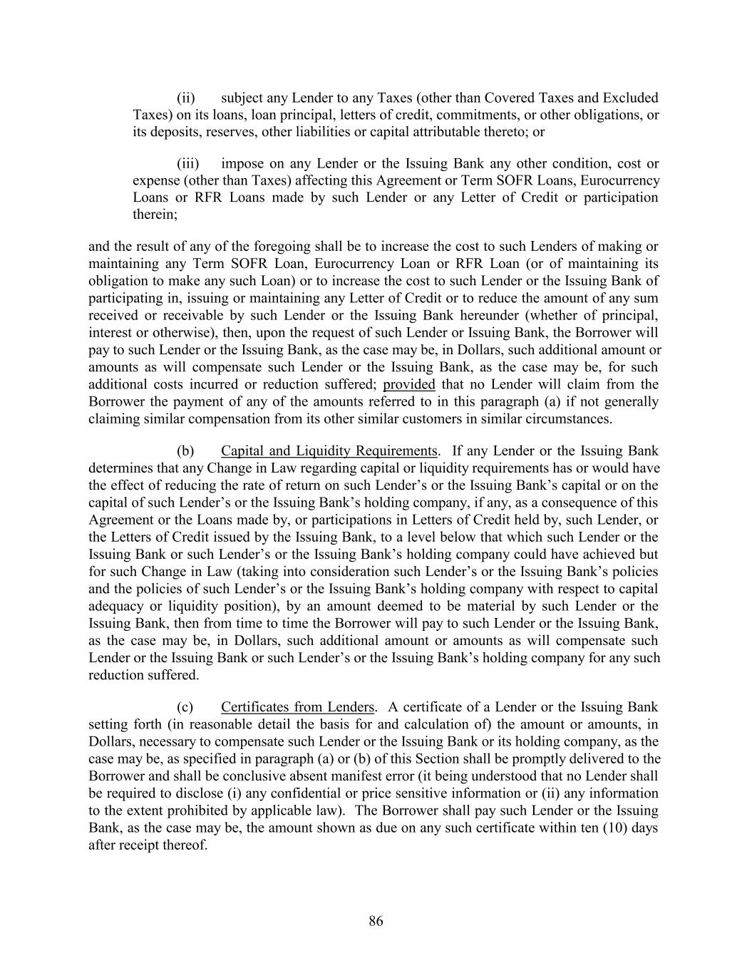 (ii) subject any Lender to any Taxes (other than Covered Taxes and Excluded Taxes) on its loans, loan principal, letters of credit, commitments, or other obligations, or its deposits, reserves, other liabilities or capital attributable thereto; or (iii) impose on any Lender or the Issuing Bank any other condition, cost or expense (other than Taxes) affecting this Agreement or Term SOFR Loans, Eurocurrency Loans or RFR Loans made by such Lender or any Letter of Credit or participation therein; and the result of any of the foregoing shall be to increase the cost to such Lenders of making or maintaining any Term SOFR Loan, Eurocurrency Loan or RFR Loan (or of maintaining its obligation to make any such Loan) or to increase the cost to such Lender or the Issuing Bank of participating in, issuing or maintaining any Letter of Credit or to reduce the amount of any sum received or receivable by such Lender or the Issuing Bank hereunder (whether of principal, interest or otherwise), then, upon the request of such Lender or Issuing Bank, the Borrower will pay to such Lender or the Issuing Bank, as the case may be, in Dollars, such additional amount or amounts as will compensate such Lender or the Issuing Bank, as the case may be, for such additional costs incurred or reduction suffered; provided that no Lender will claim from the Borrower the payment of any of the amounts referred to in this paragraph (a) if not generally claiming similar compensation from its other similar customers in similar circumstances. (b) Capital and Liquidity Requirements. If any Lender or the Issuing Bank determines that any Change in Law regarding capital or liquidity requirements has or would have the effect of reducing the rate of return on such Lender’s or the Issuing Bank’s capital or on the capital of such Lender’s or the Issuing Bank’s holding company, if any, as a consequence of this Agreement or the Loans made by, or participations in Letters of Credit held by, such Lender, or the Letters of Credit issued by the Issuing Bank, to a level below that which such Lender or the Issuing Bank or such Lender’s or the Issuing Bank’s holding company could have achieved but for such Change in Law (taking into consideration such Lender’s or the Issuing Bank’s policies and the policies of such Lender’s or the Issuing Bank’s holding company with respect to capital adequacy or liquidity position), by an amount deemed to be material by such Lender or the Issuing Bank, then from time to time the Borrower will pay to such Lender or the Issuing Bank, as the case may be, in Dollars, such additional amount or amounts as will compensate such Lender or the Issuing Bank or such Lender’s or the Issuing Bank’s holding company for any such reduction suffered. (c) Certificates from Lenders. A certificate of a Lender or the Issuing Bank setting forth (in reasonable detail the basis for and calculation of) the amount or amounts, in Dollars, necessary to compensate such Lender or the Issuing Bank or its holding company, as the case may be, as specified in paragraph (a) or (b) of this Section shall be promptly delivered to the Borrower and shall be conclusive absent manifest error (it being understood that no Lender shall be required to disclose (i) any confidential or price sensitive information or (ii) any information to the extent prohibited by applicable law). The Borrower shall pay such Lender or the Issuing Bank, as the case may be, the amount shown as due on any such certificate within ten (10) days after receipt thereof. 86