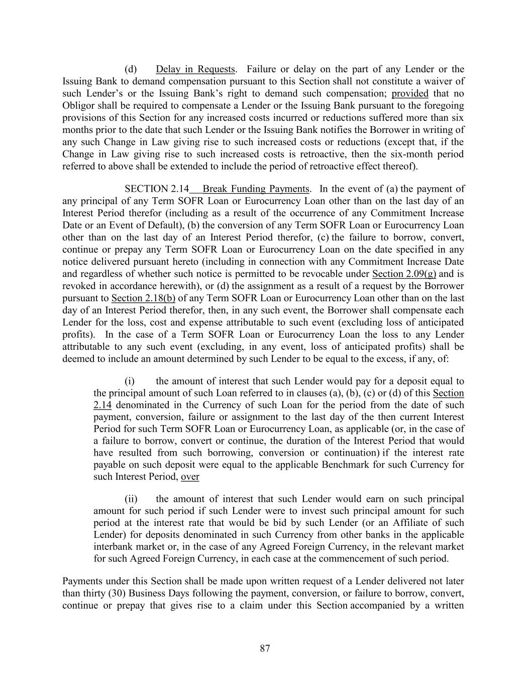 (d) Delay in Requests. Failure or delay on the part of any Lender or the Issuing Bank to demand compensation pursuant to this Section shall not constitute a waiver of such Lender’s or the Issuing Bank’s right to demand such compensation; provided that no Obligor shall be required to compensate a Lender or the Issuing Bank pursuant to the foregoing provisions of this Section for any increased costs incurred or reductions suffered more than six months prior to the date that such Lender or the Issuing Bank notifies the Borrower in writing of any such Change in Law giving rise to such increased costs or reductions (except that, if the Change in Law giving rise to such increased costs is retroactive, then the six-month period referred to above shall be extended to include the period of retroactive effect thereof). SECTION 2.14 Break Funding Payments. In the event of (a) the payment of any principal of any Term SOFR Loan or Eurocurrency Loan other than on the last day of an Interest Period therefor (including as a result of the occurrence of any Commitment Increase Date or an Event of Default), (b) the conversion of any Term SOFR Loan or Eurocurrency Loan other than on the last day of an Interest Period therefor, (c) the failure to borrow, convert, continue or prepay any Term SOFR Loan or Eurocurrency Loan on the date specified in any notice delivered pursuant hereto (including in connection with any Commitment Increase Date and regardless of whether such notice is permitted to be revocable under Section 2.09(g) and is revoked in accordance herewith), or (d) the assignment as a result of a request by the Borrower pursuant to Section 2.18(b) of any Term SOFR Loan or Eurocurrency Loan other than on the last day of an Interest Period therefor, then, in any such event, the Borrower shall compensate each Lender for the loss, cost and expense attributable to such event (excluding loss of anticipated profits). In the case of a Term SOFR Loan or Eurocurrency Loan the loss to any Lender attributable to any such event (excluding, in any event, loss of anticipated profits) shall be deemed to include an amount determined by such Lender to be equal to the excess, if any, of: (i) the amount of interest that such Lender would pay for a deposit equal to the principal amount of such Loan referred to in clauses (a), (b), (c) or (d) of this Section 2.14 denominated in the Currency of such Loan for the period from the date of such payment, conversion, failure or assignment to the last day of the then current Interest Period for such Term SOFR Loan or Eurocurrency Loan, as applicable (or, in the case of a failure to borrow, convert or continue, the duration of the Interest Period that would have resulted from such borrowing, conversion or continuation) if the interest rate payable on such deposit were equal to the applicable Benchmark for such Currency for such Interest Period, over (ii) the amount of interest that such Lender would earn on such principal amount for such period if such Lender were to invest such principal amount for such period at the interest rate that would be bid by such Lender (or an Affiliate of such Lender) for deposits denominated in such Currency from other banks in the applicable interbank market or, in the case of any Agreed Foreign Currency, in the relevant market for such Agreed Foreign Currency, in each case at the commencement of such period. Payments under this Section shall be made upon written request of a Lender delivered not later than thirty (30) Business Days following the payment, conversion, or failure to borrow, convert, continue or prepay that gives rise to a claim under this Section accompanied by a written 87