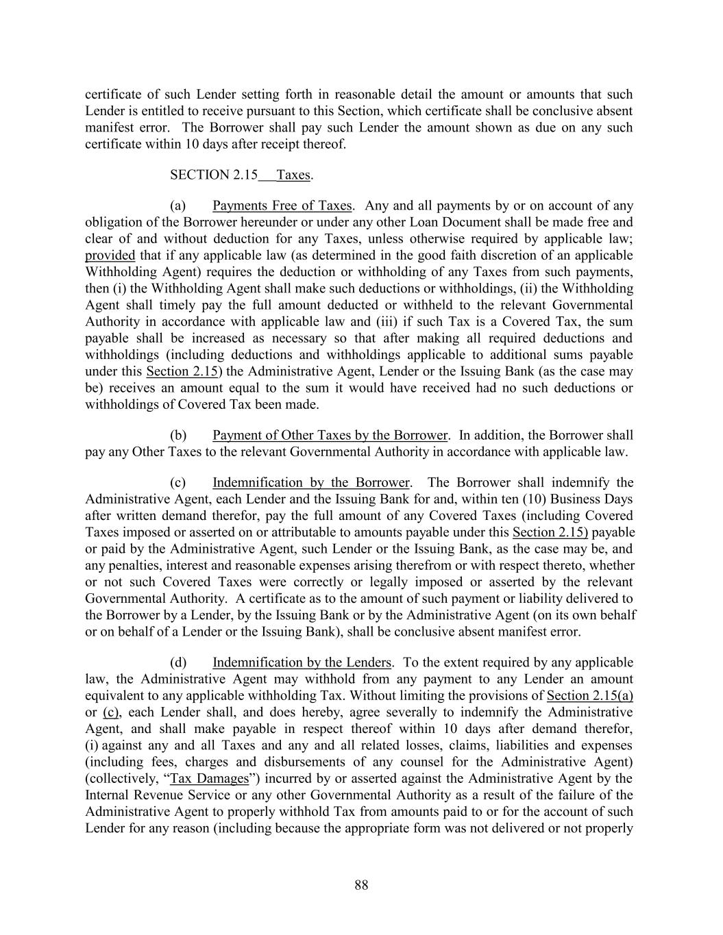 certificate of such Lender setting forth in reasonable detail the amount or amounts that such Lender is entitled to receive pursuant to this Section, which certificate shall be conclusive absent manifest error. The Borrower shall pay such Lender the amount shown as due on any such certificate within 10 days after receipt thereof. SECTION 2.15 Taxes. (a) Payments Free of Taxes. Any and all payments by or on account of any obligation of the Borrower hereunder or under any other Loan Document shall be made free and clear of and without deduction for any Taxes, unless otherwise required by applicable law; provided that if any applicable law (as determined in the good faith discretion of an applicable Withholding Agent) requires the deduction or withholding of any Taxes from such payments, then (i) the Withholding Agent shall make such deductions or withholdings, (ii) the Withholding Agent shall timely pay the full amount deducted or withheld to the relevant Governmental Authority in accordance with applicable law and (iii) if such Tax is a Covered Tax, the sum payable shall be increased as necessary so that after making all required deductions and withholdings (including deductions and withholdings applicable to additional sums payable under this Section 2.15) the Administrative Agent, Lender or the Issuing Bank (as the case may be) receives an amount equal to the sum it would have received had no such deductions or withholdings of Covered Tax been made. (b) Payment of Other Taxes by the Borrower. In addition, the Borrower shall pay any Other Taxes to the relevant Governmental Authority in accordance with applicable law. (c) Indemnification by the Borrower. The Borrower shall indemnify the Administrative Agent, each Lender and the Issuing Bank for and, within ten (10) Business Days after written demand therefor, pay the full amount of any Covered Taxes (including Covered Taxes imposed or asserted on or attributable to amounts payable under this Section 2.15) payable or paid by the Administrative Agent, such Lender or the Issuing Bank, as the case may be, and any penalties, interest and reasonable expenses arising therefrom or with respect thereto, whether or not such Covered Taxes were correctly or legally imposed or asserted by the relevant Governmental Authority. A certificate as to the amount of such payment or liability delivered to the Borrower by a Lender, by the Issuing Bank or by the Administrative Agent (on its own behalf or on behalf of a Lender or the Issuing Bank), shall be conclusive absent manifest error. (d) Indemnification by the Lenders. To the extent required by any applicable law, the Administrative Agent may withhold from any payment to any Lender an amount equivalent to any applicable withholding Tax. Without limiting the provisions of Section 2.15(a) or (c), each Lender shall, and does hereby, agree severally to indemnify the Administrative Agent, and shall make payable in respect thereof within 10 days after demand therefor, (i) against any and all Taxes and any and all related losses, claims, liabilities and expenses (including fees, charges and disbursements of any counsel for the Administrative Agent) (collectively, “Tax Damages”) incurred by or asserted against the Administrative Agent by the Internal Revenue Service or any other Governmental Authority as a result of the failure of the Administrative Agent to properly withhold Tax from amounts paid to or for the account of such Lender for any reason (including because the appropriate form was not delivered or not properly 88