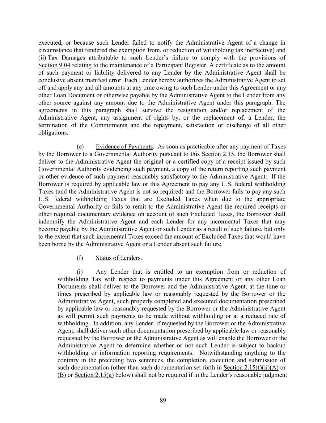 executed, or because such Lender failed to notify the Administrative Agent of a change in circumstance that rendered the exemption from, or reduction of withholding tax ineffective) and (ii) Tax Damages attributable to such Lender’s failure to comply with the provisions of Section 9.04 relating to the maintenance of a Participant Register. A certificate as to the amount of such payment or liability delivered to any Lender by the Administrative Agent shall be conclusive absent manifest error. Each Lender hereby authorizes the Administrative Agent to set off and apply any and all amounts at any time owing to such Lender under this Agreement or any other Loan Document or otherwise payable by the Administrative Agent to the Lender from any other source against any amount due to the Administrative Agent under this paragraph. The agreements in this paragraph shall survive the resignation and/or replacement of the Administrative Agent, any assignment of rights by, or the replacement of, a Lender, the termination of the Commitments and the repayment, satisfaction or discharge of all other obligations. (e) Evidence of Payments. As soon as practicable after any payment of Taxes by the Borrower to a Governmental Authority pursuant to this Section 2.15, the Borrower shall deliver to the Administrative Agent the original or a certified copy of a receipt issued by such Governmental Authority evidencing such payment, a copy of the return reporting such payment or other evidence of such payment reasonably satisfactory to the Administrative Agent. If the Borrower is required by applicable law or this Agreement to pay any U.S. federal withholding Taxes (and the Administrative Agent is not so required) and the Borrower fails to pay any such U.S. federal withholding Taxes that are Excluded Taxes when due to the appropriate Governmental Authority or fails to remit to the Administrative Agent the required receipts or other required documentary evidence on account of such Excluded Taxes, the Borrower shall indemnify the Administrative Agent and each Lender for any incremental Taxes that may become payable by the Administrative Agent or such Lender as a result of such failure, but only to the extent that such incremental Taxes exceed the amount of Excluded Taxes that would have been borne by the Administrative Agent or a Lender absent such failure. (f) Status of Lenders. (i) Any Lender that is entitled to an exemption from or reduction of withholding Tax with respect to payments under this Agreement or any other Loan Documents shall deliver to the Borrower and the Administrative Agent, at the time or times prescribed by applicable law or reasonably requested by the Borrower or the Administrative Agent, such properly completed and executed documentation prescribed by applicable law or reasonably requested by the Borrower or the Administrative Agent as will permit such payments to be made without withholding or at a reduced rate of withholding. In addition, any Lender, if requested by the Borrower or the Administrative Agent, shall deliver such other documentation prescribed by applicable law or reasonably requested by the Borrower or the Administrative Agent as will enable the Borrower or the Administrative Agent to determine whether or not such Lender is subject to backup withholding or information reporting requirements. Notwithstanding anything to the contrary in the preceding two sentences, the completion, execution and submission of such documentation (other than such documentation set forth in Section 2.15(f)(ii)(A) or (B) or Section 2.15(g) below) shall not be required if in the Lender’s reasonable judgment 89
