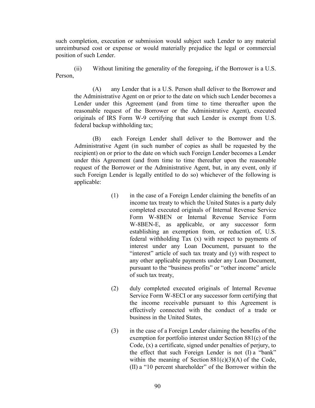such completion, execution or submission would subject such Lender to any material unreimbursed cost or expense or would materially prejudice the legal or commercial position of such Lender. (ii) Without limiting the generality of the foregoing, if the Borrower is a U.S. Person, (A) any Lender that is a U.S. Person shall deliver to the Borrower and the Administrative Agent on or prior to the date on which such Lender becomes a Lender under this Agreement (and from time to time thereafter upon the reasonable request of the Borrower or the Administrative Agent), executed originals of IRS Form W-9 certifying that such Lender is exempt from U.S. federal backup withholding tax; (B) each Foreign Lender shall deliver to the Borrower and the Administrative Agent (in such number of copies as shall be requested by the recipient) on or prior to the date on which such Foreign Lender becomes a Lender under this Agreement (and from time to time thereafter upon the reasonable request of the Borrower or the Administrative Agent, but, in any event, only if such Foreign Lender is legally entitled to do so) whichever of the following is applicable: (1) in the case of a Foreign Lender claiming the benefits of an income tax treaty to which the United States is a party duly completed executed originals of Internal Revenue Service Form W-8BEN or Internal Revenue Service Form W-8BEN-E, as applicable, or any successor form establishing an exemption from, or reduction of, U.S. federal withholding Tax (x) with respect to payments of interest under any Loan Document, pursuant to the “interest” article of such tax treaty and (y) with respect to any other applicable payments under any Loan Document, pursuant to the “business profits” or “other income” article of such tax treaty, (2) duly completed executed originals of Internal Revenue Service Form W-8ECI or any successor form certifying that the income receivable pursuant to this Agreement is effectively connected with the conduct of a trade or business in the United States, (3) in the case of a Foreign Lender claiming the benefits of the exemption for portfolio interest under Section 881(c) of the Code, (x) a certificate, signed under penalties of perjury, to the effect that such Foreign Lender is not (I) a “bank” within the meaning of Section 881(c)(3)(A) of the Code, (II) a “10 percent shareholder” of the Borrower within the 90