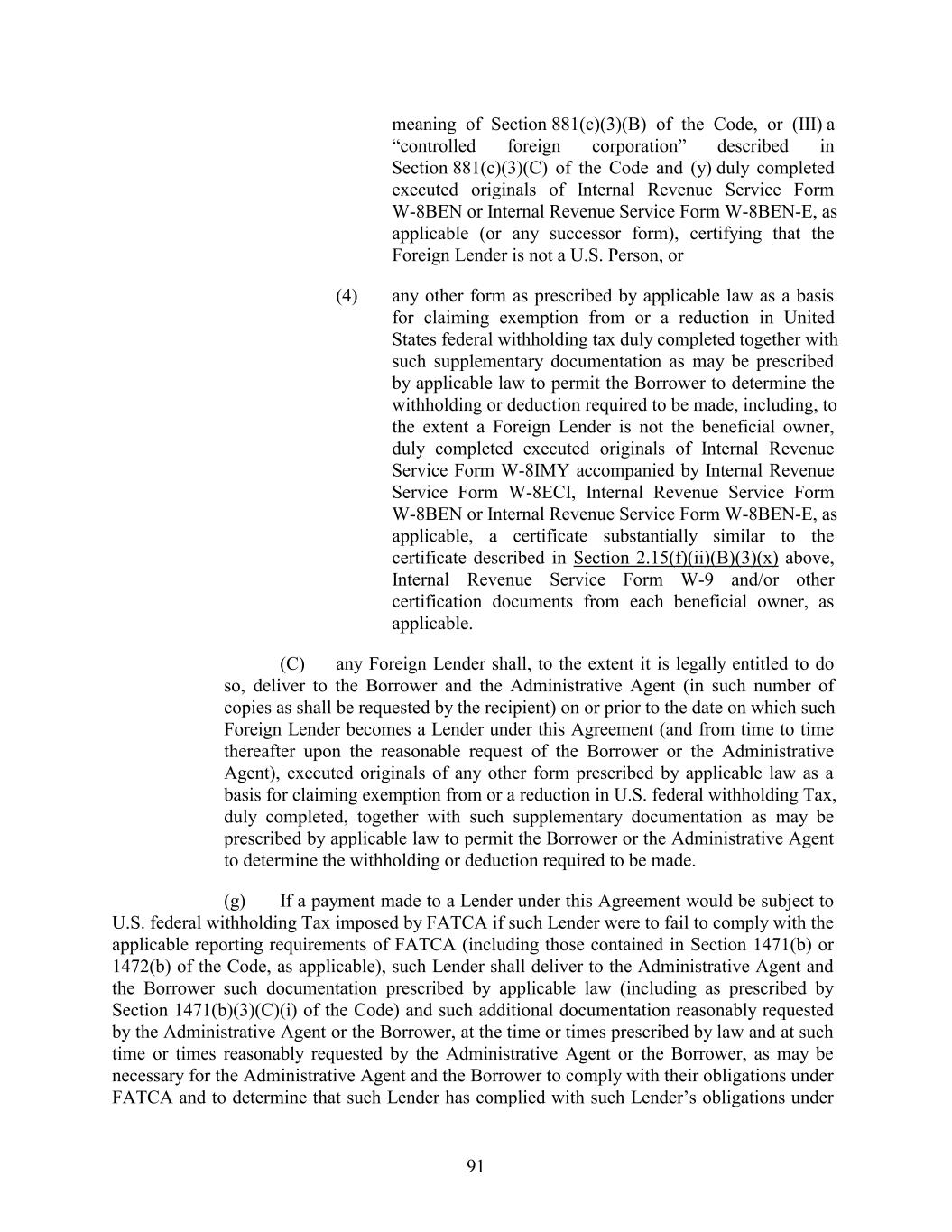 meaning of Section 881(c)(3)(B) of the Code, or (III) a “controlled foreign corporation” described in Section 881(c)(3)(C) of the Code and (y) duly completed executed originals of Internal Revenue Service Form W-8BEN or Internal Revenue Service Form W-8BEN-E, as applicable (or any successor form), certifying that the Foreign Lender is not a U.S. Person, or (4) any other form as prescribed by applicable law as a basis for claiming exemption from or a reduction in United States federal withholding tax duly completed together with such supplementary documentation as may be prescribed by applicable law to permit the Borrower to determine the withholding or deduction required to be made, including, to the extent a Foreign Lender is not the beneficial owner, duly completed executed originals of Internal Revenue Service Form W-8IMY accompanied by Internal Revenue Service Form W-8ECI, Internal Revenue Service Form W-8BEN or Internal Revenue Service Form W-8BEN-E, as applicable, a certificate substantially similar to the certificate described in Section 2.15(f)(ii)(B)(3)(x) above, Internal Revenue Service Form W-9 and/or other certification documents from each beneficial owner, as applicable. (C) any Foreign Lender shall, to the extent it is legally entitled to do so, deliver to the Borrower and the Administrative Agent (in such number of copies as shall be requested by the recipient) on or prior to the date on which such Foreign Lender becomes a Lender under this Agreement (and from time to time thereafter upon the reasonable request of the Borrower or the Administrative Agent), executed originals of any other form prescribed by applicable law as a basis for claiming exemption from or a reduction in U.S. federal withholding Tax, duly completed, together with such supplementary documentation as may be prescribed by applicable law to permit the Borrower or the Administrative Agent to determine the withholding or deduction required to be made. (g) If a payment made to a Lender under this Agreement would be subject to U.S. federal withholding Tax imposed by FATCA if such Lender were to fail to comply with the applicable reporting requirements of FATCA (including those contained in Section 1471(b) or 1472(b) of the Code, as applicable), such Lender shall deliver to the Administrative Agent and the Borrower such documentation prescribed by applicable law (including as prescribed by Section 1471(b)(3)(C)(i) of the Code) and such additional documentation reasonably requested by the Administrative Agent or the Borrower, at the time or times prescribed by law and at such time or times reasonably requested by the Administrative Agent or the Borrower, as may be necessary for the Administrative Agent and the Borrower to comply with their obligations under FATCA and to determine that such Lender has complied with such Lender’s obligations under 91
