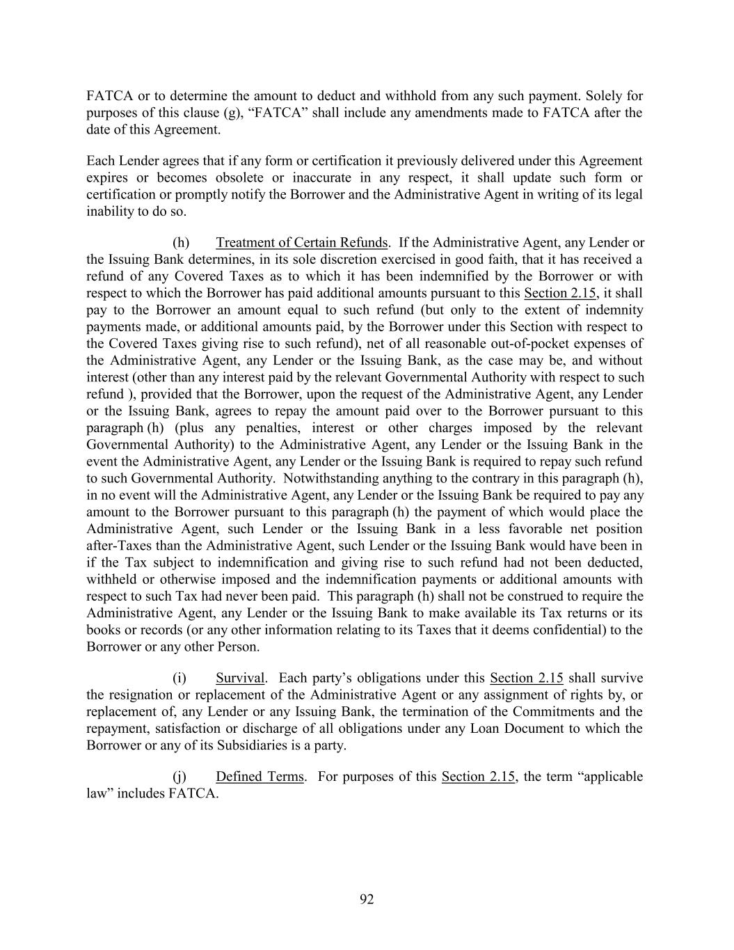 FATCA or to determine the amount to deduct and withhold from any such payment. Solely for purposes of this clause (g), “FATCA” shall include any amendments made to FATCA after the date of this Agreement. Each Lender agrees that if any form or certification it previously delivered under this Agreement expires or becomes obsolete or inaccurate in any respect, it shall update such form or certification or promptly notify the Borrower and the Administrative Agent in writing of its legal inability to do so. (h) Treatment of Certain Refunds. If the Administrative Agent, any Lender or the Issuing Bank determines, in its sole discretion exercised in good faith, that it has received a refund of any Covered Taxes as to which it has been indemnified by the Borrower or with respect to which the Borrower has paid additional amounts pursuant to this Section 2.15, it shall pay to the Borrower an amount equal to such refund (but only to the extent of indemnity payments made, or additional amounts paid, by the Borrower under this Section with respect to the Covered Taxes giving rise to such refund), net of all reasonable out-of-pocket expenses of the Administrative Agent, any Lender or the Issuing Bank, as the case may be, and without interest (other than any interest paid by the relevant Governmental Authority with respect to such refund ), provided that the Borrower, upon the request of the Administrative Agent, any Lender or the Issuing Bank, agrees to repay the amount paid over to the Borrower pursuant to this paragraph (h) (plus any penalties, interest or other charges imposed by the relevant Governmental Authority) to the Administrative Agent, any Lender or the Issuing Bank in the event the Administrative Agent, any Lender or the Issuing Bank is required to repay such refund to such Governmental Authority. Notwithstanding anything to the contrary in this paragraph (h), in no event will the Administrative Agent, any Lender or the Issuing Bank be required to pay any amount to the Borrower pursuant to this paragraph (h) the payment of which would place the Administrative Agent, such Lender or the Issuing Bank in a less favorable net position after-Taxes than the Administrative Agent, such Lender or the Issuing Bank would have been in if the Tax subject to indemnification and giving rise to such refund had not been deducted, withheld or otherwise imposed and the indemnification payments or additional amounts with respect to such Tax had never been paid. This paragraph (h) shall not be construed to require the Administrative Agent, any Lender or the Issuing Bank to make available its Tax returns or its books or records (or any other information relating to its Taxes that it deems confidential) to the Borrower or any other Person. (i) Survival. Each party’s obligations under this Section 2.15 shall survive the resignation or replacement of the Administrative Agent or any assignment of rights by, or replacement of, any Lender or any Issuing Bank, the termination of the Commitments and the repayment, satisfaction or discharge of all obligations under any Loan Document to which the Borrower or any of its Subsidiaries is a party. (j) Defined Terms. For purposes of this Section 2.15, the term “applicable law” includes FATCA. 92