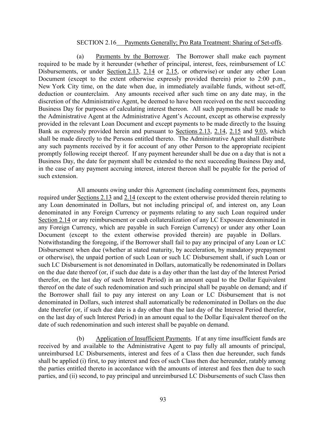 SECTION 2.16 Payments Generally; Pro Rata Treatment: Sharing of Set-offs. (a) Payments by the Borrower. The Borrower shall make each payment required to be made by it hereunder (whether of principal, interest, fees, reimbursement of LC Disbursements, or under Section 2.13, 2.14 or 2.15, or otherwise) or under any other Loan Document (except to the extent otherwise expressly provided therein) prior to 2:00 p.m., New York City time, on the date when due, in immediately available funds, without set-off, deduction or counterclaim. Any amounts received after such time on any date may, in the discretion of the Administrative Agent, be deemed to have been received on the next succeeding Business Day for purposes of calculating interest thereon. All such payments shall be made to the Administrative Agent at the Administrative Agent’s Account, except as otherwise expressly provided in the relevant Loan Document and except payments to be made directly to the Issuing Bank as expressly provided herein and pursuant to Sections 2.13, 2.14, 2.15 and 9.03, which shall be made directly to the Persons entitled thereto. The Administrative Agent shall distribute any such payments received by it for account of any other Person to the appropriate recipient promptly following receipt thereof. If any payment hereunder shall be due on a day that is not a Business Day, the date for payment shall be extended to the next succeeding Business Day and, in the case of any payment accruing interest, interest thereon shall be payable for the period of such extension. All amounts owing under this Agreement (including commitment fees, payments required under Sections 2.13 and 2.14 (except to the extent otherwise provided therein relating to any Loan denominated in Dollars, but not including principal of, and interest on, any Loan denominated in any Foreign Currency or payments relating to any such Loan required under Section 2.14 or any reimbursement or cash collateralization of any LC Exposure denominated in any Foreign Currency, which are payable in such Foreign Currency) or under any other Loan Document (except to the extent otherwise provided therein) are payable in Dollars. Notwithstanding the foregoing, if the Borrower shall fail to pay any principal of any Loan or LC Disbursement when due (whether at stated maturity, by acceleration, by mandatory prepayment or otherwise), the unpaid portion of such Loan or such LC Disbursement shall, if such Loan or such LC Disbursement is not denominated in Dollars, automatically be redenominated in Dollars on the due date thereof (or, if such due date is a day other than the last day of the Interest Period therefor, on the last day of such Interest Period) in an amount equal to the Dollar Equivalent thereof on the date of such redenomination and such principal shall be payable on demand; and if the Borrower shall fail to pay any interest on any Loan or LC Disbursement that is not denominated in Dollars, such interest shall automatically be redenominated in Dollars on the due date therefor (or, if such due date is a day other than the last day of the Interest Period therefor, on the last day of such Interest Period) in an amount equal to the Dollar Equivalent thereof on the date of such redenomination and such interest shall be payable on demand. (b) Application of Insufficient Payments. If at any time insufficient funds are received by and available to the Administrative Agent to pay fully all amounts of principal, unreimbursed LC Disbursements, interest and fees of a Class then due hereunder, such funds shall be applied (i) first, to pay interest and fees of such Class then due hereunder, ratably among the parties entitled thereto in accordance with the amounts of interest and fees then due to such parties, and (ii) second, to pay principal and unreimbursed LC Disbursements of such Class then 93