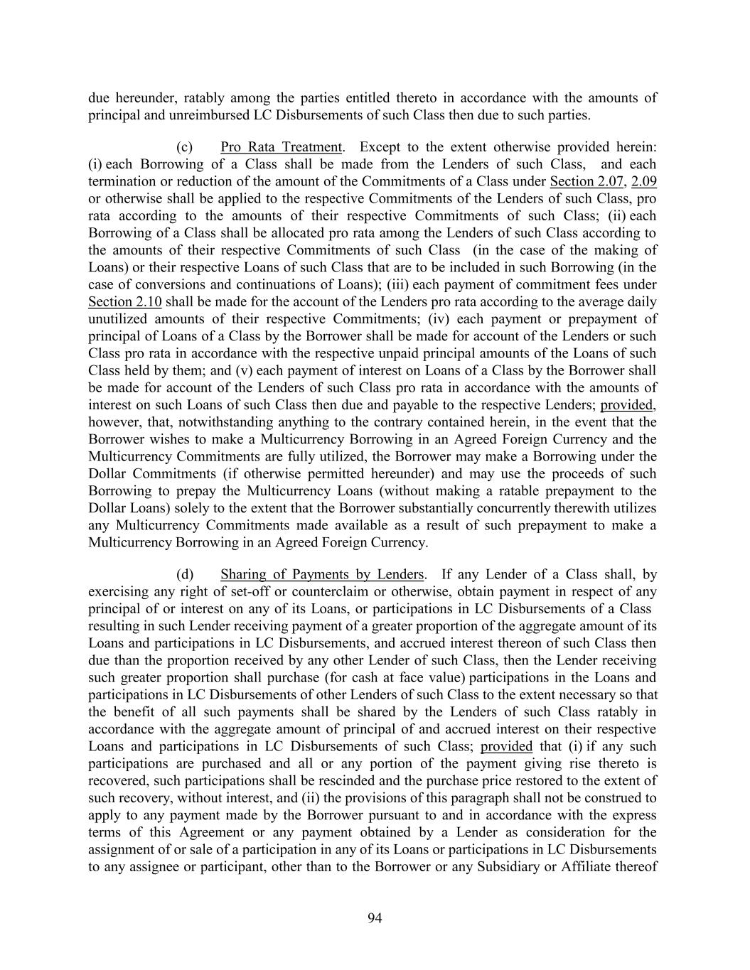 due hereunder, ratably among the parties entitled thereto in accordance with the amounts of principal and unreimbursed LC Disbursements of such Class then due to such parties. (c) Pro Rata Treatment. Except to the extent otherwise provided herein: (i) each Borrowing of a Class shall be made from the Lenders of such Class, and each termination or reduction of the amount of the Commitments of a Class under Section 2.07, 2.09 or otherwise shall be applied to the respective Commitments of the Lenders of such Class, pro rata according to the amounts of their respective Commitments of such Class; (ii) each Borrowing of a Class shall be allocated pro rata among the Lenders of such Class according to the amounts of their respective Commitments of such Class (in the case of the making of Loans) or their respective Loans of such Class that are to be included in such Borrowing (in the case of conversions and continuations of Loans); (iii) each payment of commitment fees under Section 2.10 shall be made for the account of the Lenders pro rata according to the average daily unutilized amounts of their respective Commitments; (iv) each payment or prepayment of principal of Loans of a Class by the Borrower shall be made for account of the Lenders or such Class pro rata in accordance with the respective unpaid principal amounts of the Loans of such Class held by them; and (v) each payment of interest on Loans of a Class by the Borrower shall be made for account of the Lenders of such Class pro rata in accordance with the amounts of interest on such Loans of such Class then due and payable to the respective Lenders; provided, however, that, notwithstanding anything to the contrary contained herein, in the event that the Borrower wishes to make a Multicurrency Borrowing in an Agreed Foreign Currency and the Multicurrency Commitments are fully utilized, the Borrower may make a Borrowing under the Dollar Commitments (if otherwise permitted hereunder) and may use the proceeds of such Borrowing to prepay the Multicurrency Loans (without making a ratable prepayment to the Dollar Loans) solely to the extent that the Borrower substantially concurrently therewith utilizes any Multicurrency Commitments made available as a result of such prepayment to make a Multicurrency Borrowing in an Agreed Foreign Currency. (d) Sharing of Payments by Lenders. If any Lender of a Class shall, by exercising any right of set-off or counterclaim or otherwise, obtain payment in respect of any principal of or interest on any of its Loans, or participations in LC Disbursements of a Class resulting in such Lender receiving payment of a greater proportion of the aggregate amount of its Loans and participations in LC Disbursements, and accrued interest thereon of such Class then due than the proportion received by any other Lender of such Class, then the Lender receiving such greater proportion shall purchase (for cash at face value) participations in the Loans and participations in LC Disbursements of other Lenders of such Class to the extent necessary so that the benefit of all such payments shall be shared by the Lenders of such Class ratably in accordance with the aggregate amount of principal of and accrued interest on their respective Loans and participations in LC Disbursements of such Class; provided that (i) if any such participations are purchased and all or any portion of the payment giving rise thereto is recovered, such participations shall be rescinded and the purchase price restored to the extent of such recovery, without interest, and (ii) the provisions of this paragraph shall not be construed to apply to any payment made by the Borrower pursuant to and in accordance with the express terms of this Agreement or any payment obtained by a Lender as consideration for the assignment of or sale of a participation in any of its Loans or participations in LC Disbursements to any assignee or participant, other than to the Borrower or any Subsidiary or Affiliate thereof 94