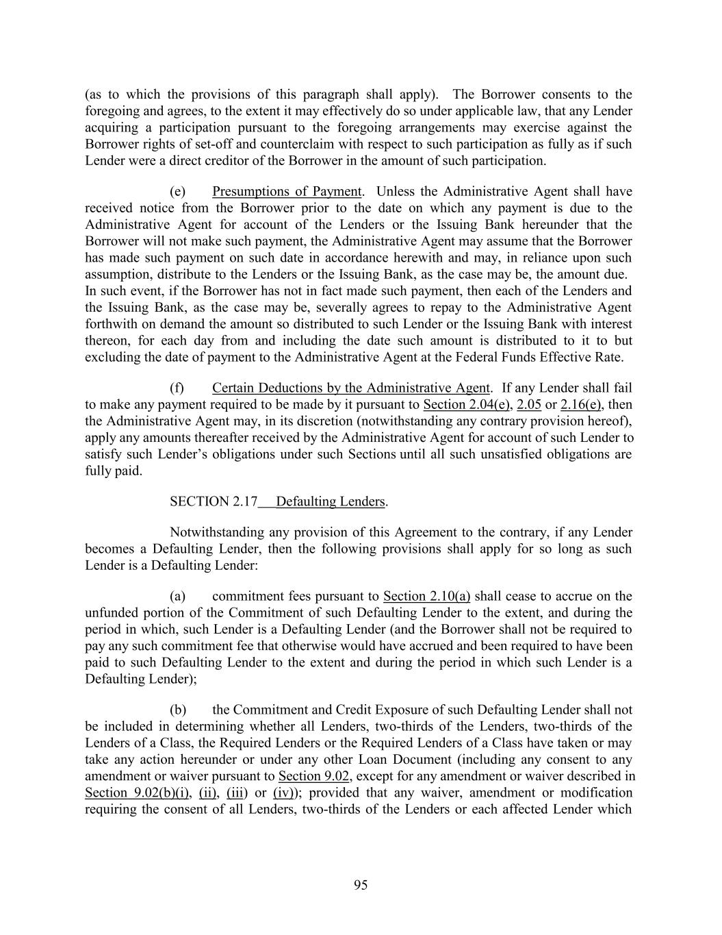 (as to which the provisions of this paragraph shall apply). The Borrower consents to the foregoing and agrees, to the extent it may effectively do so under applicable law, that any Lender acquiring a participation pursuant to the foregoing arrangements may exercise against the Borrower rights of set-off and counterclaim with respect to such participation as fully as if such Lender were a direct creditor of the Borrower in the amount of such participation. (e) Presumptions of Payment. Unless the Administrative Agent shall have received notice from the Borrower prior to the date on which any payment is due to the Administrative Agent for account of the Lenders or the Issuing Bank hereunder that the Borrower will not make such payment, the Administrative Agent may assume that the Borrower has made such payment on such date in accordance herewith and may, in reliance upon such assumption, distribute to the Lenders or the Issuing Bank, as the case may be, the amount due. In such event, if the Borrower has not in fact made such payment, then each of the Lenders and the Issuing Bank, as the case may be, severally agrees to repay to the Administrative Agent forthwith on demand the amount so distributed to such Lender or the Issuing Bank with interest thereon, for each day from and including the date such amount is distributed to it to but excluding the date of payment to the Administrative Agent at the Federal Funds Effective Rate. (f) Certain Deductions by the Administrative Agent. If any Lender shall fail to make any payment required to be made by it pursuant to Section 2.04(e), 2.05 or 2.16(e), then the Administrative Agent may, in its discretion (notwithstanding any contrary provision hereof), apply any amounts thereafter received by the Administrative Agent for account of such Lender to satisfy such Lender’s obligations under such Sections until all such unsatisfied obligations are fully paid. SECTION 2.17 Defaulting Lenders. Notwithstanding any provision of this Agreement to the contrary, if any Lender becomes a Defaulting Lender, then the following provisions shall apply for so long as such Lender is a Defaulting Lender: (a) commitment fees pursuant to Section 2.10(a) shall cease to accrue on the unfunded portion of the Commitment of such Defaulting Lender to the extent, and during the period in which, such Lender is a Defaulting Lender (and the Borrower shall not be required to pay any such commitment fee that otherwise would have accrued and been required to have been paid to such Defaulting Lender to the extent and during the period in which such Lender is a Defaulting Lender); (b) the Commitment and Credit Exposure of such Defaulting Lender shall not be included in determining whether all Lenders, two-thirds of the Lenders, two-thirds of the Lenders of a Class, the Required Lenders or the Required Lenders of a Class have taken or may take any action hereunder or under any other Loan Document (including any consent to any amendment or waiver pursuant to Section 9.02, except for any amendment or waiver described in Section 9.02(b)(i), (ii), (iii) or (iv)); provided that any waiver, amendment or modification requiring the consent of all Lenders, two-thirds of the Lenders or each affected Lender which 95