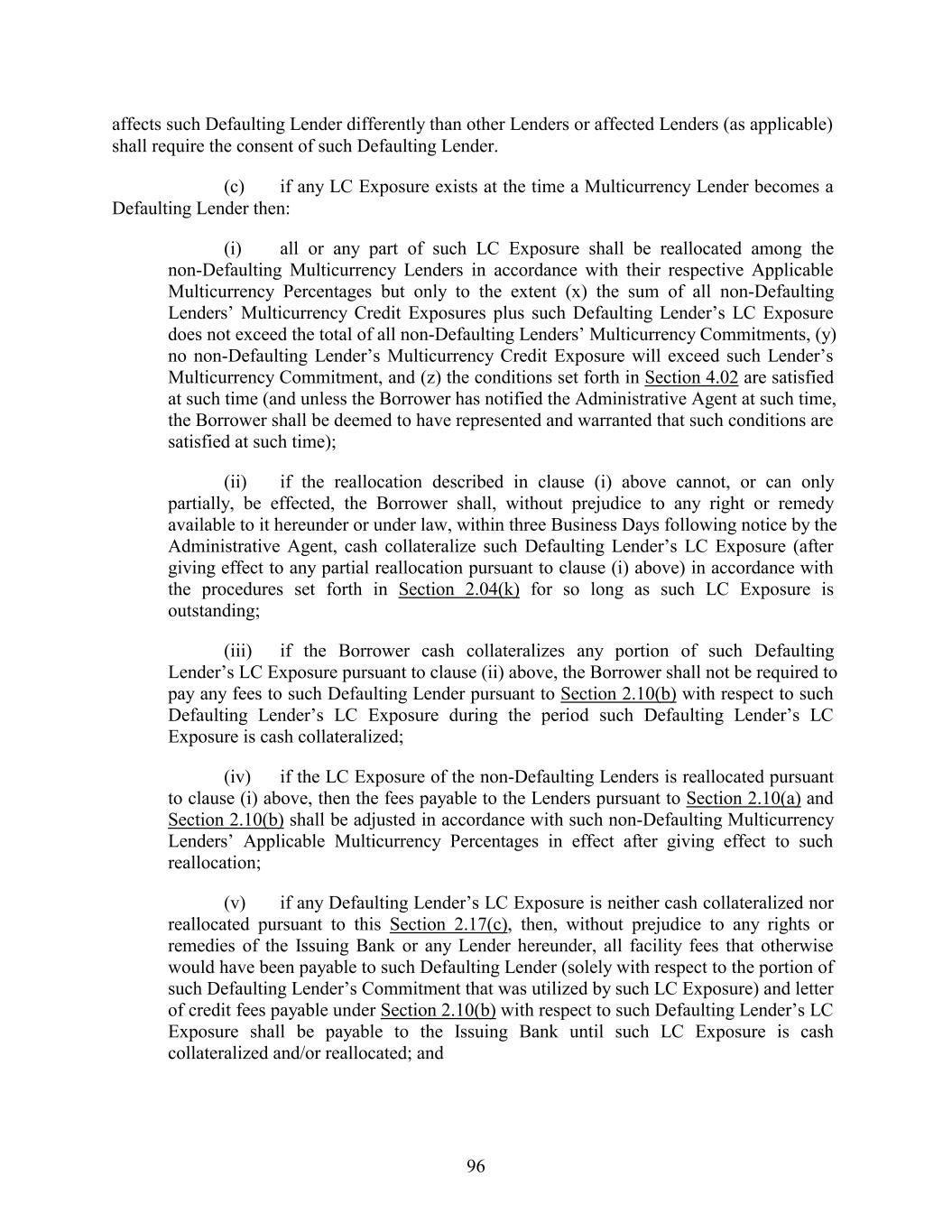 affects such Defaulting Lender differently than other Lenders or affected Lenders (as applicable) shall require the consent of such Defaulting Lender. (c) if any LC Exposure exists at the time a Multicurrency Lender becomes a Defaulting Lender then: (i) all or any part of such LC Exposure shall be reallocated among the non-Defaulting Multicurrency Lenders in accordance with their respective Applicable Multicurrency Percentages but only to the extent (x) the sum of all non-Defaulting Lenders’ Multicurrency Credit Exposures plus such Defaulting Lender’s LC Exposure does not exceed the total of all non-Defaulting Lenders’ Multicurrency Commitments, (y) no non-Defaulting Lender’s Multicurrency Credit Exposure will exceed such Lender’s Multicurrency Commitment, and (z) the conditions set forth in Section 4.02 are satisfied at such time (and unless the Borrower has notified the Administrative Agent at such time, the Borrower shall be deemed to have represented and warranted that such conditions are satisfied at such time); (ii) if the reallocation described in clause (i) above cannot, or can only partially, be effected, the Borrower shall, without prejudice to any right or remedy available to it hereunder or under law, within three Business Days following notice by the Administrative Agent, cash collateralize such Defaulting Lender’s LC Exposure (after giving effect to any partial reallocation pursuant to clause (i) above) in accordance with the procedures set forth in Section 2.04(k) for so long as such LC Exposure is outstanding; (iii) if the Borrower cash collateralizes any portion of such Defaulting Lender’s LC Exposure pursuant to clause (ii) above, the Borrower shall not be required to pay any fees to such Defaulting Lender pursuant to Section 2.10(b) with respect to such Defaulting Lender’s LC Exposure during the period such Defaulting Lender’s LC Exposure is cash collateralized; (iv) if the LC Exposure of the non-Defaulting Lenders is reallocated pursuant to clause (i) above, then the fees payable to the Lenders pursuant to Section 2.10(a) and Section 2.10(b) shall be adjusted in accordance with such non-Defaulting Multicurrency Lenders’ Applicable Multicurrency Percentages in effect after giving effect to such reallocation; (v) if any Defaulting Lender’s LC Exposure is neither cash collateralized nor reallocated pursuant to this Section 2.17(c), then, without prejudice to any rights or remedies of the Issuing Bank or any Lender hereunder, all facility fees that otherwise would have been payable to such Defaulting Lender (solely with respect to the portion of such Defaulting Lender’s Commitment that was utilized by such LC Exposure) and letter of credit fees payable under Section 2.10(b) with respect to such Defaulting Lender’s LC Exposure shall be payable to the Issuing Bank until such LC Exposure is cash collateralized and/or reallocated; and 96