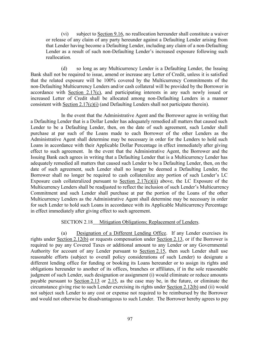 (vi) subject to Section 9.16, no reallocation hereunder shall constitute a waiver or release of any claim of any party hereunder against a Defaulting Lender arising from that Lender having become a Defaulting Lender, including any claim of a non-Defaulting Lender as a result of such non-Defaulting Lender’s increased exposure following such reallocation. (d) so long as any Multicurrency Lender is a Defaulting Lender, the Issuing Bank shall not be required to issue, amend or increase any Letter of Credit, unless it is satisfied that the related exposure will be 100% covered by the Multicurrency Commitments of the non-Defaulting Multicurrency Lenders and/or cash collateral will be provided by the Borrower in accordance with Section 2.17(c), and participating interests in any such newly issued or increased Letter of Credit shall be allocated among non-Defaulting Lenders in a manner consistent with Section 2.17(c)(i) (and Defaulting Lenders shall not participate therein). In the event that the Administrative Agent and the Borrower agree in writing that a Defaulting Lender that is a Dollar Lender has adequately remedied all matters that caused such Lender to be a Defaulting Lender, then, on the date of such agreement, such Lender shall purchase at par such of the Loans made to each Borrower of the other Lenders as the Administrative Agent shall determine may be necessary in order for the Lenders to hold such Loans in accordance with their Applicable Dollar Percentage in effect immediately after giving effect to such agreement. In the event that the Administrative Agent, the Borrower and the Issuing Bank each agrees in writing that a Defaulting Lender that is a Multicurrency Lender has adequately remedied all matters that caused such Lender to be a Defaulting Lender, then, on the date of such agreement, such Lender shall no longer be deemed a Defaulting Lender, the Borrower shall no longer be required to cash collateralize any portion of such Lender’s LC Exposure cash collateralized pursuant to Section 2.17(c)(ii) above, the LC Exposure of the Multicurrency Lenders shall be readjusted to reflect the inclusion of such Lender’s Multicurrency Commitment and such Lender shall purchase at par the portion of the Loans of the other Multicurrency Lenders as the Administrative Agent shall determine may be necessary in order for such Lender to hold such Loans in accordance with its Applicable Multicurrency Percentage in effect immediately after giving effect to such agreement. SECTION 2.18 Mitigation Obligations; Replacement of Lenders. (a) Designation of a Different Lending Office. If any Lender exercises its rights under Section 2.12(b) or requests compensation under Section 2.13, or if the Borrower is required to pay any Covered Taxes or additional amount to any Lender or any Governmental Authority for account of any Lender pursuant to Section 2.15, then such Lender shall use reasonable efforts (subject to overall policy considerations of such Lender) to designate a different lending office for funding or booking its Loans hereunder or to assign its rights and obligations hereunder to another of its offices, branches or affiliates, if in the sole reasonable judgment of such Lender, such designation or assignment (i) would eliminate or reduce amounts payable pursuant to Section 2.13 or 2.15, as the case may be, in the future, or eliminate the circumstance giving rise to such Lender exercising its rights under Section 2.12(b) and (ii) would not subject such Lender to any cost or expense not required to be reimbursed by the Borrower and would not otherwise be disadvantageous to such Lender. The Borrower hereby agrees to pay 97
