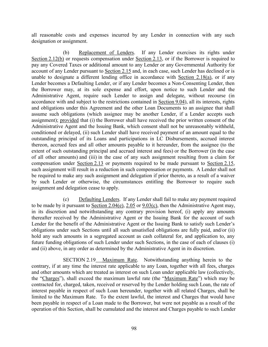 all reasonable costs and expenses incurred by any Lender in connection with any such designation or assignment. (b) Replacement of Lenders. If any Lender exercises its rights under Section 2.12(b) or requests compensation under Section 2.13, or if the Borrower is required to pay any Covered Taxes or additional amount to any Lender or any Governmental Authority for account of any Lender pursuant to Section 2.15 and, in each case, such Lender has declined or is unable to designate a different lending office in accordance with Section 2.18(a), or if any Lender becomes a Defaulting Lender, or if any Lender becomes a Non-Consenting Lender, then the Borrower may, at its sole expense and effort, upon notice to such Lender and the Administrative Agent, require such Lender to assign and delegate, without recourse (in accordance with and subject to the restrictions contained in Section 9.04), all its interests, rights and obligations under this Agreement and the other Loan Documents to an assignee that shall assume such obligations (which assignee may be another Lender, if a Lender accepts such assignment); provided that (i) the Borrower shall have received the prior written consent of the Administrative Agent and the Issuing Bank, which consent shall not be unreasonably withheld, conditioned or delayed, (ii) such Lender shall have received payment of an amount equal to the outstanding principal of its Loans and participations in LC Disbursements, accrued interest thereon, accrued fees and all other amounts payable to it hereunder, from the assignee (to the extent of such outstanding principal and accrued interest and fees) or the Borrower (in the case of all other amounts) and (iii) in the case of any such assignment resulting from a claim for compensation under Section 2.13 or payments required to be made pursuant to Section 2.15, such assignment will result in a reduction in such compensation or payments. A Lender shall not be required to make any such assignment and delegation if prior thereto, as a result of a waiver by such Lender or otherwise, the circumstances entitling the Borrower to require such assignment and delegation cease to apply. (c) Defaulting Lenders. If any Lender shall fail to make any payment required to be made by it pursuant to Section 2.04(e), 2.05 or 9.03(c), then the Administrative Agent may, in its discretion and notwithstanding any contrary provision hereof, (i) apply any amounts thereafter received by the Administrative Agent or the Issuing Bank for the account of such Lender for the benefit of the Administrative Agent or the Issuing Bank to satisfy such Lender’s obligations under such Sections until all such unsatisfied obligations are fully paid, and/or (ii) hold any such amounts in a segregated account as cash collateral for, and application to, any future funding obligations of such Lender under such Sections, in the case of each of clauses (i) and (ii) above, in any order as determined by the Administrative Agent in its discretion. SECTION 2.19 Maximum Rate. Notwithstanding anything herein to the contrary, if at any time the interest rate applicable to any Loan, together with all fees, charges and other amounts which are treated as interest on such Loan under applicable law (collectively, the “Charges”), shall exceed the maximum lawful rate (the “Maximum Rate”) which may be contracted for, charged, taken, received or reserved by the Lender holding such Loan, the rate of interest payable in respect of such Loan hereunder, together with all related Charges, shall be limited to the Maximum Rate. To the extent lawful, the interest and Charges that would have been payable in respect of a Loan made to the Borrower, but were not payable as a result of the operation of this Section, shall be cumulated and the interest and Charges payable to such Lender 98
