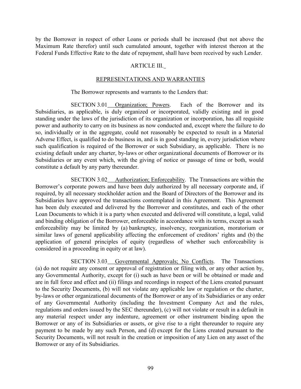by the Borrower in respect of other Loans or periods shall be increased (but not above the Maximum Rate therefor) until such cumulated amount, together with interest thereon at the Federal Funds Effective Rate to the date of repayment, shall have been received by such Lender. ARTICLE III. REPRESENTATIONS AND WARRANTIES The Borrower represents and warrants to the Lenders that: SECTION 3.01 Organization; Powers. Each of the Borrower and its Subsidiaries, as applicable, is duly organized or incorporated, validly existing and in good standing under the laws of the jurisdiction of its organization or incorporation, has all requisite power and authority to carry on its business as now conducted and, except where the failure to do so, individually or in the aggregate, could not reasonably be expected to result in a Material Adverse Effect, is qualified to do business in, and is in good standing in, every jurisdiction where such qualification is required of the Borrower or such Subsidiary, as applicable. There is no existing default under any charter, by-laws or other organizational documents of Borrower or its Subsidiaries or any event which, with the giving of notice or passage of time or both, would constitute a default by any party thereunder. SECTION 3.02 Authorization; Enforceability. The Transactions are within the Borrower’s corporate powers and have been duly authorized by all necessary corporate and, if required, by all necessary stockholder action and the Board of Directors of the Borrower and its Subsidiaries have approved the transactions contemplated in this Agreement. This Agreement has been duly executed and delivered by the Borrower and constitutes, and each of the other Loan Documents to which it is a party when executed and delivered will constitute, a legal, valid and binding obligation of the Borrower, enforceable in accordance with its terms, except as such enforceability may be limited by (a) bankruptcy, insolvency, reorganization, moratorium or similar laws of general applicability affecting the enforcement of creditors’ rights and (b) the application of general principles of equity (regardless of whether such enforceability is considered in a proceeding in equity or at law). SECTION 3.03 Governmental Approvals; No Conflicts. The Transactions (a) do not require any consent or approval of registration or filing with, or any other action by, any Governmental Authority, except for (i) such as have been or will be obtained or made and are in full force and effect and (ii) filings and recordings in respect of the Liens created pursuant to the Security Documents, (b) will not violate any applicable law or regulation or the charter, by-laws or other organizational documents of the Borrower or any of its Subsidiaries or any order of any Governmental Authority (including the Investment Company Act and the rules, regulations and orders issued by the SEC thereunder), (c) will not violate or result in a default in any material respect under any indenture, agreement or other instrument binding upon the Borrower or any of its Subsidiaries or assets, or give rise to a right thereunder to require any payment to be made by any such Person, and (d) except for the Liens created pursuant to the Security Documents, will not result in the creation or imposition of any Lien on any asset of the Borrower or any of its Subsidiaries. 99