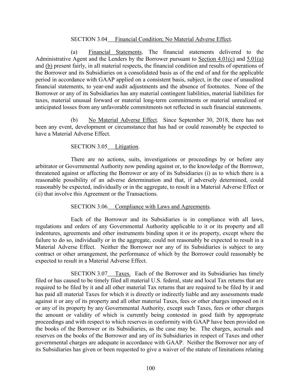 SECTION 3.04 Financial Condition; No Material Adverse Effect. (a) Financial Statements. The financial statements delivered to the Administrative Agent and the Lenders by the Borrower pursuant to Section 4.01(c) and 5.01(a) and (b) present fairly, in all material respects, the financial condition and results of operations of the Borrower and its Subsidiaries on a consolidated basis as of the end of and for the applicable period in accordance with GAAP applied on a consistent basis, subject, in the case of unaudited financial statements, to year-end audit adjustments and the absence of footnotes. None of the Borrower or any of its Subsidiaries has any material contingent liabilities, material liabilities for taxes, material unusual forward or material long-term commitments or material unrealized or anticipated losses from any unfavorable commitments not reflected in such financial statements. (b) No Material Adverse Effect. Since September 30, 2018, there has not been any event, development or circumstance that has had or could reasonably be expected to have a Material Adverse Effect. SECTION 3.05 Litigation. There are no actions, suits, investigations or proceedings by or before any arbitrator or Governmental Authority now pending against or, to the knowledge of the Borrower, threatened against or affecting the Borrower or any of its Subsidiaries (i) as to which there is a reasonable possibility of an adverse determination and that, if adversely determined, could reasonably be expected, individually or in the aggregate, to result in a Material Adverse Effect or (ii) that involve this Agreement or the Transactions. SECTION 3.06 Compliance with Laws and Agreements. Each of the Borrower and its Subsidiaries is in compliance with all laws, regulations and orders of any Governmental Authority applicable to it or its property and all indentures, agreements and other instruments binding upon it or its property, except where the failure to do so, individually or in the aggregate, could not reasonably be expected to result in a Material Adverse Effect. Neither the Borrower nor any of its Subsidiaries is subject to any contract or other arrangement, the performance of which by the Borrower could reasonably be expected to result in a Material Adverse Effect. SECTION 3.07 Taxes. Each of the Borrower and its Subsidiaries has timely filed or has caused to be timely filed all material U.S. federal, state and local Tax returns that are required to be filed by it and all other material Tax returns that are required to be filed by it and has paid all material Taxes for which it is directly or indirectly liable and any assessments made against it or any of its property and all other material Taxes, fees or other charges imposed on it or any of its property by any Governmental Authority, except such Taxes, fees or other charges the amount or validity of which is currently being contested in good faith by appropriate proceedings and with respect to which reserves in conformity with GAAP have been provided on the books of the Borrower or its Subsidiaries, as the case may be. The charges, accruals and reserves on the books of the Borrower and any of its Subsidiaries in respect of Taxes and other governmental charges are adequate in accordance with GAAP. Neither the Borrower nor any of its Subsidiaries has given or been requested to give a waiver of the statute of limitations relating 100
