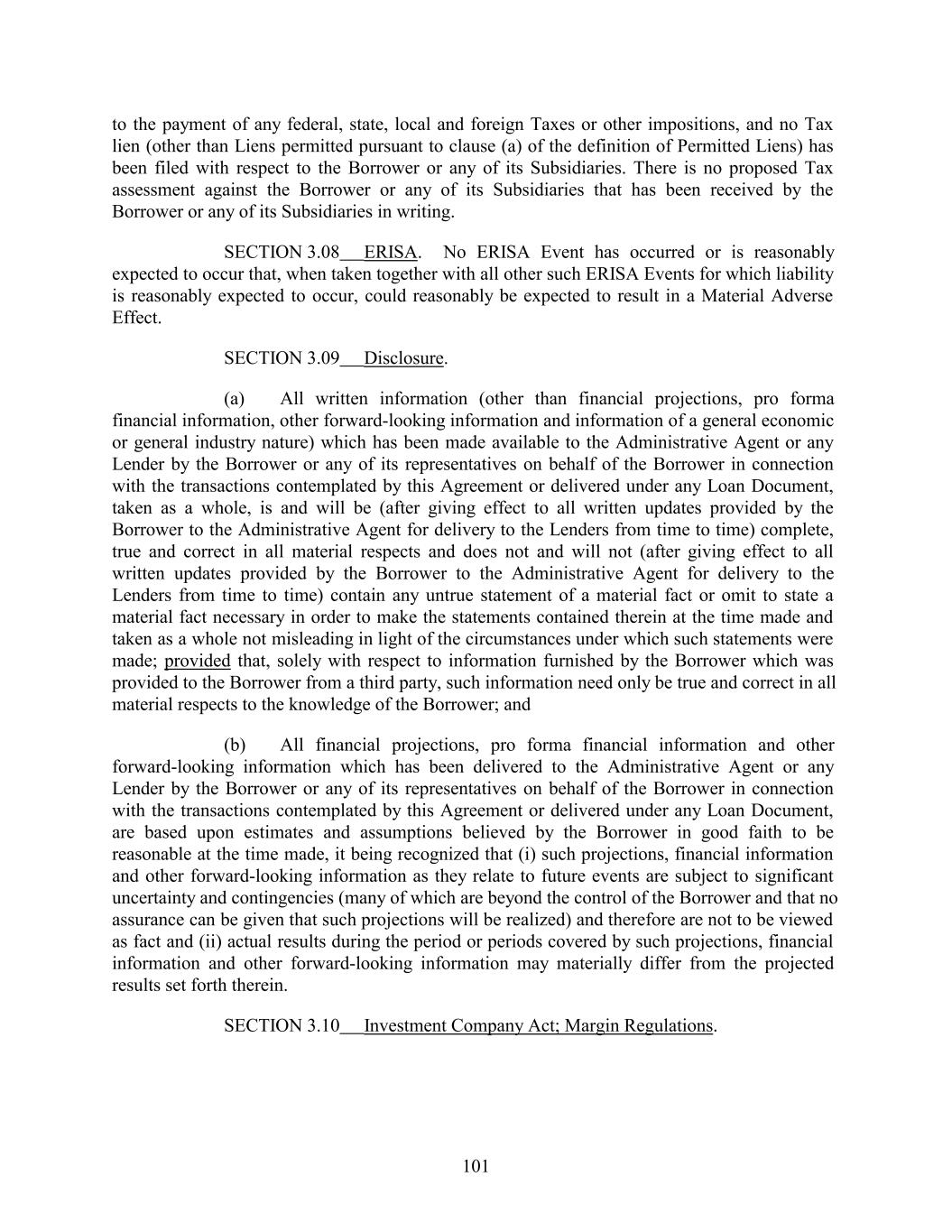 to the payment of any federal, state, local and foreign Taxes or other impositions, and no Tax lien (other than Liens permitted pursuant to clause (a) of the definition of Permitted Liens) has been filed with respect to the Borrower or any of its Subsidiaries. There is no proposed Tax assessment against the Borrower or any of its Subsidiaries that has been received by the Borrower or any of its Subsidiaries in writing. SECTION 3.08 ERISA. No ERISA Event has occurred or is reasonably expected to occur that, when taken together with all other such ERISA Events for which liability is reasonably expected to occur, could reasonably be expected to result in a Material Adverse Effect. SECTION 3.09 Disclosure. (a) All written information (other than financial projections, pro forma financial information, other forward-looking information and information of a general economic or general industry nature) which has been made available to the Administrative Agent or any Lender by the Borrower or any of its representatives on behalf of the Borrower in connection with the transactions contemplated by this Agreement or delivered under any Loan Document, taken as a whole, is and will be (after giving effect to all written updates provided by the Borrower to the Administrative Agent for delivery to the Lenders from time to time) complete, true and correct in all material respects and does not and will not (after giving effect to all written updates provided by the Borrower to the Administrative Agent for delivery to the Lenders from time to time) contain any untrue statement of a material fact or omit to state a material fact necessary in order to make the statements contained therein at the time made and taken as a whole not misleading in light of the circumstances under which such statements were made; provided that, solely with respect to information furnished by the Borrower which was provided to the Borrower from a third party, such information need only be true and correct in all material respects to the knowledge of the Borrower; and (b) All financial projections, pro forma financial information and other forward-looking information which has been delivered to the Administrative Agent or any Lender by the Borrower or any of its representatives on behalf of the Borrower in connection with the transactions contemplated by this Agreement or delivered under any Loan Document, are based upon estimates and assumptions believed by the Borrower in good faith to be reasonable at the time made, it being recognized that (i) such projections, financial information and other forward-looking information as they relate to future events are subject to significant uncertainty and contingencies (many of which are beyond the control of the Borrower and that no assurance can be given that such projections will be realized) and therefore are not to be viewed as fact and (ii) actual results during the period or periods covered by such projections, financial information and other forward-looking information may materially differ from the projected results set forth therein. SECTION 3.10 Investment Company Act; Margin Regulations. 101