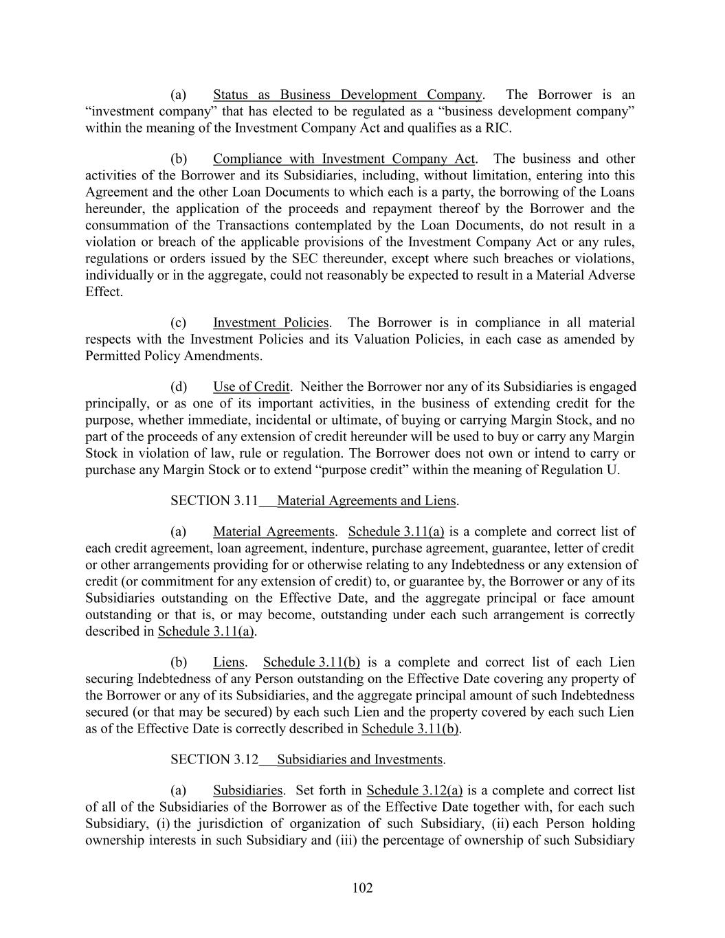(a) Status as Business Development Company. The Borrower is an “investment company” that has elected to be regulated as a “business development company” within the meaning of the Investment Company Act and qualifies as a RIC. (b) Compliance with Investment Company Act. The business and other activities of the Borrower and its Subsidiaries, including, without limitation, entering into this Agreement and the other Loan Documents to which each is a party, the borrowing of the Loans hereunder, the application of the proceeds and repayment thereof by the Borrower and the consummation of the Transactions contemplated by the Loan Documents, do not result in a violation or breach of the applicable provisions of the Investment Company Act or any rules, regulations or orders issued by the SEC thereunder, except where such breaches or violations, individually or in the aggregate, could not reasonably be expected to result in a Material Adverse Effect. (c) Investment Policies. The Borrower is in compliance in all material respects with the Investment Policies and its Valuation Policies, in each case as amended by Permitted Policy Amendments. (d) Use of Credit. Neither the Borrower nor any of its Subsidiaries is engaged principally, or as one of its important activities, in the business of extending credit for the purpose, whether immediate, incidental or ultimate, of buying or carrying Margin Stock, and no part of the proceeds of any extension of credit hereunder will be used to buy or carry any Margin Stock in violation of law, rule or regulation. The Borrower does not own or intend to carry or purchase any Margin Stock or to extend “purpose credit” within the meaning of Regulation U. SECTION 3.11 Material Agreements and Liens. (a) Material Agreements. Schedule 3.11(a) is a complete and correct list of each credit agreement, loan agreement, indenture, purchase agreement, guarantee, letter of credit or other arrangements providing for or otherwise relating to any Indebtedness or any extension of credit (or commitment for any extension of credit) to, or guarantee by, the Borrower or any of its Subsidiaries outstanding on the Effective Date, and the aggregate principal or face amount outstanding or that is, or may become, outstanding under each such arrangement is correctly described in Schedule 3.11(a). (b) Liens. Schedule 3.11(b) is a complete and correct list of each Lien securing Indebtedness of any Person outstanding on the Effective Date covering any property of the Borrower or any of its Subsidiaries, and the aggregate principal amount of such Indebtedness secured (or that may be secured) by each such Lien and the property covered by each such Lien as of the Effective Date is correctly described in Schedule 3.11(b). SECTION 3.12 Subsidiaries and Investments. (a) Subsidiaries. Set forth in Schedule 3.12(a) is a complete and correct list of all of the Subsidiaries of the Borrower as of the Effective Date together with, for each such Subsidiary, (i) the jurisdiction of organization of such Subsidiary, (ii) each Person holding ownership interests in such Subsidiary and (iii) the percentage of ownership of such Subsidiary 102