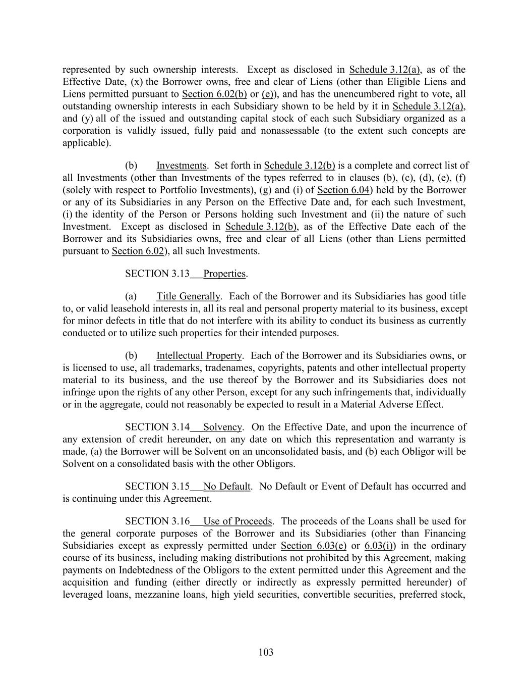 represented by such ownership interests. Except as disclosed in Schedule 3.12(a), as of the Effective Date, (x) the Borrower owns, free and clear of Liens (other than Eligible Liens and Liens permitted pursuant to Section 6.02(b) or (e)), and has the unencumbered right to vote, all outstanding ownership interests in each Subsidiary shown to be held by it in Schedule 3.12(a), and (y) all of the issued and outstanding capital stock of each such Subsidiary organized as a corporation is validly issued, fully paid and nonassessable (to the extent such concepts are applicable). (b) Investments. Set forth in Schedule 3.12(b) is a complete and correct list of all Investments (other than Investments of the types referred to in clauses (b), (c), (d), (e), (f) (solely with respect to Portfolio Investments), (g) and (i) of Section 6.04) held by the Borrower or any of its Subsidiaries in any Person on the Effective Date and, for each such Investment, (i) the identity of the Person or Persons holding such Investment and (ii) the nature of such Investment. Except as disclosed in Schedule 3.12(b), as of the Effective Date each of the Borrower and its Subsidiaries owns, free and clear of all Liens (other than Liens permitted pursuant to Section 6.02), all such Investments. SECTION 3.13 Properties. (a) Title Generally. Each of the Borrower and its Subsidiaries has good title to, or valid leasehold interests in, all its real and personal property material to its business, except for minor defects in title that do not interfere with its ability to conduct its business as currently conducted or to utilize such properties for their intended purposes. (b) Intellectual Property. Each of the Borrower and its Subsidiaries owns, or is licensed to use, all trademarks, tradenames, copyrights, patents and other intellectual property material to its business, and the use thereof by the Borrower and its Subsidiaries does not infringe upon the rights of any other Person, except for any such infringements that, individually or in the aggregate, could not reasonably be expected to result in a Material Adverse Effect. SECTION 3.14 Solvency. On the Effective Date, and upon the incurrence of any extension of credit hereunder, on any date on which this representation and warranty is made, (a) the Borrower will be Solvent on an unconsolidated basis, and (b) each Obligor will be Solvent on a consolidated basis with the other Obligors. SECTION 3.15 No Default. No Default or Event of Default has occurred and is continuing under this Agreement. SECTION 3.16 Use of Proceeds. The proceeds of the Loans shall be used for the general corporate purposes of the Borrower and its Subsidiaries (other than Financing Subsidiaries except as expressly permitted under Section 6.03(e) or 6.03(i)) in the ordinary course of its business, including making distributions not prohibited by this Agreement, making payments on Indebtedness of the Obligors to the extent permitted under this Agreement and the acquisition and funding (either directly or indirectly as expressly permitted hereunder) of leveraged loans, mezzanine loans, high yield securities, convertible securities, preferred stock, 103