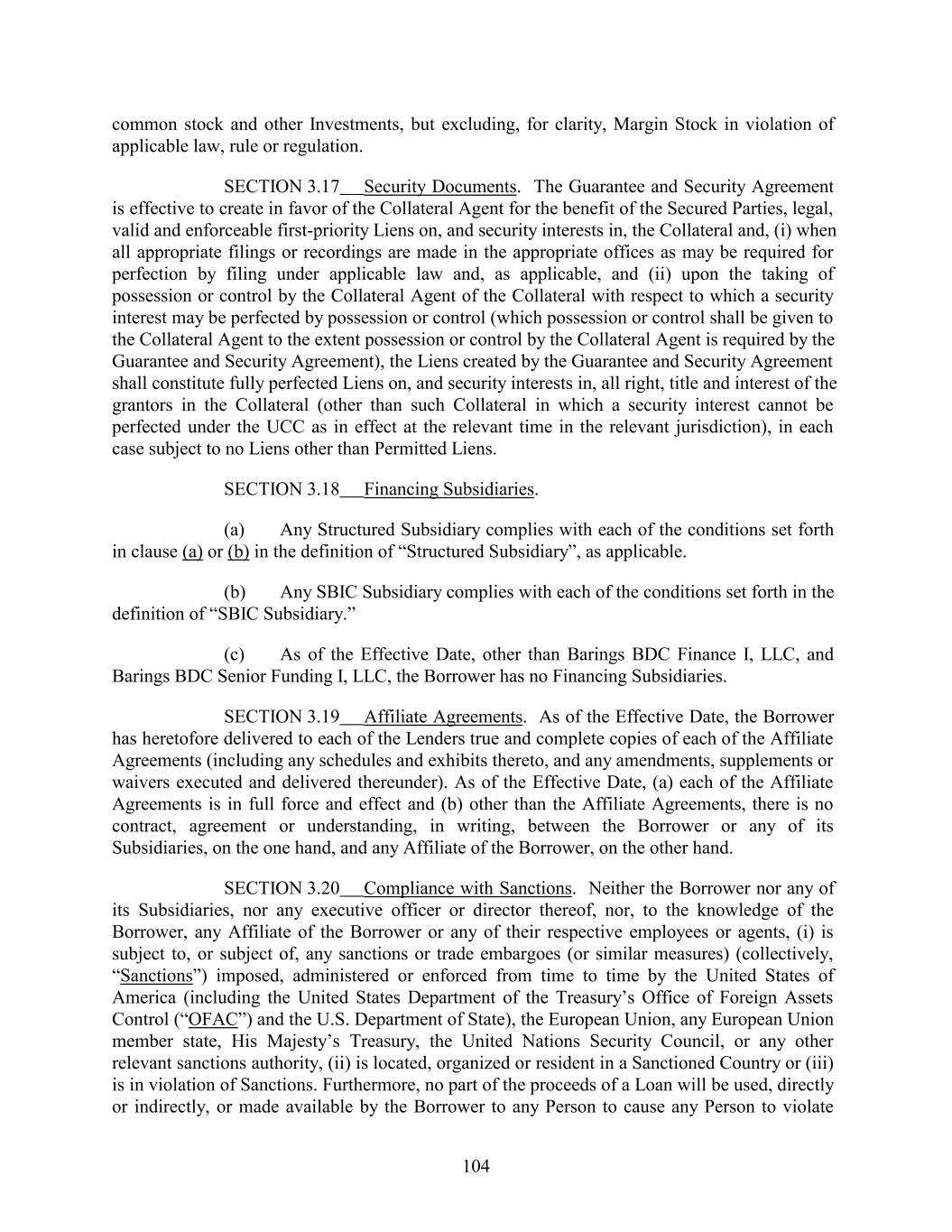 common stock and other Investments, but excluding, for clarity, Margin Stock in violation of applicable law, rule or regulation. SECTION 3.17 Security Documents. The Guarantee and Security Agreement is effective to create in favor of the Collateral Agent for the benefit of the Secured Parties, legal, valid and enforceable first-priority Liens on, and security interests in, the Collateral and, (i) when all appropriate filings or recordings are made in the appropriate offices as may be required for perfection by filing under applicable law and, as applicable, and (ii) upon the taking of possession or control by the Collateral Agent of the Collateral with respect to which a security interest may be perfected by possession or control (which possession or control shall be given to the Collateral Agent to the extent possession or control by the Collateral Agent is required by the Guarantee and Security Agreement), the Liens created by the Guarantee and Security Agreement shall constitute fully perfected Liens on, and security interests in, all right, title and interest of the grantors in the Collateral (other than such Collateral in which a security interest cannot be perfected under the UCC as in effect at the relevant time in the relevant jurisdiction), in each case subject to no Liens other than Permitted Liens. SECTION 3.18 Financing Subsidiaries. (a) Any Structured Subsidiary complies with each of the conditions set forth in clause (a) or (b) in the definition of “Structured Subsidiary”, as applicable. (b) Any SBIC Subsidiary complies with each of the conditions set forth in the definition of “SBIC Subsidiary.” (c) As of the Effective Date, other than Barings BDC Finance I, LLC, and Barings BDC Senior Funding I, LLC, the Borrower has no Financing Subsidiaries. SECTION 3.19 Affiliate Agreements. As of the Effective Date, the Borrower has heretofore delivered to each of the Lenders true and complete copies of each of the Affiliate Agreements (including any schedules and exhibits thereto, and any amendments, supplements or waivers executed and delivered thereunder). As of the Effective Date, (a) each of the Affiliate Agreements is in full force and effect and (b) other than the Affiliate Agreements, there is no contract, agreement or understanding, in writing, between the Borrower or any of its Subsidiaries, on the one hand, and any Affiliate of the Borrower, on the other hand. SECTION 3.20 Compliance with Sanctions. Neither the Borrower nor any of its Subsidiaries, nor any executive officer or director thereof, nor, to the knowledge of the Borrower, any Affiliate of the Borrower or any of their respective employees or agents, (i) is subject to, or subject of, any sanctions or trade embargoes (or similar measures) (collectively, “Sanctions”) imposed, administered or enforced from time to time by the United States of America (including the United States Department of the Treasury’s Office of Foreign Assets Control (“OFAC”) and the U.S. Department of State), the European Union, any European Union member state, His Majesty’s Treasury, the United Nations Security Council, or any other relevant sanctions authority, (ii) is located, organized or resident in a Sanctioned Country or (iii) is in violation of Sanctions. Furthermore, no part of the proceeds of a Loan will be used, directly or indirectly, or made available by the Borrower to any Person to cause any Person to violate 104