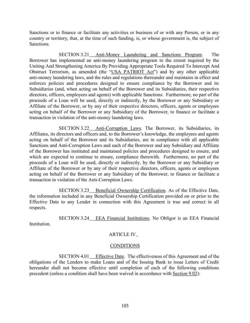 Sanctions or to finance or facilitate any activities or business of or with any Person, or in any country or territory, that, at the time of such funding, is, or whose government is, the subject of Sanctions. SECTION 3.21 Anti-Money Laundering and Sanctions Program. The Borrower has implemented an anti-money laundering program to the extent required by the Uniting And Strengthening America By Providing Appropriate Tools Required To Intercept And Obstruct Terrorism, as amended (the “USA PATRIOT Act”) and by any other applicable anti-money laundering laws, and the rules and regulations thereunder and maintains in effect and enforces policies and procedures designed to ensure compliance by the Borrower and its Subsidiaries (and, when acting on behalf of the Borrower and its Subsidiaries, their respective directors, officers, employees and agents) with applicable Sanctions. Furthermore, no part of the proceeds of a Loan will be used, directly or indirectly, by the Borrower or any Subsidiary or Affiliate of the Borrower, or by any of their respective directors, officers, agents or employees acting on behalf of the Borrower or any Subsidiary of the Borrower, to finance or facilitate a transaction in violation of the anti-money laundering laws. SECTION 3.22 Anti-Corruption Laws. The Borrower, its Subsidiaries, its Affiliates, its directors and officers and, to the Borrower’s knowledge, the employees and agents acting on behalf of the Borrower and its Subsidiaries, are in compliance with all applicable Sanctions and Anti-Corruption Laws and each of the Borrower and any Subsidiary and Affiliate of the Borrower has instituted and maintained policies and procedures designed to ensure, and which are expected to continue to ensure, compliance therewith. Furthermore, no part of the proceeds of a Loan will be used, directly or indirectly, by the Borrower or any Subsidiary or Affiliate of the Borrower or by any of their respective directors, officers, agents or employees acting on behalf of the Borrower or any Subsidiary of the Borrower, to finance or facilitate a transaction in violation of the Anti-Corruption Laws. SECTION 3.23 Beneficial Ownership Certification. As of the Effective Date, the information included in any Beneficial Ownership Certification provided on or prior to the Effective Date to any Lender in connection with this Agreement is true and correct in all respects. SECTION 3.24 EEA Financial Institutions. No Obligor is an EEA Financial Institution. ARTICLE IV. CONDITIONS SECTION 4.01 Effective Date. The effectiveness of this Agreement and of the obligations of the Lenders to make Loans and of the Issuing Bank to issue Letters of Credit hereunder shall not become effective until completion of each of the following conditions precedent (unless a condition shall have been waived in accordance with Section 9.02): 105