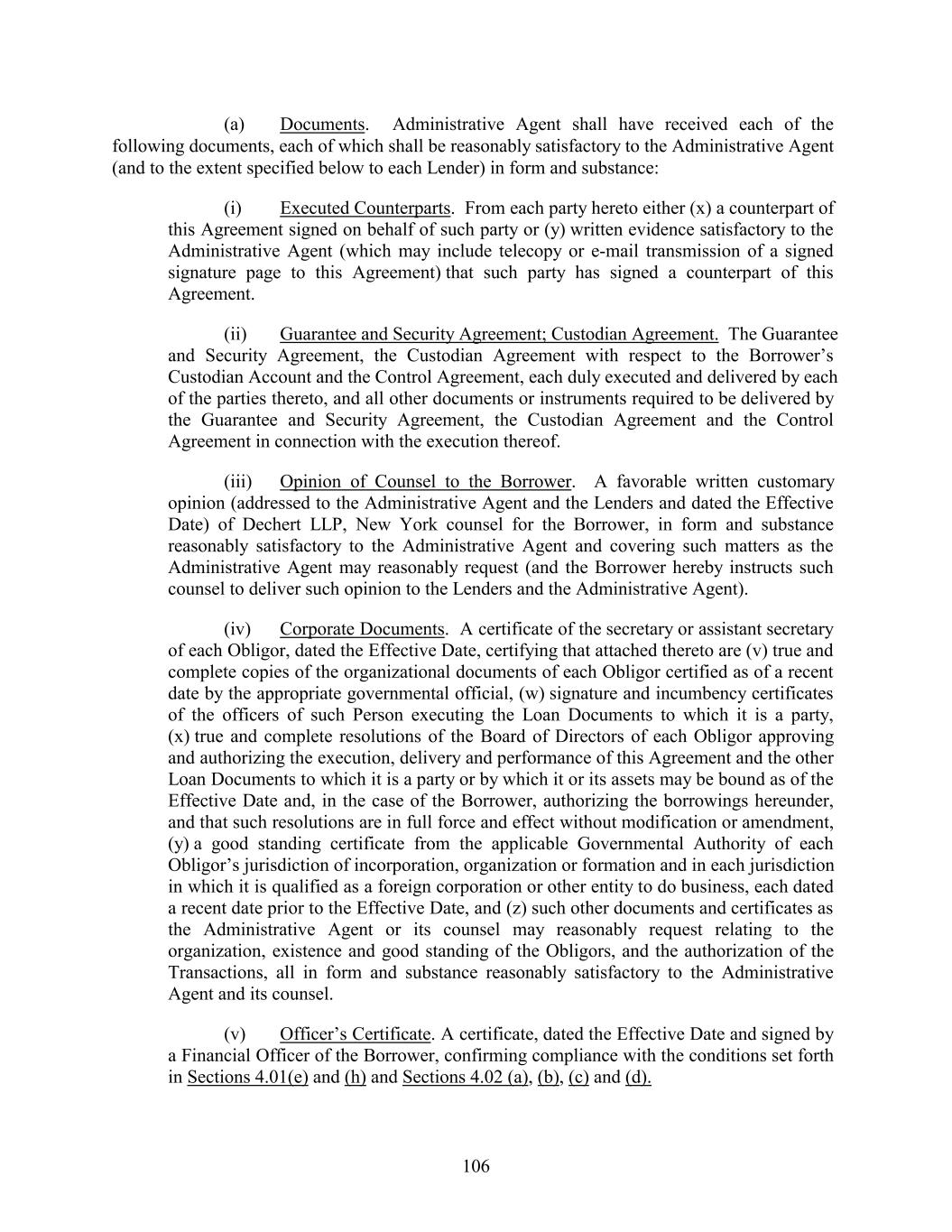 (a) Documents. Administrative Agent shall have received each of the following documents, each of which shall be reasonably satisfactory to the Administrative Agent (and to the extent specified below to each Lender) in form and substance: (i) Executed Counterparts. From each party hereto either (x) a counterpart of this Agreement signed on behalf of such party or (y) written evidence satisfactory to the Administrative Agent (which may include telecopy or e-mail transmission of a signed signature page to this Agreement) that such party has signed a counterpart of this Agreement. (ii) Guarantee and Security Agreement; Custodian Agreement. The Guarantee and Security Agreement, the Custodian Agreement with respect to the Borrower’s Custodian Account and the Control Agreement, each duly executed and delivered by each of the parties thereto, and all other documents or instruments required to be delivered by the Guarantee and Security Agreement, the Custodian Agreement and the Control Agreement in connection with the execution thereof. (iii) Opinion of Counsel to the Borrower. A favorable written customary opinion (addressed to the Administrative Agent and the Lenders and dated the Effective Date) of Dechert LLP, New York counsel for the Borrower, in form and substance reasonably satisfactory to the Administrative Agent and covering such matters as the Administrative Agent may reasonably request (and the Borrower hereby instructs such counsel to deliver such opinion to the Lenders and the Administrative Agent). (iv) Corporate Documents. A certificate of the secretary or assistant secretary of each Obligor, dated the Effective Date, certifying that attached thereto are (v) true and complete copies of the organizational documents of each Obligor certified as of a recent date by the appropriate governmental official, (w) signature and incumbency certificates of the officers of such Person executing the Loan Documents to which it is a party, (x) true and complete resolutions of the Board of Directors of each Obligor approving and authorizing the execution, delivery and performance of this Agreement and the other Loan Documents to which it is a party or by which it or its assets may be bound as of the Effective Date and, in the case of the Borrower, authorizing the borrowings hereunder, and that such resolutions are in full force and effect without modification or amendment, (y) a good standing certificate from the applicable Governmental Authority of each Obligor’s jurisdiction of incorporation, organization or formation and in each jurisdiction in which it is qualified as a foreign corporation or other entity to do business, each dated a recent date prior to the Effective Date, and (z) such other documents and certificates as the Administrative Agent or its counsel may reasonably request relating to the organization, existence and good standing of the Obligors, and the authorization of the Transactions, all in form and substance reasonably satisfactory to the Administrative Agent and its counsel. (v) Officer’s Certificate. A certificate, dated the Effective Date and signed by a Financial Officer of the Borrower, confirming compliance with the conditions set forth in Sections 4.01(e) and (h) and Sections 4.02 (a), (b), (c) and (d). 106