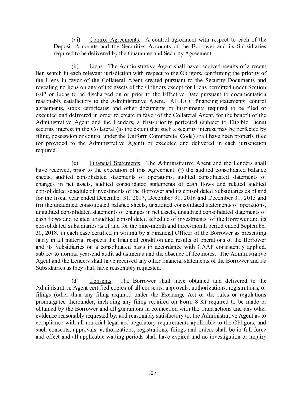 (vi) Control Agreements. A control agreement with respect to each of the Deposit Accounts and the Securities Accounts of the Borrower and its Subsidiaries required to be delivered by the Guarantee and Security Agreement. (b) Liens. The Administrative Agent shall have received results of a recent lien search in each relevant jurisdiction with respect to the Obligors, confirming the priority of the Liens in favor of the Collateral Agent created pursuant to the Security Documents and revealing no liens on any of the assets of the Obligors except for Liens permitted under Section 6.02 or Liens to be discharged on or prior to the Effective Date pursuant to documentation reasonably satisfactory to the Administrative Agent. All UCC financing statements, control agreements, stock certificates and other documents or instruments required to be filed or executed and delivered in order to create in favor of the Collateral Agent, for the benefit of the Administrative Agent and the Lenders, a first-priority perfected (subject to Eligible Liens) security interest in the Collateral (to the extent that such a security interest may be perfected by filing, possession or control under the Uniform Commercial Code) shall have been properly filed (or provided to the Administrative Agent) or executed and delivered in each jurisdiction required. (c) Financial Statements. The Administrative Agent and the Lenders shall have received, prior to the execution of this Agreement, (i) the audited consolidated balance sheets, audited consolidated statements of operations, audited consolidated statements of changes in net assets, audited consolidated statements of cash flows and related audited consolidated schedule of investments of the Borrower and its consolidated Subsidiaries as of and for the fiscal year ended December 31, 2017, December 31, 2016 and December 31, 2015 and (ii) the unaudited consolidated balance sheets, unaudited consolidated statements of operations, unaudited consolidated statements of changes in net assets, unaudited consolidated statements of cash flows and related unaudited consolidated schedule of investments of the Borrower and its consolidated Subsidiaries as of and for the nine-month and three-month period ended September 30, 2018, in each case certified in writing by a Financial Officer of the Borrower as presenting fairly in all material respects the financial condition and results of operations of the Borrower and its Subsidiaries on a consolidated basis in accordance with GAAP consistently applied, subject to normal year-end audit adjustments and the absence of footnotes. The Administrative Agent and the Lenders shall have received any other financial statements of the Borrower and its Subsidiaries as they shall have reasonably requested. (d) Consents. The Borrower shall have obtained and delivered to the Administrative Agent certified copies of all consents, approvals, authorizations, registrations, or filings (other than any filing required under the Exchange Act or the rules or regulations promulgated thereunder, including any filing required on Form 8-K) required to be made or obtained by the Borrower and all guarantors in connection with the Transactions and any other evidence reasonably requested by, and reasonably satisfactory to, the Administrative Agent as to compliance with all material legal and regulatory requirements applicable to the Obligors, and such consents, approvals, authorizations, registrations, filings and orders shall be in full force and effect and all applicable waiting periods shall have expired and no investigation or inquiry 107
