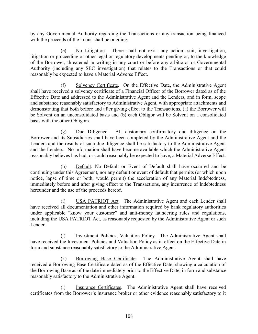 by any Governmental Authority regarding the Transactions or any transaction being financed with the proceeds of the Loans shall be ongoing. (e) No Litigation. There shall not exist any action, suit, investigation, litigation or proceeding or other legal or regulatory developments pending or, to the knowledge of the Borrower, threatened in writing in any court or before any arbitrator or Governmental Authority (including any SEC investigation) that relates to the Transactions or that could reasonably be expected to have a Material Adverse Effect. (f) Solvency Certificate. On the Effective Date, the Administrative Agent shall have received a solvency certificate of a Financial Officer of the Borrower dated as of the Effective Date and addressed to the Administrative Agent and the Lenders, and in form, scope and substance reasonably satisfactory to Administrative Agent, with appropriate attachments and demonstrating that both before and after giving effect to the Transactions, (a) the Borrower will be Solvent on an unconsolidated basis and (b) each Obligor will be Solvent on a consolidated basis with the other Obligors. (g) Due Diligence. All customary confirmatory due diligence on the Borrower and its Subsidiaries shall have been completed by the Administrative Agent and the Lenders and the results of such due diligence shall be satisfactory to the Administrative Agent and the Lenders. No information shall have become available which the Administrative Agent reasonably believes has had, or could reasonably be expected to have, a Material Adverse Effect. (h) Default. No Default or Event of Default shall have occurred and be continuing under this Agreement, nor any default or event of default that permits (or which upon notice, lapse of time or both, would permit) the acceleration of any Material Indebtedness, immediately before and after giving effect to the Transactions, any incurrence of Indebtedness hereunder and the use of the proceeds hereof. (i) USA PATRIOT Act. The Administrative Agent and each Lender shall have received all documentation and other information required by bank regulatory authorities under applicable “know your customer” and anti-money laundering rules and regulations, including the USA PATRIOT Act, as reasonably requested by the Administrative Agent or such Lender. (j) Investment Policies; Valuation Policy. The Administrative Agent shall have received the Investment Policies and Valuation Policy as in effect on the Effective Date in form and substance reasonably satisfactory to the Administrative Agent. (k) Borrowing Base Certificate. The Administrative Agent shall have received a Borrowing Base Certificate dated as of the Effective Date, showing a calculation of the Borrowing Base as of the date immediately prior to the Effective Date, in form and substance reasonably satisfactory to the Administrative Agent. (l) Insurance Certificates. The Administrative Agent shall have received certificates from the Borrower’s insurance broker or other evidence reasonably satisfactory to it 108