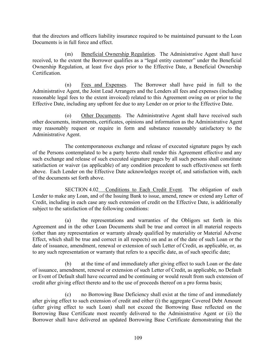 that the directors and officers liability insurance required to be maintained pursuant to the Loan Documents is in full force and effect. (m) Beneficial Ownership Regulation. The Administrative Agent shall have received, to the extent the Borrower qualifies as a “legal entity customer” under the Beneficial Ownership Regulation, at least five days prior to the Effective Date, a Beneficial Ownership Certification. (n) Fees and Expenses. The Borrower shall have paid in full to the Administrative Agent, the Joint Lead Arrangers and the Lenders all fees and expenses (including reasonable legal fees to the extent invoiced) related to this Agreement owing on or prior to the Effective Date, including any upfront fee due to any Lender on or prior to the Effective Date. (o) Other Documents. The Administrative Agent shall have received such other documents, instruments, certificates, opinions and information as the Administrative Agent may reasonably request or require in form and substance reasonably satisfactory to the Administrative Agent. The contemporaneous exchange and release of executed signature pages by each of the Persons contemplated to be a party hereto shall render this Agreement effective and any such exchange and release of such executed signature pages by all such persons shall constitute satisfaction or waiver (as applicable) of any condition precedent to such effectiveness set forth above. Each Lender on the Effective Date acknowledges receipt of, and satisfaction with, each of the documents set forth above. SECTION 4.02 Conditions to Each Credit Event. The obligation of each Lender to make any Loan, and of the Issuing Bank to issue, amend, renew or extend any Letter of Credit, including in each case any such extension of credit on the Effective Date, is additionally subject to the satisfaction of the following conditions: (a) the representations and warranties of the Obligors set forth in this Agreement and in the other Loan Documents shall be true and correct in all material respects (other than any representation or warranty already qualified by materiality or Material Adverse Effect, which shall be true and correct in all respects) on and as of the date of such Loan or the date of issuance, amendment, renewal or extension of such Letter of Credit, as applicable, or, as to any such representation or warranty that refers to a specific date, as of such specific date; (b) at the time of and immediately after giving effect to such Loan or the date of issuance, amendment, renewal or extension of such Letter of Credit, as applicable, no Default or Event of Default shall have occurred and be continuing or would result from such extension of credit after giving effect thereto and to the use of proceeds thereof on a pro forma basis; (c) no Borrowing Base Deficiency shall exist at the time of and immediately after giving effect to such extension of credit and either (i) the aggregate Covered Debt Amount (after giving effect to such Loan) shall not exceed the Borrowing Base reflected on the Borrowing Base Certificate most recently delivered to the Administrative Agent or (ii) the Borrower shall have delivered an updated Borrowing Base Certificate demonstrating that the 109