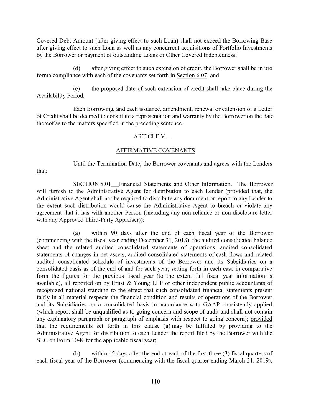 Covered Debt Amount (after giving effect to such Loan) shall not exceed the Borrowing Base after giving effect to such Loan as well as any concurrent acquisitions of Portfolio Investments by the Borrower or payment of outstanding Loans or Other Covered Indebtedness; (d) after giving effect to such extension of credit, the Borrower shall be in pro forma compliance with each of the covenants set forth in Section 6.07; and (e) the proposed date of such extension of credit shall take place during the Availability Period. Each Borrowing, and each issuance, amendment, renewal or extension of a Letter of Credit shall be deemed to constitute a representation and warranty by the Borrower on the date thereof as to the matters specified in the preceding sentence. ARTICLE V. AFFIRMATIVE COVENANTS Until the Termination Date, the Borrower covenants and agrees with the Lenders that: SECTION 5.01 Financial Statements and Other Information. The Borrower will furnish to the Administrative Agent for distribution to each Lender (provided that, the Administrative Agent shall not be required to distribute any document or report to any Lender to the extent such distribution would cause the Administrative Agent to breach or violate any agreement that it has with another Person (including any non-reliance or non-disclosure letter with any Approved Third-Party Appraiser)): (a) within 90 days after the end of each fiscal year of the Borrower (commencing with the fiscal year ending December 31, 2018), the audited consolidated balance sheet and the related audited consolidated statements of operations, audited consolidated statements of changes in net assets, audited consolidated statements of cash flows and related audited consolidated schedule of investments of the Borrower and its Subsidiaries on a consolidated basis as of the end of and for such year, setting forth in each case in comparative form the figures for the previous fiscal year (to the extent full fiscal year information is available), all reported on by Ernst & Young LLP or other independent public accountants of recognized national standing to the effect that such consolidated financial statements present fairly in all material respects the financial condition and results of operations of the Borrower and its Subsidiaries on a consolidated basis in accordance with GAAP consistently applied (which report shall be unqualified as to going concern and scope of audit and shall not contain any explanatory paragraph or paragraph of emphasis with respect to going concern); provided that the requirements set forth in this clause (a) may be fulfilled by providing to the Administrative Agent for distribution to each Lender the report filed by the Borrower with the SEC on Form 10-K for the applicable fiscal year; (b) within 45 days after the end of each of the first three (3) fiscal quarters of each fiscal year of the Borrower (commencing with the fiscal quarter ending March 31, 2019), 110