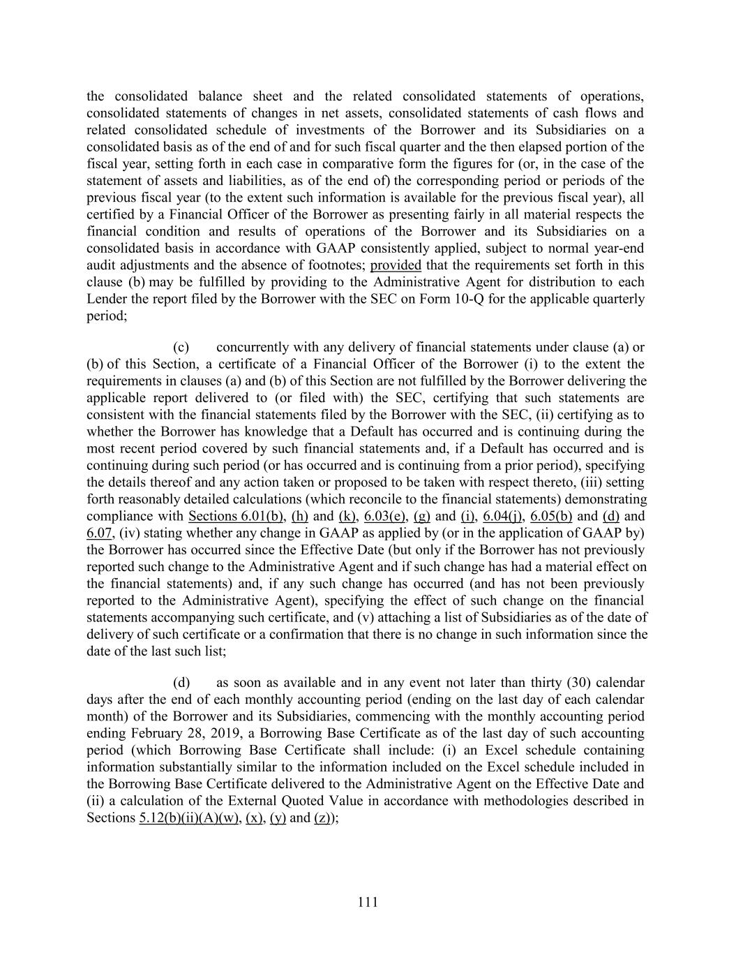 the consolidated balance sheet and the related consolidated statements of operations, consolidated statements of changes in net assets, consolidated statements of cash flows and related consolidated schedule of investments of the Borrower and its Subsidiaries on a consolidated basis as of the end of and for such fiscal quarter and the then elapsed portion of the fiscal year, setting forth in each case in comparative form the figures for (or, in the case of the statement of assets and liabilities, as of the end of) the corresponding period or periods of the previous fiscal year (to the extent such information is available for the previous fiscal year), all certified by a Financial Officer of the Borrower as presenting fairly in all material respects the financial condition and results of operations of the Borrower and its Subsidiaries on a consolidated basis in accordance with GAAP consistently applied, subject to normal year-end audit adjustments and the absence of footnotes; provided that the requirements set forth in this clause (b) may be fulfilled by providing to the Administrative Agent for distribution to each Lender the report filed by the Borrower with the SEC on Form 10-Q for the applicable quarterly period; (c) concurrently with any delivery of financial statements under clause (a) or (b) of this Section, a certificate of a Financial Officer of the Borrower (i) to the extent the requirements in clauses (a) and (b) of this Section are not fulfilled by the Borrower delivering the applicable report delivered to (or filed with) the SEC, certifying that such statements are consistent with the financial statements filed by the Borrower with the SEC, (ii) certifying as to whether the Borrower has knowledge that a Default has occurred and is continuing during the most recent period covered by such financial statements and, if a Default has occurred and is continuing during such period (or has occurred and is continuing from a prior period), specifying the details thereof and any action taken or proposed to be taken with respect thereto, (iii) setting forth reasonably detailed calculations (which reconcile to the financial statements) demonstrating compliance with Sections 6.01(b), (h) and (k), 6.03(e), (g) and (i), 6.04(j), 6.05(b) and (d) and 6.07, (iv) stating whether any change in GAAP as applied by (or in the application of GAAP by) the Borrower has occurred since the Effective Date (but only if the Borrower has not previously reported such change to the Administrative Agent and if such change has had a material effect on the financial statements) and, if any such change has occurred (and has not been previously reported to the Administrative Agent), specifying the effect of such change on the financial statements accompanying such certificate, and (v) attaching a list of Subsidiaries as of the date of delivery of such certificate or a confirmation that there is no change in such information since the date of the last such list; (d) as soon as available and in any event not later than thirty (30) calendar days after the end of each monthly accounting period (ending on the last day of each calendar month) of the Borrower and its Subsidiaries, commencing with the monthly accounting period ending February 28, 2019, a Borrowing Base Certificate as of the last day of such accounting period (which Borrowing Base Certificate shall include: (i) an Excel schedule containing information substantially similar to the information included on the Excel schedule included in the Borrowing Base Certificate delivered to the Administrative Agent on the Effective Date and (ii) a calculation of the External Quoted Value in accordance with methodologies described in Sections 5.12(b)(ii)(A)(w), (x), (y) and (z)); 111
