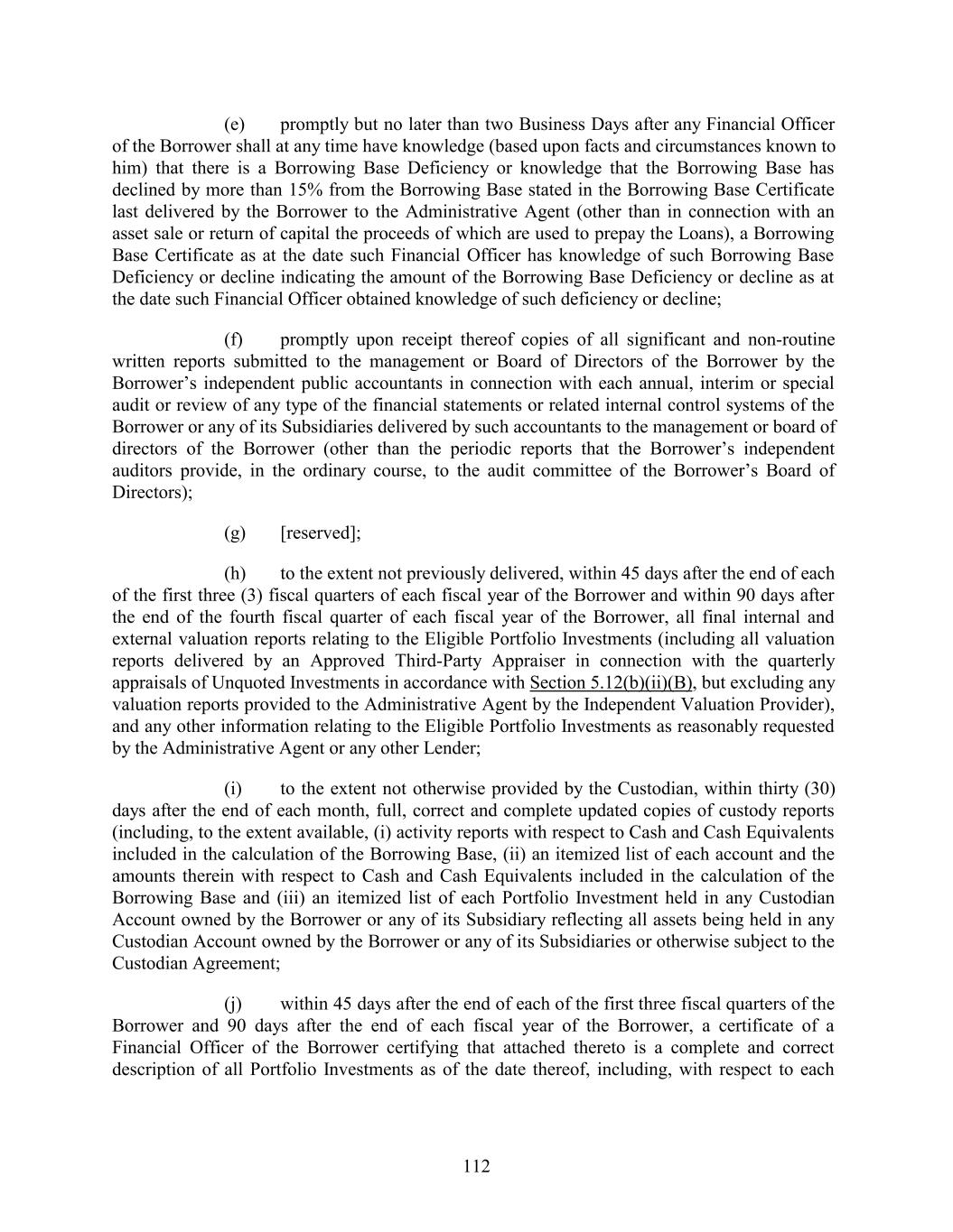 (e) promptly but no later than two Business Days after any Financial Officer of the Borrower shall at any time have knowledge (based upon facts and circumstances known to him) that there is a Borrowing Base Deficiency or knowledge that the Borrowing Base has declined by more than 15% from the Borrowing Base stated in the Borrowing Base Certificate last delivered by the Borrower to the Administrative Agent (other than in connection with an asset sale or return of capital the proceeds of which are used to prepay the Loans), a Borrowing Base Certificate as at the date such Financial Officer has knowledge of such Borrowing Base Deficiency or decline indicating the amount of the Borrowing Base Deficiency or decline as at the date such Financial Officer obtained knowledge of such deficiency or decline; (f) promptly upon receipt thereof copies of all significant and non-routine written reports submitted to the management or Board of Directors of the Borrower by the Borrower’s independent public accountants in connection with each annual, interim or special audit or review of any type of the financial statements or related internal control systems of the Borrower or any of its Subsidiaries delivered by such accountants to the management or board of directors of the Borrower (other than the periodic reports that the Borrower’s independent auditors provide, in the ordinary course, to the audit committee of the Borrower’s Board of Directors); (g) [reserved]; (h) to the extent not previously delivered, within 45 days after the end of each of the first three (3) fiscal quarters of each fiscal year of the Borrower and within 90 days after the end of the fourth fiscal quarter of each fiscal year of the Borrower, all final internal and external valuation reports relating to the Eligible Portfolio Investments (including all valuation reports delivered by an Approved Third-Party Appraiser in connection with the quarterly appraisals of Unquoted Investments in accordance with Section 5.12(b)(ii)(B), but excluding any valuation reports provided to the Administrative Agent by the Independent Valuation Provider), and any other information relating to the Eligible Portfolio Investments as reasonably requested by the Administrative Agent or any other Lender; (i) to the extent not otherwise provided by the Custodian, within thirty (30) days after the end of each month, full, correct and complete updated copies of custody reports (including, to the extent available, (i) activity reports with respect to Cash and Cash Equivalents included in the calculation of the Borrowing Base, (ii) an itemized list of each account and the amounts therein with respect to Cash and Cash Equivalents included in the calculation of the Borrowing Base and (iii) an itemized list of each Portfolio Investment held in any Custodian Account owned by the Borrower or any of its Subsidiary reflecting all assets being held in any Custodian Account owned by the Borrower or any of its Subsidiaries or otherwise subject to the Custodian Agreement; (j) within 45 days after the end of each of the first three fiscal quarters of the Borrower and 90 days after the end of each fiscal year of the Borrower, a certificate of a Financial Officer of the Borrower certifying that attached thereto is a complete and correct description of all Portfolio Investments as of the date thereof, including, with respect to each 112