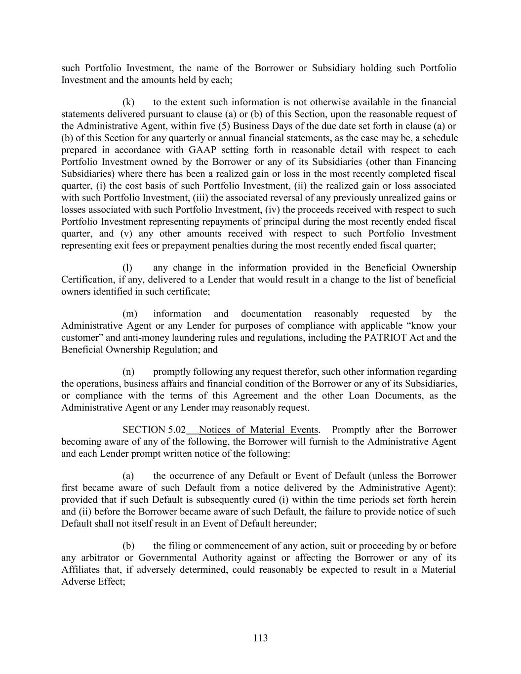 such Portfolio Investment, the name of the Borrower or Subsidiary holding such Portfolio Investment and the amounts held by each; (k) to the extent such information is not otherwise available in the financial statements delivered pursuant to clause (a) or (b) of this Section, upon the reasonable request of the Administrative Agent, within five (5) Business Days of the due date set forth in clause (a) or (b) of this Section for any quarterly or annual financial statements, as the case may be, a schedule prepared in accordance with GAAP setting forth in reasonable detail with respect to each Portfolio Investment owned by the Borrower or any of its Subsidiaries (other than Financing Subsidiaries) where there has been a realized gain or loss in the most recently completed fiscal quarter, (i) the cost basis of such Portfolio Investment, (ii) the realized gain or loss associated with such Portfolio Investment, (iii) the associated reversal of any previously unrealized gains or losses associated with such Portfolio Investment, (iv) the proceeds received with respect to such Portfolio Investment representing repayments of principal during the most recently ended fiscal quarter, and (v) any other amounts received with respect to such Portfolio Investment representing exit fees or prepayment penalties during the most recently ended fiscal quarter; (l) any change in the information provided in the Beneficial Ownership Certification, if any, delivered to a Lender that would result in a change to the list of beneficial owners identified in such certificate; (m) information and documentation reasonably requested by the Administrative Agent or any Lender for purposes of compliance with applicable “know your customer” and anti-money laundering rules and regulations, including the PATRIOT Act and the Beneficial Ownership Regulation; and (n) promptly following any request therefor, such other information regarding the operations, business affairs and financial condition of the Borrower or any of its Subsidiaries, or compliance with the terms of this Agreement and the other Loan Documents, as the Administrative Agent or any Lender may reasonably request. SECTION 5.02 Notices of Material Events. Promptly after the Borrower becoming aware of any of the following, the Borrower will furnish to the Administrative Agent and each Lender prompt written notice of the following: (a) the occurrence of any Default or Event of Default (unless the Borrower first became aware of such Default from a notice delivered by the Administrative Agent); provided that if such Default is subsequently cured (i) within the time periods set forth herein and (ii) before the Borrower became aware of such Default, the failure to provide notice of such Default shall not itself result in an Event of Default hereunder; (b) the filing or commencement of any action, suit or proceeding by or before any arbitrator or Governmental Authority against or affecting the Borrower or any of its Affiliates that, if adversely determined, could reasonably be expected to result in a Material Adverse Effect; 113