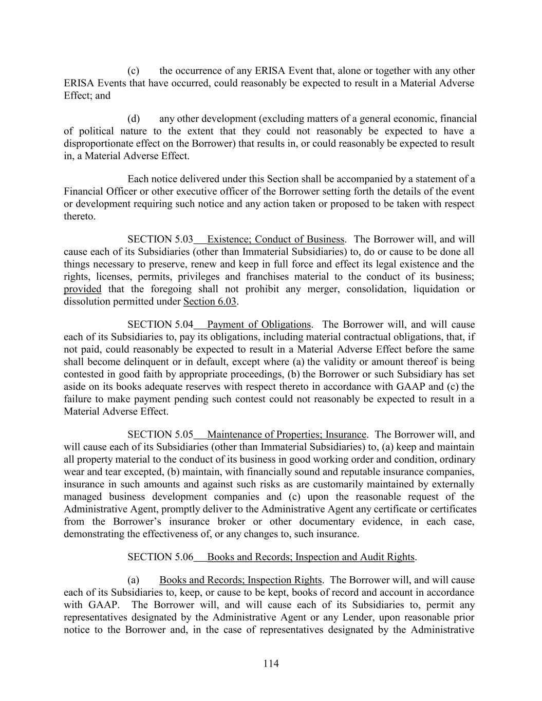 (c) the occurrence of any ERISA Event that, alone or together with any other ERISA Events that have occurred, could reasonably be expected to result in a Material Adverse Effect; and (d) any other development (excluding matters of a general economic, financial of political nature to the extent that they could not reasonably be expected to have a disproportionate effect on the Borrower) that results in, or could reasonably be expected to result in, a Material Adverse Effect. Each notice delivered under this Section shall be accompanied by a statement of a Financial Officer or other executive officer of the Borrower setting forth the details of the event or development requiring such notice and any action taken or proposed to be taken with respect thereto. SECTION 5.03 Existence; Conduct of Business. The Borrower will, and will cause each of its Subsidiaries (other than Immaterial Subsidiaries) to, do or cause to be done all things necessary to preserve, renew and keep in full force and effect its legal existence and the rights, licenses, permits, privileges and franchises material to the conduct of its business; provided that the foregoing shall not prohibit any merger, consolidation, liquidation or dissolution permitted under Section 6.03. SECTION 5.04 Payment of Obligations. The Borrower will, and will cause each of its Subsidiaries to, pay its obligations, including material contractual obligations, that, if not paid, could reasonably be expected to result in a Material Adverse Effect before the same shall become delinquent or in default, except where (a) the validity or amount thereof is being contested in good faith by appropriate proceedings, (b) the Borrower or such Subsidiary has set aside on its books adequate reserves with respect thereto in accordance with GAAP and (c) the failure to make payment pending such contest could not reasonably be expected to result in a Material Adverse Effect. SECTION 5.05 Maintenance of Properties; Insurance. The Borrower will, and will cause each of its Subsidiaries (other than Immaterial Subsidiaries) to, (a) keep and maintain all property material to the conduct of its business in good working order and condition, ordinary wear and tear excepted, (b) maintain, with financially sound and reputable insurance companies, insurance in such amounts and against such risks as are customarily maintained by externally managed business development companies and (c) upon the reasonable request of the Administrative Agent, promptly deliver to the Administrative Agent any certificate or certificates from the Borrower’s insurance broker or other documentary evidence, in each case, demonstrating the effectiveness of, or any changes to, such insurance. SECTION 5.06 Books and Records; Inspection and Audit Rights. (a) Books and Records; Inspection Rights. The Borrower will, and will cause each of its Subsidiaries to, keep, or cause to be kept, books of record and account in accordance with GAAP. The Borrower will, and will cause each of its Subsidiaries to, permit any representatives designated by the Administrative Agent or any Lender, upon reasonable prior notice to the Borrower and, in the case of representatives designated by the Administrative 114