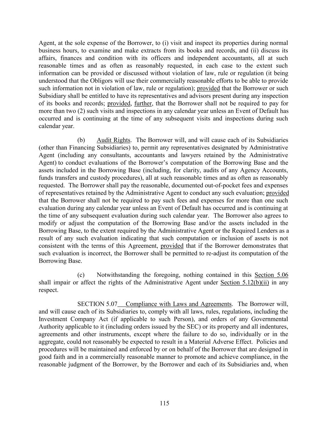 Agent, at the sole expense of the Borrower, to (i) visit and inspect its properties during normal business hours, to examine and make extracts from its books and records, and (ii) discuss its affairs, finances and condition with its officers and independent accountants, all at such reasonable times and as often as reasonably requested, in each case to the extent such information can be provided or discussed without violation of law, rule or regulation (it being understood that the Obligors will use their commercially reasonable efforts to be able to provide such information not in violation of law, rule or regulation); provided that the Borrower or such Subsidiary shall be entitled to have its representatives and advisors present during any inspection of its books and records; provided, further, that the Borrower shall not be required to pay for more than two (2) such visits and inspections in any calendar year unless an Event of Default has occurred and is continuing at the time of any subsequent visits and inspections during such calendar year. (b) Audit Rights. The Borrower will, and will cause each of its Subsidiaries (other than Financing Subsidiaries) to, permit any representatives designated by Administrative Agent (including any consultants, accountants and lawyers retained by the Administrative Agent) to conduct evaluations of the Borrower’s computation of the Borrowing Base and the assets included in the Borrowing Base (including, for clarity, audits of any Agency Accounts, funds transfers and custody procedures), all at such reasonable times and as often as reasonably requested. The Borrower shall pay the reasonable, documented out-of-pocket fees and expenses of representatives retained by the Administrative Agent to conduct any such evaluation; provided that the Borrower shall not be required to pay such fees and expenses for more than one such evaluation during any calendar year unless an Event of Default has occurred and is continuing at the time of any subsequent evaluation during such calendar year. The Borrower also agrees to modify or adjust the computation of the Borrowing Base and/or the assets included in the Borrowing Base, to the extent required by the Administrative Agent or the Required Lenders as a result of any such evaluation indicating that such computation or inclusion of assets is not consistent with the terms of this Agreement, provided that if the Borrower demonstrates that such evaluation is incorrect, the Borrower shall be permitted to re-adjust its computation of the Borrowing Base. (c) Notwithstanding the foregoing, nothing contained in this Section 5.06 shall impair or affect the rights of the Administrative Agent under Section 5.12(b)(ii) in any respect. SECTION 5.07 Compliance with Laws and Agreements. The Borrower will, and will cause each of its Subsidiaries to, comply with all laws, rules, regulations, including the Investment Company Act (if applicable to such Person), and orders of any Governmental Authority applicable to it (including orders issued by the SEC) or its property and all indentures, agreements and other instruments, except where the failure to do so, individually or in the aggregate, could not reasonably be expected to result in a Material Adverse Effect. Policies and procedures will be maintained and enforced by or on behalf of the Borrower that are designed in good faith and in a commercially reasonable manner to promote and achieve compliance, in the reasonable judgment of the Borrower, by the Borrower and each of its Subsidiaries and, when 115