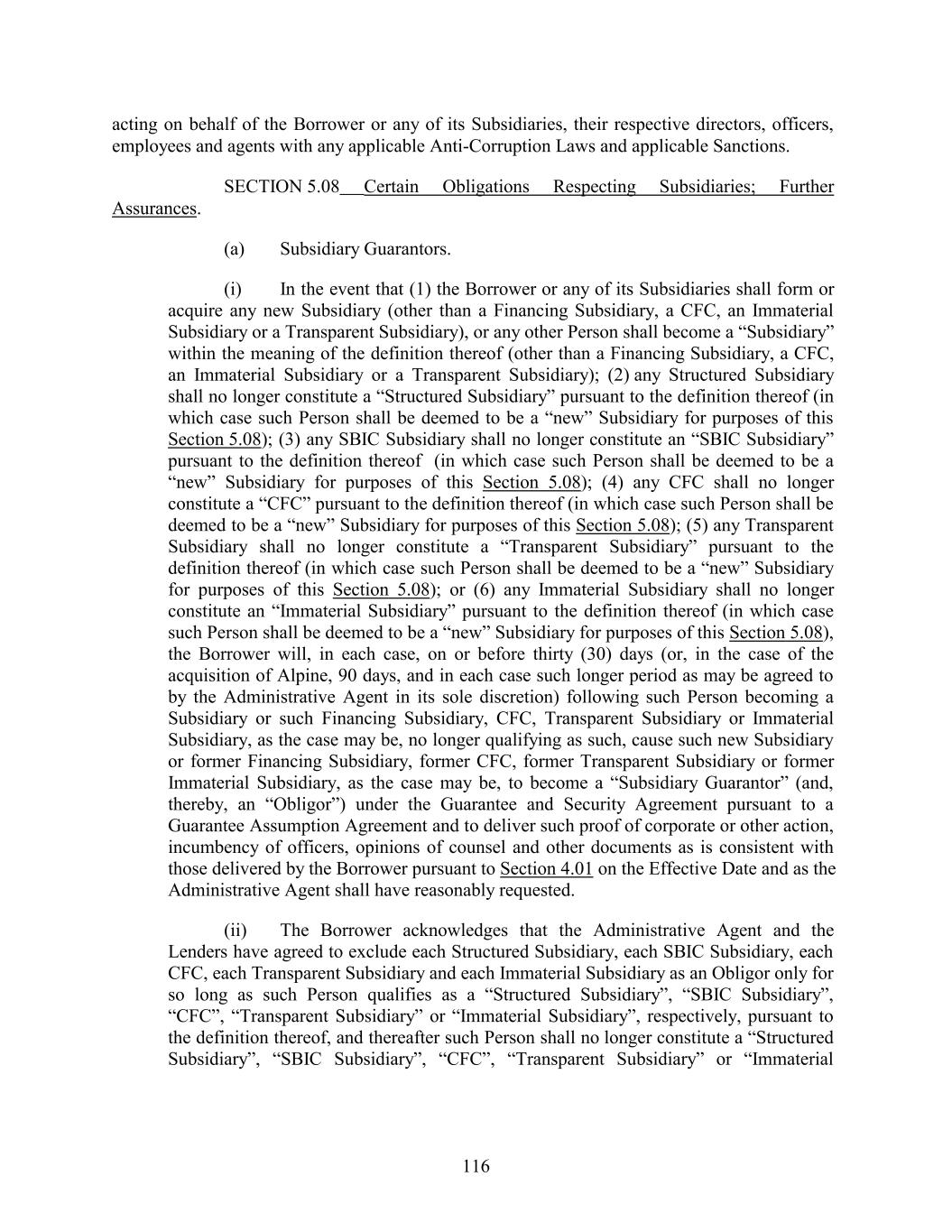 acting on behalf of the Borrower or any of its Subsidiaries, their respective directors, officers, employees and agents with any applicable Anti-Corruption Laws and applicable Sanctions. SECTION 5.08 Certain Obligations Respecting Subsidiaries; Further Assurances. (a) Subsidiary Guarantors. (i) In the event that (1) the Borrower or any of its Subsidiaries shall form or acquire any new Subsidiary (other than a Financing Subsidiary, a CFC, an Immaterial Subsidiary or a Transparent Subsidiary), or any other Person shall become a “Subsidiary” within the meaning of the definition thereof (other than a Financing Subsidiary, a CFC, an Immaterial Subsidiary or a Transparent Subsidiary); (2) any Structured Subsidiary shall no longer constitute a “Structured Subsidiary” pursuant to the definition thereof (in which case such Person shall be deemed to be a “new” Subsidiary for purposes of this Section 5.08); (3) any SBIC Subsidiary shall no longer constitute an “SBIC Subsidiary” pursuant to the definition thereof (in which case such Person shall be deemed to be a “new” Subsidiary for purposes of this Section 5.08); (4) any CFC shall no longer constitute a “CFC” pursuant to the definition thereof (in which case such Person shall be deemed to be a “new” Subsidiary for purposes of this Section 5.08); (5) any Transparent Subsidiary shall no longer constitute a “Transparent Subsidiary” pursuant to the definition thereof (in which case such Person shall be deemed to be a “new” Subsidiary for purposes of this Section 5.08); or (6) any Immaterial Subsidiary shall no longer constitute an “Immaterial Subsidiary” pursuant to the definition thereof (in which case such Person shall be deemed to be a “new” Subsidiary for purposes of this Section 5.08), the Borrower will, in each case, on or before thirty (30) days (or, in the case of the acquisition of Alpine, 90 days, and in each case such longer period as may be agreed to by the Administrative Agent in its sole discretion) following such Person becoming a Subsidiary or such Financing Subsidiary, CFC, Transparent Subsidiary or Immaterial Subsidiary, as the case may be, no longer qualifying as such, cause such new Subsidiary or former Financing Subsidiary, former CFC, former Transparent Subsidiary or former Immaterial Subsidiary, as the case may be, to become a “Subsidiary Guarantor” (and, thereby, an “Obligor”) under the Guarantee and Security Agreement pursuant to a Guarantee Assumption Agreement and to deliver such proof of corporate or other action, incumbency of officers, opinions of counsel and other documents as is consistent with those delivered by the Borrower pursuant to Section 4.01 on the Effective Date and as the Administrative Agent shall have reasonably requested. (ii) The Borrower acknowledges that the Administrative Agent and the Lenders have agreed to exclude each Structured Subsidiary, each SBIC Subsidiary, each CFC, each Transparent Subsidiary and each Immaterial Subsidiary as an Obligor only for so long as such Person qualifies as a “Structured Subsidiary”, “SBIC Subsidiary”, “CFC”, “Transparent Subsidiary” or “Immaterial Subsidiary”, respectively, pursuant to the definition thereof, and thereafter such Person shall no longer constitute a “Structured Subsidiary”, “SBIC Subsidiary”, “CFC”, “Transparent Subsidiary” or “Immaterial 116