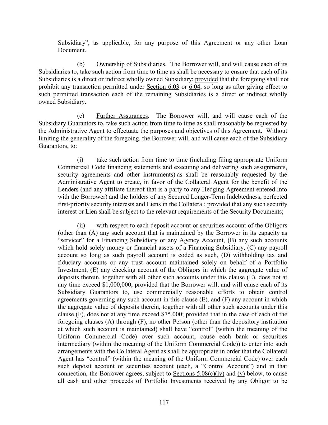 Subsidiary”, as applicable, for any purpose of this Agreement or any other Loan Document. (b) Ownership of Subsidiaries. The Borrower will, and will cause each of its Subsidiaries to, take such action from time to time as shall be necessary to ensure that each of its Subsidiaries is a direct or indirect wholly owned Subsidiary; provided that the foregoing shall not prohibit any transaction permitted under Section 6.03 or 6.04, so long as after giving effect to such permitted transaction each of the remaining Subsidiaries is a direct or indirect wholly owned Subsidiary. (c) Further Assurances. The Borrower will, and will cause each of the Subsidiary Guarantors to, take such action from time to time as shall reasonably be requested by the Administrative Agent to effectuate the purposes and objectives of this Agreement. Without limiting the generality of the foregoing, the Borrower will, and will cause each of the Subsidiary Guarantors, to: (i) take such action from time to time (including filing appropriate Uniform Commercial Code financing statements and executing and delivering such assignments, security agreements and other instruments) as shall be reasonably requested by the Administrative Agent to create, in favor of the Collateral Agent for the benefit of the Lenders (and any affiliate thereof that is a party to any Hedging Agreement entered into with the Borrower) and the holders of any Secured Longer-Term Indebtedness, perfected first-priority security interests and Liens in the Collateral; provided that any such security interest or Lien shall be subject to the relevant requirements of the Security Documents; (ii) with respect to each deposit account or securities account of the Obligors (other than (A) any such account that is maintained by the Borrower in its capacity as “servicer” for a Financing Subsidiary or any Agency Account, (B) any such accounts which hold solely money or financial assets of a Financing Subsidiary, (C) any payroll account so long as such payroll account is coded as such, (D) withholding tax and fiduciary accounts or any trust account maintained solely on behalf of a Portfolio Investment, (E) any checking account of the Obligors in which the aggregate value of deposits therein, together with all other such accounts under this clause (E), does not at any time exceed $1,000,000, provided that the Borrower will, and will cause each of its Subsidiary Guarantors to, use commercially reasonable efforts to obtain control agreements governing any such account in this clause (E), and (F) any account in which the aggregate value of deposits therein, together with all other such accounts under this clause (F), does not at any time exceed $75,000; provided that in the case of each of the foregoing clauses (A) through (F), no other Person (other than the depository institution at which such account is maintained) shall have “control” (within the meaning of the Uniform Commercial Code) over such account, cause each bank or securities intermediary (within the meaning of the Uniform Commercial Code)) to enter into such arrangements with the Collateral Agent as shall be appropriate in order that the Collateral Agent has “control” (within the meaning of the Uniform Commercial Code) over each such deposit account or securities account (each, a “Control Account”) and in that connection, the Borrower agrees, subject to Sections 5.08(c)(iv) and (v) below, to cause all cash and other proceeds of Portfolio Investments received by any Obligor to be 117