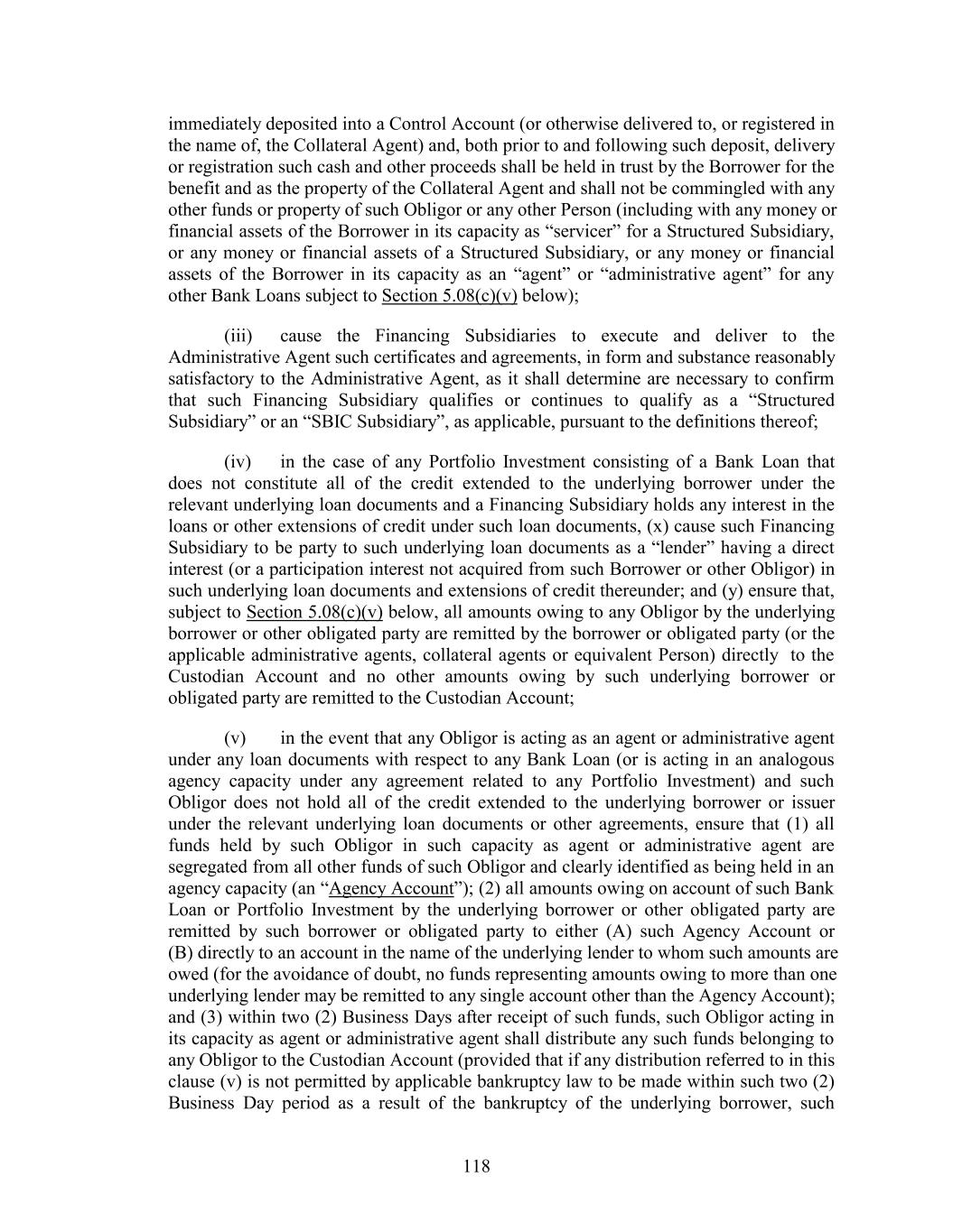 immediately deposited into a Control Account (or otherwise delivered to, or registered in the name of, the Collateral Agent) and, both prior to and following such deposit, delivery or registration such cash and other proceeds shall be held in trust by the Borrower for the benefit and as the property of the Collateral Agent and shall not be commingled with any other funds or property of such Obligor or any other Person (including with any money or financial assets of the Borrower in its capacity as “servicer” for a Structured Subsidiary, or any money or financial assets of a Structured Subsidiary, or any money or financial assets of the Borrower in its capacity as an “agent” or “administrative agent” for any other Bank Loans subject to Section 5.08(c)(v) below); (iii) cause the Financing Subsidiaries to execute and deliver to the Administrative Agent such certificates and agreements, in form and substance reasonably satisfactory to the Administrative Agent, as it shall determine are necessary to confirm that such Financing Subsidiary qualifies or continues to qualify as a “Structured Subsidiary” or an “SBIC Subsidiary”, as applicable, pursuant to the definitions thereof; (iv) in the case of any Portfolio Investment consisting of a Bank Loan that does not constitute all of the credit extended to the underlying borrower under the relevant underlying loan documents and a Financing Subsidiary holds any interest in the loans or other extensions of credit under such loan documents, (x) cause such Financing Subsidiary to be party to such underlying loan documents as a “lender” having a direct interest (or a participation interest not acquired from such Borrower or other Obligor) in such underlying loan documents and extensions of credit thereunder; and (y) ensure that, subject to Section 5.08(c)(v) below, all amounts owing to any Obligor by the underlying borrower or other obligated party are remitted by the borrower or obligated party (or the applicable administrative agents, collateral agents or equivalent Person) directly to the Custodian Account and no other amounts owing by such underlying borrower or obligated party are remitted to the Custodian Account; (v) in the event that any Obligor is acting as an agent or administrative agent under any loan documents with respect to any Bank Loan (or is acting in an analogous agency capacity under any agreement related to any Portfolio Investment) and such Obligor does not hold all of the credit extended to the underlying borrower or issuer under the relevant underlying loan documents or other agreements, ensure that (1) all funds held by such Obligor in such capacity as agent or administrative agent are segregated from all other funds of such Obligor and clearly identified as being held in an agency capacity (an “Agency Account”); (2) all amounts owing on account of such Bank Loan or Portfolio Investment by the underlying borrower or other obligated party are remitted by such borrower or obligated party to either (A) such Agency Account or (B) directly to an account in the name of the underlying lender to whom such amounts are owed (for the avoidance of doubt, no funds representing amounts owing to more than one underlying lender may be remitted to any single account other than the Agency Account); and (3) within two (2) Business Days after receipt of such funds, such Obligor acting in its capacity as agent or administrative agent shall distribute any such funds belonging to any Obligor to the Custodian Account (provided that if any distribution referred to in this clause (v) is not permitted by applicable bankruptcy law to be made within such two (2) Business Day period as a result of the bankruptcy of the underlying borrower, such 118