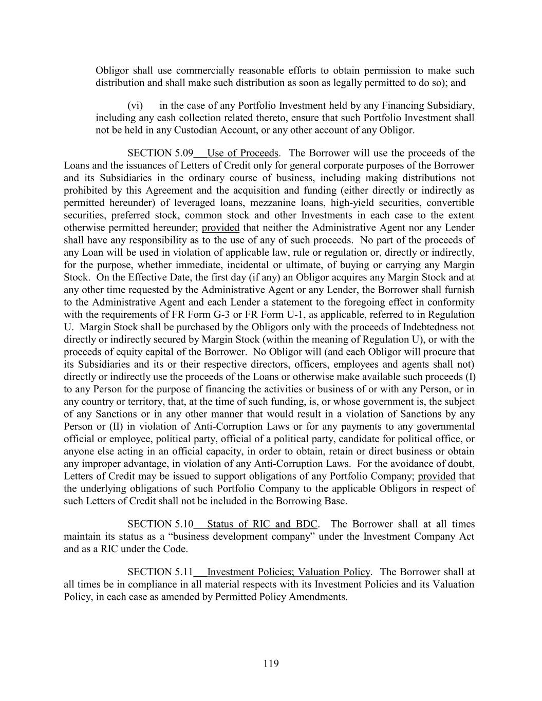 Obligor shall use commercially reasonable efforts to obtain permission to make such distribution and shall make such distribution as soon as legally permitted to do so); and (vi) in the case of any Portfolio Investment held by any Financing Subsidiary, including any cash collection related thereto, ensure that such Portfolio Investment shall not be held in any Custodian Account, or any other account of any Obligor. SECTION 5.09 Use of Proceeds. The Borrower will use the proceeds of the Loans and the issuances of Letters of Credit only for general corporate purposes of the Borrower and its Subsidiaries in the ordinary course of business, including making distributions not prohibited by this Agreement and the acquisition and funding (either directly or indirectly as permitted hereunder) of leveraged loans, mezzanine loans, high-yield securities, convertible securities, preferred stock, common stock and other Investments in each case to the extent otherwise permitted hereunder; provided that neither the Administrative Agent nor any Lender shall have any responsibility as to the use of any of such proceeds. No part of the proceeds of any Loan will be used in violation of applicable law, rule or regulation or, directly or indirectly, for the purpose, whether immediate, incidental or ultimate, of buying or carrying any Margin Stock. On the Effective Date, the first day (if any) an Obligor acquires any Margin Stock and at any other time requested by the Administrative Agent or any Lender, the Borrower shall furnish to the Administrative Agent and each Lender a statement to the foregoing effect in conformity with the requirements of FR Form G-3 or FR Form U-1, as applicable, referred to in Regulation U. Margin Stock shall be purchased by the Obligors only with the proceeds of Indebtedness not directly or indirectly secured by Margin Stock (within the meaning of Regulation U), or with the proceeds of equity capital of the Borrower. No Obligor will (and each Obligor will procure that its Subsidiaries and its or their respective directors, officers, employees and agents shall not) directly or indirectly use the proceeds of the Loans or otherwise make available such proceeds (I) to any Person for the purpose of financing the activities or business of or with any Person, or in any country or territory, that, at the time of such funding, is, or whose government is, the subject of any Sanctions or in any other manner that would result in a violation of Sanctions by any Person or (II) in violation of Anti-Corruption Laws or for any payments to any governmental official or employee, political party, official of a political party, candidate for political office, or anyone else acting in an official capacity, in order to obtain, retain or direct business or obtain any improper advantage, in violation of any Anti-Corruption Laws. For the avoidance of doubt, Letters of Credit may be issued to support obligations of any Portfolio Company; provided that the underlying obligations of such Portfolio Company to the applicable Obligors in respect of such Letters of Credit shall not be included in the Borrowing Base. SECTION 5.10 Status of RIC and BDC. The Borrower shall at all times maintain its status as a “business development company” under the Investment Company Act and as a RIC under the Code. SECTION 5.11 Investment Policies; Valuation Policy. The Borrower shall at all times be in compliance in all material respects with its Investment Policies and its Valuation Policy, in each case as amended by Permitted Policy Amendments. 119