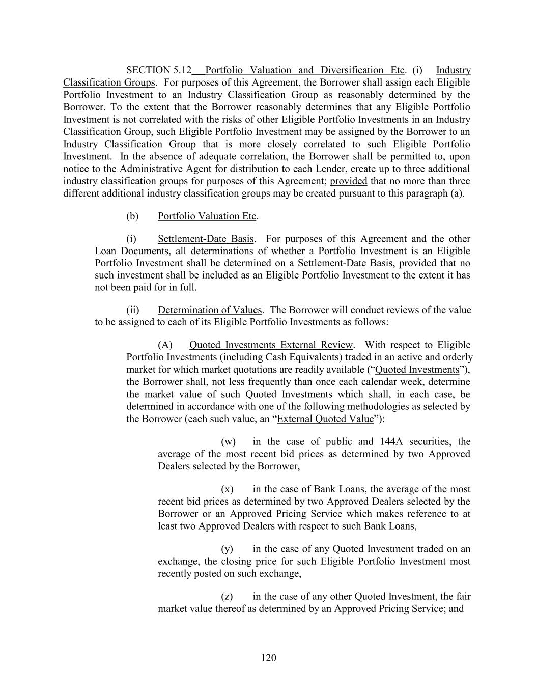 SECTION 5.12 Portfolio Valuation and Diversification Etc. (i) Industry Classification Groups. For purposes of this Agreement, the Borrower shall assign each Eligible Portfolio Investment to an Industry Classification Group as reasonably determined by the Borrower. To the extent that the Borrower reasonably determines that any Eligible Portfolio Investment is not correlated with the risks of other Eligible Portfolio Investments in an Industry Classification Group, such Eligible Portfolio Investment may be assigned by the Borrower to an Industry Classification Group that is more closely correlated to such Eligible Portfolio Investment. In the absence of adequate correlation, the Borrower shall be permitted to, upon notice to the Administrative Agent for distribution to each Lender, create up to three additional industry classification groups for purposes of this Agreement; provided that no more than three different additional industry classification groups may be created pursuant to this paragraph (a). (b) Portfolio Valuation Etc. (i) Settlement-Date Basis. For purposes of this Agreement and the other Loan Documents, all determinations of whether a Portfolio Investment is an Eligible Portfolio Investment shall be determined on a Settlement-Date Basis, provided that no such investment shall be included as an Eligible Portfolio Investment to the extent it has not been paid for in full. (ii) Determination of Values. The Borrower will conduct reviews of the value to be assigned to each of its Eligible Portfolio Investments as follows: (A) Quoted Investments External Review. With respect to Eligible Portfolio Investments (including Cash Equivalents) traded in an active and orderly market for which market quotations are readily available (“Quoted Investments”), the Borrower shall, not less frequently than once each calendar week, determine the market value of such Quoted Investments which shall, in each case, be determined in accordance with one of the following methodologies as selected by the Borrower (each such value, an “External Quoted Value”): (w) in the case of public and 144A securities, the average of the most recent bid prices as determined by two Approved Dealers selected by the Borrower, (x) in the case of Bank Loans, the average of the most recent bid prices as determined by two Approved Dealers selected by the Borrower or an Approved Pricing Service which makes reference to at least two Approved Dealers with respect to such Bank Loans, (y) in the case of any Quoted Investment traded on an exchange, the closing price for such Eligible Portfolio Investment most recently posted on such exchange, (z) in the case of any other Quoted Investment, the fair market value thereof as determined by an Approved Pricing Service; and 120