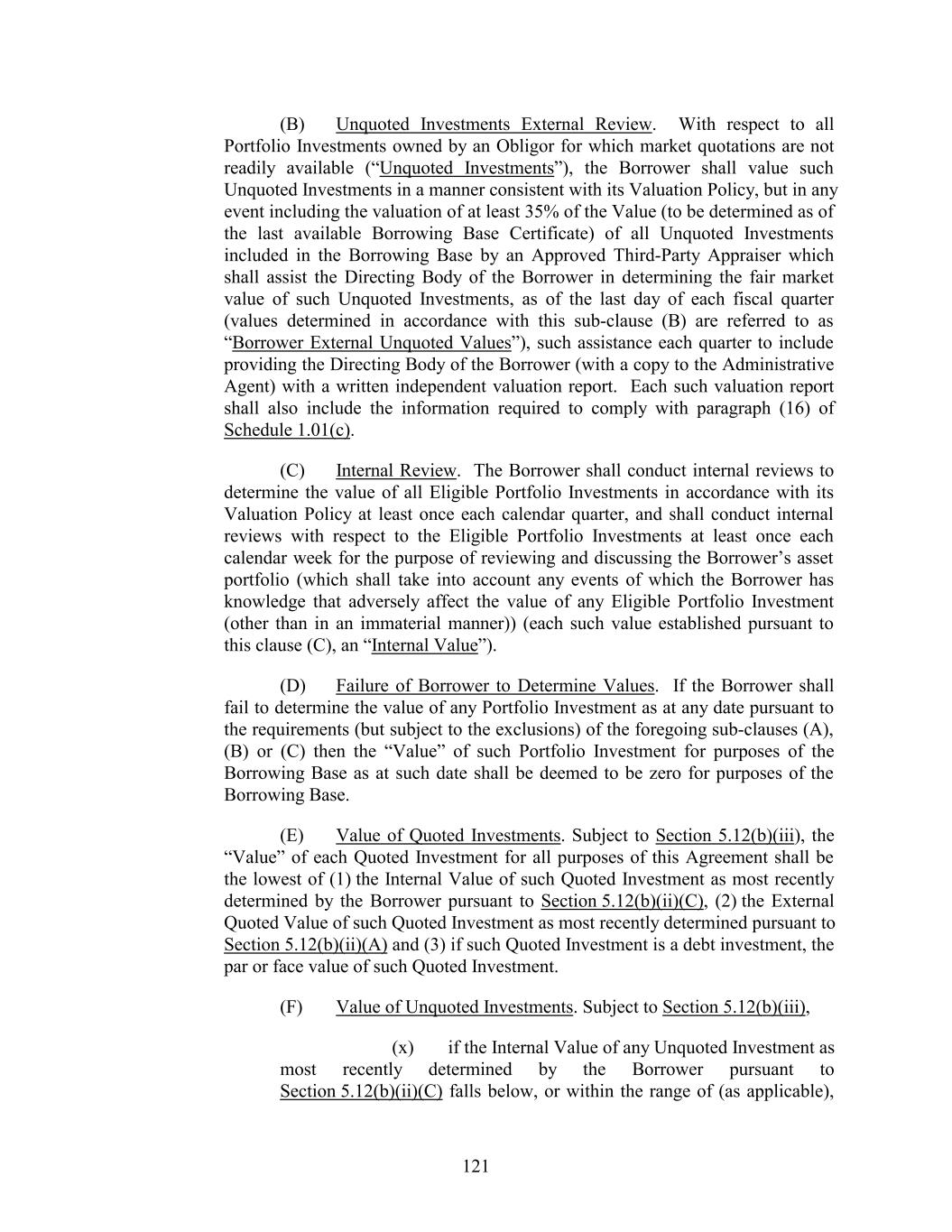 (B) Unquoted Investments External Review. With respect to all Portfolio Investments owned by an Obligor for which market quotations are not readily available (“Unquoted Investments”), the Borrower shall value such Unquoted Investments in a manner consistent with its Valuation Policy, but in any event including the valuation of at least 35% of the Value (to be determined as of the last available Borrowing Base Certificate) of all Unquoted Investments included in the Borrowing Base by an Approved Third-Party Appraiser which shall assist the Directing Body of the Borrower in determining the fair market value of such Unquoted Investments, as of the last day of each fiscal quarter (values determined in accordance with this sub-clause (B) are referred to as “Borrower External Unquoted Values”), such assistance each quarter to include providing the Directing Body of the Borrower (with a copy to the Administrative Agent) with a written independent valuation report. Each such valuation report shall also include the information required to comply with paragraph (16) of Schedule 1.01(c). (C) Internal Review. The Borrower shall conduct internal reviews to determine the value of all Eligible Portfolio Investments in accordance with its Valuation Policy at least once each calendar quarter, and shall conduct internal reviews with respect to the Eligible Portfolio Investments at least once each calendar week for the purpose of reviewing and discussing the Borrower’s asset portfolio (which shall take into account any events of which the Borrower has knowledge that adversely affect the value of any Eligible Portfolio Investment (other than in an immaterial manner)) (each such value established pursuant to this clause (C), an “Internal Value”). (D) Failure of Borrower to Determine Values. If the Borrower shall fail to determine the value of any Portfolio Investment as at any date pursuant to the requirements (but subject to the exclusions) of the foregoing sub-clauses (A), (B) or (C) then the “Value” of such Portfolio Investment for purposes of the Borrowing Base as at such date shall be deemed to be zero for purposes of the Borrowing Base. (E) Value of Quoted Investments. Subject to Section 5.12(b)(iii), the “Value” of each Quoted Investment for all purposes of this Agreement shall be the lowest of (1) the Internal Value of such Quoted Investment as most recently determined by the Borrower pursuant to Section 5.12(b)(ii)(C), (2) the External Quoted Value of such Quoted Investment as most recently determined pursuant to Section 5.12(b)(ii)(A) and (3) if such Quoted Investment is a debt investment, the par or face value of such Quoted Investment. (F) Value of Unquoted Investments. Subject to Section 5.12(b)(iii), (x) if the Internal Value of any Unquoted Investment as most recently determined by the Borrower pursuant to Section 5.12(b)(ii)(C) falls below, or within the range of (as applicable), 121