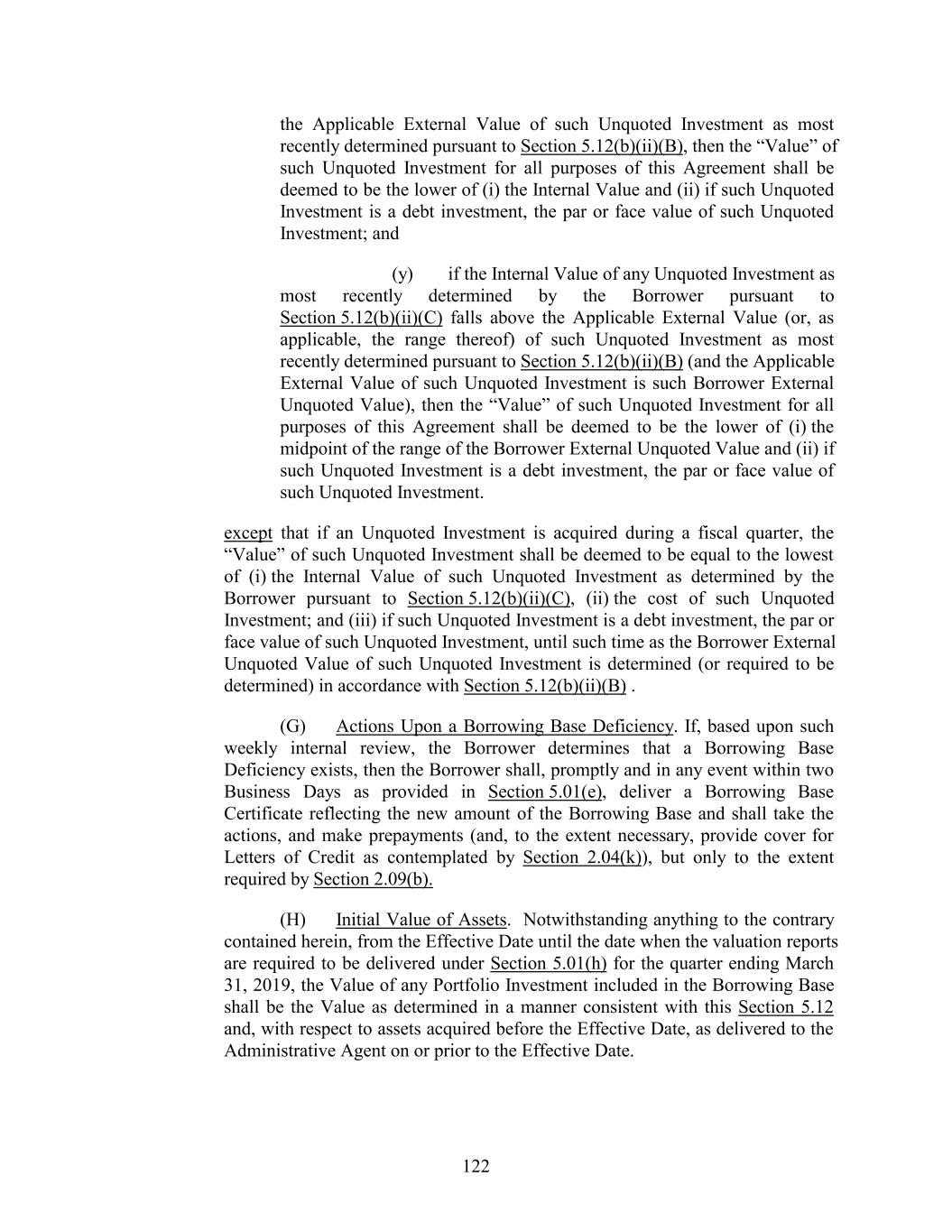the Applicable External Value of such Unquoted Investment as most recently determined pursuant to Section 5.12(b)(ii)(B), then the “Value” of such Unquoted Investment for all purposes of this Agreement shall be deemed to be the lower of (i) the Internal Value and (ii) if such Unquoted Investment is a debt investment, the par or face value of such Unquoted Investment; and (y) if the Internal Value of any Unquoted Investment as most recently determined by the Borrower pursuant to Section 5.12(b)(ii)(C) falls above the Applicable External Value (or, as applicable, the range thereof) of such Unquoted Investment as most recently determined pursuant to Section 5.12(b)(ii)(B) (and the Applicable External Value of such Unquoted Investment is such Borrower External Unquoted Value), then the “Value” of such Unquoted Investment for all purposes of this Agreement shall be deemed to be the lower of (i) the midpoint of the range of the Borrower External Unquoted Value and (ii) if such Unquoted Investment is a debt investment, the par or face value of such Unquoted Investment. except that if an Unquoted Investment is acquired during a fiscal quarter, the “Value” of such Unquoted Investment shall be deemed to be equal to the lowest of (i) the Internal Value of such Unquoted Investment as determined by the Borrower pursuant to Section 5.12(b)(ii)(C), (ii) the cost of such Unquoted Investment; and (iii) if such Unquoted Investment is a debt investment, the par or face value of such Unquoted Investment, until such time as the Borrower External Unquoted Value of such Unquoted Investment is determined (or required to be determined) in accordance with Section 5.12(b)(ii)(B) . (G) Actions Upon a Borrowing Base Deficiency. If, based upon such weekly internal review, the Borrower determines that a Borrowing Base Deficiency exists, then the Borrower shall, promptly and in any event within two Business Days as provided in Section 5.01(e), deliver a Borrowing Base Certificate reflecting the new amount of the Borrowing Base and shall take the actions, and make prepayments (and, to the extent necessary, provide cover for Letters of Credit as contemplated by Section 2.04(k)), but only to the extent required by Section 2.09(b). (H) Initial Value of Assets. Notwithstanding anything to the contrary contained herein, from the Effective Date until the date when the valuation reports are required to be delivered under Section 5.01(h) for the quarter ending March 31, 2019, the Value of any Portfolio Investment included in the Borrowing Base shall be the Value as determined in a manner consistent with this Section 5.12 and, with respect to assets acquired before the Effective Date, as delivered to the Administrative Agent on or prior to the Effective Date. 122