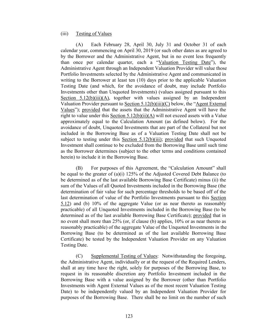(iii) Testing of Values (A) Each February 28, April 30, July 31 and October 31 of each calendar year, commencing on April 30, 2019 (or such other dates as are agreed to by the Borrower and the Administrative Agent, but in no event less frequently than once per calendar quarter, each a “Valuation Testing Date”), the Administrative Agent through an Independent Valuation Provider will value those Portfolio Investments selected by the Administrative Agent and communicated in writing to the Borrower at least ten (10) days prior to the applicable Valuation Testing Date (and which, for the avoidance of doubt, may include Portfolio Investments other than Unquoted Investments) (values assigned pursuant to this Section 5.12(b)(iii)(A), together with values assigned by an Independent Valuation Provider pursuant to Section 5.12(b)(iii)(C) below, the “Agent External Values”); provided that the assets that the Administrative Agent will have the right to value under this Section 5.12(b)(ii)(A) will not exceed assets with a Value approximately equal to the Calculation Amount (as defined below). For the avoidance of doubt, Unquoted Investments that are part of the Collateral but not included in the Borrowing Base as of a Valuation Testing Date shall not be subject to testing under this Section 5.12(b)(iii); provided that such Unquoted Investment shall continue to be excluded from the Borrowing Base until such time as the Borrower determines (subject to the other terms and conditions contained herein) to include it in the Borrowing Base. (B) For purposes of this Agreement, the “Calculation Amount” shall be equal to the greater of (a)(i) 125% of the Adjusted Covered Debt Balance (to be determined as of the last available Borrowing Base Certificate) minus (ii) the sum of the Values of all Quoted Investments included in the Borrowing Base (the determination of fair value for such percentage thresholds to be based off of the last determination of value of the Portfolio Investments pursuant to this Section 5.12) and (b) 10% of the aggregate Value (or as near thereto as reasonably practicable) of all Unquoted Investments included in the Borrowing Base (to be determined as of the last available Borrowing Base Certificate); provided that in no event shall more than 25% (or, if clause (b) applies, 10% or as near thereto as reasonably practicable) of the aggregate Value of the Unquoted Investments in the Borrowing Base (to be determined as of the last available Borrowing Base Certificate) be tested by the Independent Valuation Provider on any Valuation Testing Date. (C) Supplemental Testing of Values: Notwithstanding the foregoing, the Administrative Agent, individually or at the request of the Required Lenders, shall at any time have the right, solely for purposes of the Borrowing Base, to request in its reasonable discretion any Portfolio Investment included in the Borrowing Base with a value assigned by the Borrower (other than Portfolio Investments with Agent External Values as of the most recent Valuation Testing Date) to be independently valued by an Independent Valuation Provider for purposes of the Borrowing Base. There shall be no limit on the number of such 123