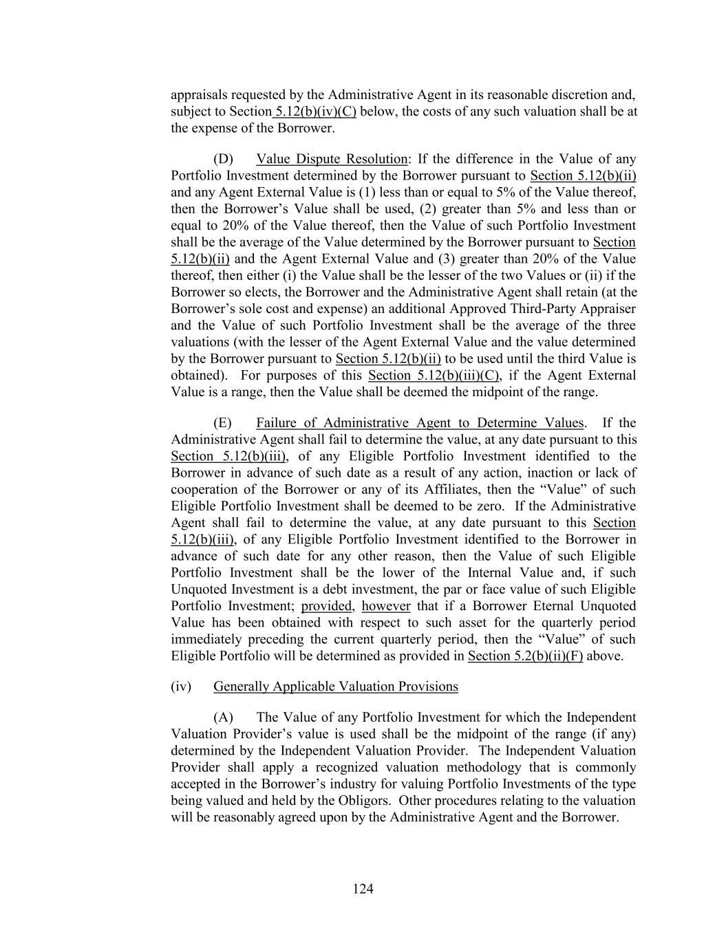 appraisals requested by the Administrative Agent in its reasonable discretion and, subject to Section 5.12(b)(iv)(C) below, the costs of any such valuation shall be at the expense of the Borrower. (D) Value Dispute Resolution: If the difference in the Value of any Portfolio Investment determined by the Borrower pursuant to Section 5.12(b)(ii) and any Agent External Value is (1) less than or equal to 5% of the Value thereof, then the Borrower’s Value shall be used, (2) greater than 5% and less than or equal to 20% of the Value thereof, then the Value of such Portfolio Investment shall be the average of the Value determined by the Borrower pursuant to Section 5.12(b)(ii) and the Agent External Value and (3) greater than 20% of the Value thereof, then either (i) the Value shall be the lesser of the two Values or (ii) if the Borrower so elects, the Borrower and the Administrative Agent shall retain (at the Borrower’s sole cost and expense) an additional Approved Third-Party Appraiser and the Value of such Portfolio Investment shall be the average of the three valuations (with the lesser of the Agent External Value and the value determined by the Borrower pursuant to Section 5.12(b)(ii) to be used until the third Value is obtained). For purposes of this Section 5.12(b)(iii)(C), if the Agent External Value is a range, then the Value shall be deemed the midpoint of the range. (E) Failure of Administrative Agent to Determine Values. If the Administrative Agent shall fail to determine the value, at any date pursuant to this Section 5.12(b)(iii), of any Eligible Portfolio Investment identified to the Borrower in advance of such date as a result of any action, inaction or lack of cooperation of the Borrower or any of its Affiliates, then the “Value” of such Eligible Portfolio Investment shall be deemed to be zero. If the Administrative Agent shall fail to determine the value, at any date pursuant to this Section 5.12(b)(iii), of any Eligible Portfolio Investment identified to the Borrower in advance of such date for any other reason, then the Value of such Eligible Portfolio Investment shall be the lower of the Internal Value and, if such Unquoted Investment is a debt investment, the par or face value of such Eligible Portfolio Investment; provided, however that if a Borrower Eternal Unquoted Value has been obtained with respect to such asset for the quarterly period immediately preceding the current quarterly period, then the “Value” of such Eligible Portfolio will be determined as provided in Section 5.2(b)(ii)(F) above. (iv) Generally Applicable Valuation Provisions (A) The Value of any Portfolio Investment for which the Independent Valuation Provider’s value is used shall be the midpoint of the range (if any) determined by the Independent Valuation Provider. The Independent Valuation Provider shall apply a recognized valuation methodology that is commonly accepted in the Borrower’s industry for valuing Portfolio Investments of the type being valued and held by the Obligors. Other procedures relating to the valuation will be reasonably agreed upon by the Administrative Agent and the Borrower. 124