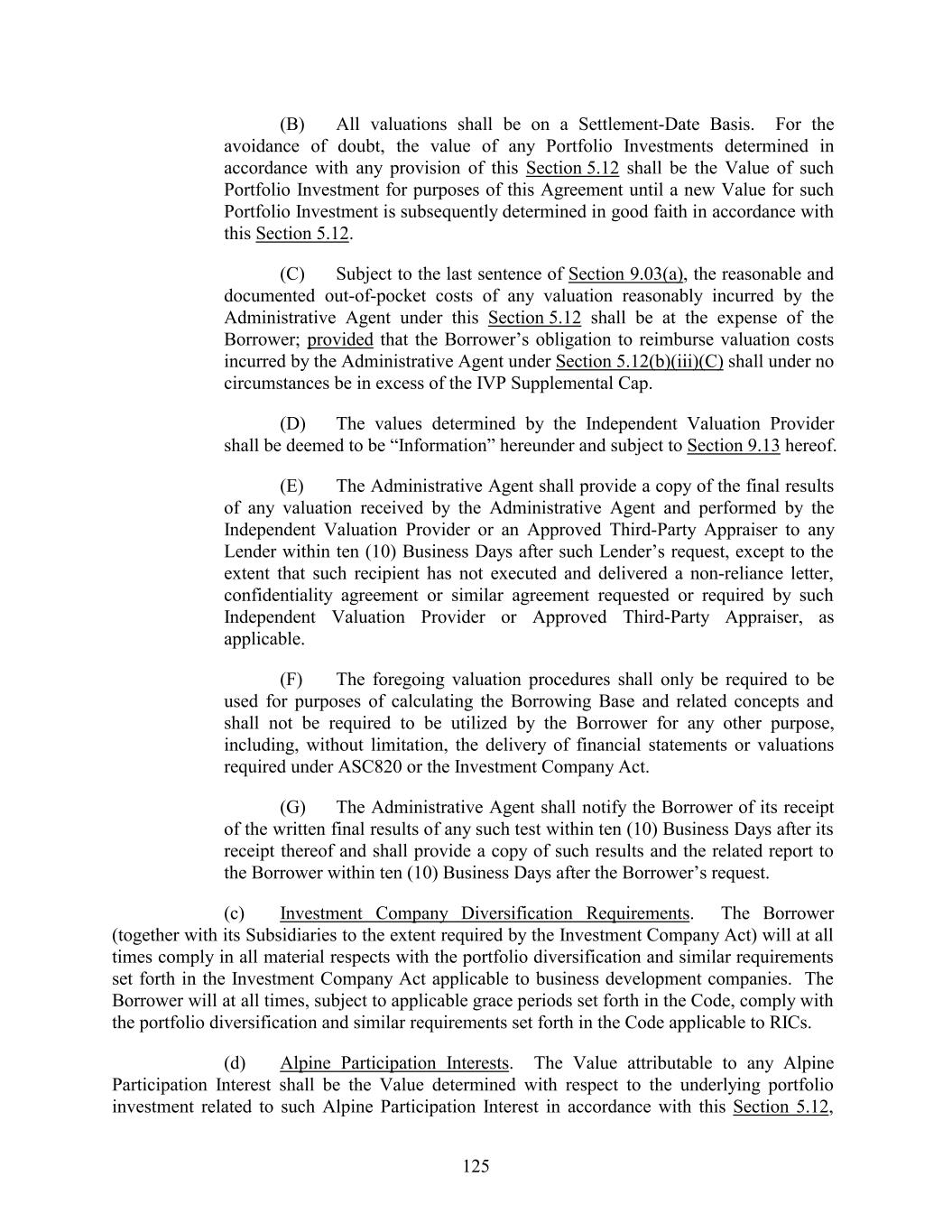 (B) All valuations shall be on a Settlement-Date Basis. For the avoidance of doubt, the value of any Portfolio Investments determined in accordance with any provision of this Section 5.12 shall be the Value of such Portfolio Investment for purposes of this Agreement until a new Value for such Portfolio Investment is subsequently determined in good faith in accordance with this Section 5.12. (C) Subject to the last sentence of Section 9.03(a), the reasonable and documented out-of-pocket costs of any valuation reasonably incurred by the Administrative Agent under this Section 5.12 shall be at the expense of the Borrower; provided that the Borrower’s obligation to reimburse valuation costs incurred by the Administrative Agent under Section 5.12(b)(iii)(C) shall under no circumstances be in excess of the IVP Supplemental Cap. (D) The values determined by the Independent Valuation Provider shall be deemed to be “Information” hereunder and subject to Section 9.13 hereof. (E) The Administrative Agent shall provide a copy of the final results of any valuation received by the Administrative Agent and performed by the Independent Valuation Provider or an Approved Third-Party Appraiser to any Lender within ten (10) Business Days after such Lender’s request, except to the extent that such recipient has not executed and delivered a non-reliance letter, confidentiality agreement or similar agreement requested or required by such Independent Valuation Provider or Approved Third-Party Appraiser, as applicable. (F) The foregoing valuation procedures shall only be required to be used for purposes of calculating the Borrowing Base and related concepts and shall not be required to be utilized by the Borrower for any other purpose, including, without limitation, the delivery of financial statements or valuations required under ASC820 or the Investment Company Act. (G) The Administrative Agent shall notify the Borrower of its receipt of the written final results of any such test within ten (10) Business Days after its receipt thereof and shall provide a copy of such results and the related report to the Borrower within ten (10) Business Days after the Borrower’s request. (c) Investment Company Diversification Requirements. The Borrower (together with its Subsidiaries to the extent required by the Investment Company Act) will at all times comply in all material respects with the portfolio diversification and similar requirements set forth in the Investment Company Act applicable to business development companies. The Borrower will at all times, subject to applicable grace periods set forth in the Code, comply with the portfolio diversification and similar requirements set forth in the Code applicable to RICs. (d) Alpine Participation Interests. The Value attributable to any Alpine Participation Interest shall be the Value determined with respect to the underlying portfolio investment related to such Alpine Participation Interest in accordance with this Section 5.12, 125