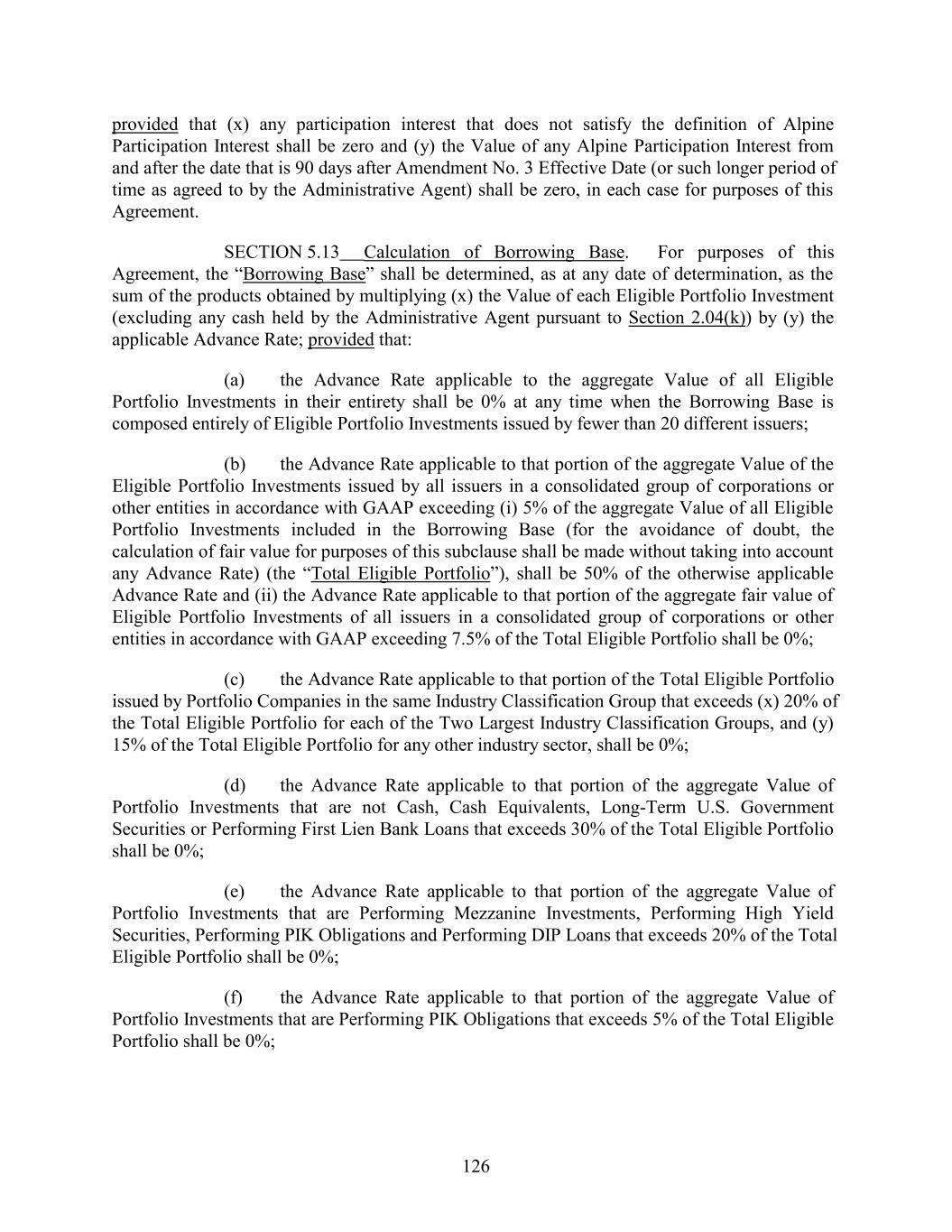 provided that (x) any participation interest that does not satisfy the definition of Alpine Participation Interest shall be zero and (y) the Value of any Alpine Participation Interest from and after the date that is 90 days after Amendment No. 3 Effective Date (or such longer period of time as agreed to by the Administrative Agent) shall be zero, in each case for purposes of this Agreement. SECTION 5.13 Calculation of Borrowing Base. For purposes of this Agreement, the “Borrowing Base” shall be determined, as at any date of determination, as the sum of the products obtained by multiplying (x) the Value of each Eligible Portfolio Investment (excluding any cash held by the Administrative Agent pursuant to Section 2.04(k)) by (y) the applicable Advance Rate; provided that: (a) the Advance Rate applicable to the aggregate Value of all Eligible Portfolio Investments in their entirety shall be 0% at any time when the Borrowing Base is composed entirely of Eligible Portfolio Investments issued by fewer than 20 different issuers; (b) the Advance Rate applicable to that portion of the aggregate Value of the Eligible Portfolio Investments issued by all issuers in a consolidated group of corporations or other entities in accordance with GAAP exceeding (i) 5% of the aggregate Value of all Eligible Portfolio Investments included in the Borrowing Base (for the avoidance of doubt, the calculation of fair value for purposes of this subclause shall be made without taking into account any Advance Rate) (the “Total Eligible Portfolio”), shall be 50% of the otherwise applicable Advance Rate and (ii) the Advance Rate applicable to that portion of the aggregate fair value of Eligible Portfolio Investments of all issuers in a consolidated group of corporations or other entities in accordance with GAAP exceeding 7.5% of the Total Eligible Portfolio shall be 0%; (c) the Advance Rate applicable to that portion of the Total Eligible Portfolio issued by Portfolio Companies in the same Industry Classification Group that exceeds (x) 20% of the Total Eligible Portfolio for each of the Two Largest Industry Classification Groups, and (y) 15% of the Total Eligible Portfolio for any other industry sector, shall be 0%; (d) the Advance Rate applicable to that portion of the aggregate Value of Portfolio Investments that are not Cash, Cash Equivalents, Long-Term U.S. Government Securities or Performing First Lien Bank Loans that exceeds 30% of the Total Eligible Portfolio shall be 0%; (e) the Advance Rate applicable to that portion of the aggregate Value of Portfolio Investments that are Performing Mezzanine Investments, Performing High Yield Securities, Performing PIK Obligations and Performing DIP Loans that exceeds 20% of the Total Eligible Portfolio shall be 0%; (f) the Advance Rate applicable to that portion of the aggregate Value of Portfolio Investments that are Performing PIK Obligations that exceeds 5% of the Total Eligible Portfolio shall be 0%; 126