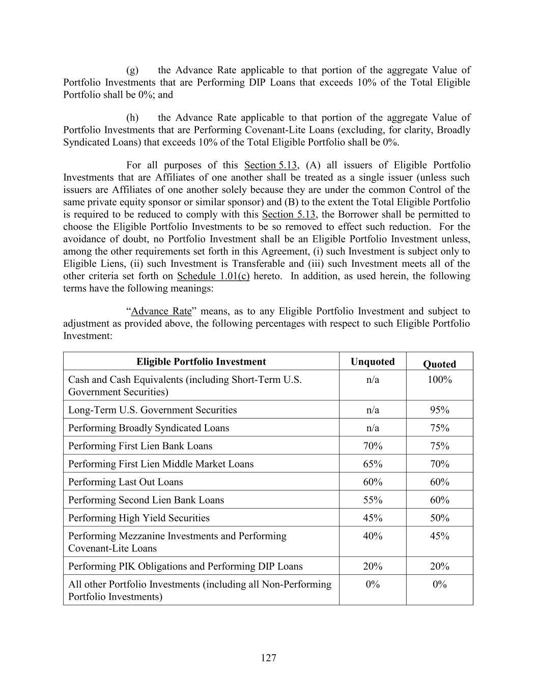 127 70% n/a Performing Last Out Loans 95% 60% 60% Performing Second Lien Bank Loans Performing Broadly Syndicated Loans 55% Cash and Cash Equivalents (including Short-Term U.S. Government Securities) 60% n/a Eligible Portfolio Investment Performing High Yield Securities 75% 45% n/a 50% Performing Mezzanine Investments and Performing Covenant-Lite Loans Performing First Lien Bank Loans 40% 100% 45% 70% Unquoted Performing PIK Obligations and Performing DIP Loans 75% 20% 20% (g) the Advance Rate applicable to that portion of the aggregate Value of Portfolio Investments that are Performing DIP Loans that exceeds 10% of the Total Eligible Portfolio shall be 0%; and (h) the Advance Rate applicable to that portion of the aggregate Value of Portfolio Investments that are Performing Covenant-Lite Loans (excluding, for clarity, Broadly Syndicated Loans) that exceeds 10% of the Total Eligible Portfolio shall be 0%. For all purposes of this Section 5.13, (A) all issuers of Eligible Portfolio Investments that are Affiliates of one another shall be treated as a single issuer (unless such issuers are Affiliates of one another solely because they are under the common Control of the same private equity sponsor or similar sponsor) and (B) to the extent the Total Eligible Portfolio is required to be reduced to comply with this Section 5.13, the Borrower shall be permitted to choose the Eligible Portfolio Investments to be so removed to effect such reduction. For the avoidance of doubt, no Portfolio Investment shall be an Eligible Portfolio Investment unless, among the other requirements set forth in this Agreement, (i) such Investment is subject only to Eligible Liens, (ii) such Investment is Transferable and (iii) such Investment meets all of the other criteria set forth on Schedule 1.01(c) hereto. In addition, as used herein, the following terms have the following meanings: “Advance Rate” means, as to any Eligible Portfolio Investment and subject to adjustment as provided above, the following percentages with respect to such Eligible Portfolio Investment: All other Portfolio Investments (including all Non-Performing Portfolio Investments) Performing First Lien Middle Market Loans 0% Long-Term U.S. Government Securities 0% 65% Quoted