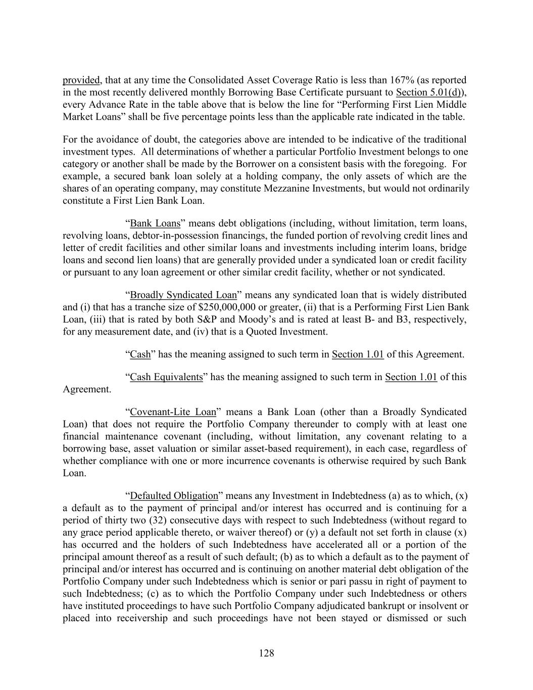 provided, that at any time the Consolidated Asset Coverage Ratio is less than 167% (as reported in the most recently delivered monthly Borrowing Base Certificate pursuant to Section 5.01(d)), every Advance Rate in the table above that is below the line for “Performing First Lien Middle Market Loans” shall be five percentage points less than the applicable rate indicated in the table. For the avoidance of doubt, the categories above are intended to be indicative of the traditional investment types. All determinations of whether a particular Portfolio Investment belongs to one category or another shall be made by the Borrower on a consistent basis with the foregoing. For example, a secured bank loan solely at a holding company, the only assets of which are the shares of an operating company, may constitute Mezzanine Investments, but would not ordinarily constitute a First Lien Bank Loan. “Bank Loans” means debt obligations (including, without limitation, term loans, revolving loans, debtor-in-possession financings, the funded portion of revolving credit lines and letter of credit facilities and other similar loans and investments including interim loans, bridge loans and second lien loans) that are generally provided under a syndicated loan or credit facility or pursuant to any loan agreement or other similar credit facility, whether or not syndicated. “Broadly Syndicated Loan” means any syndicated loan that is widely distributed and (i) that has a tranche size of $250,000,000 or greater, (ii) that is a Performing First Lien Bank Loan, (iii) that is rated by both S&P and Moody’s and is rated at least B- and B3, respectively, for any measurement date, and (iv) that is a Quoted Investment. “Cash” has the meaning assigned to such term in Section 1.01 of this Agreement. “Cash Equivalents” has the meaning assigned to such term in Section 1.01 of this Agreement. “Covenant-Lite Loan” means a Bank Loan (other than a Broadly Syndicated Loan) that does not require the Portfolio Company thereunder to comply with at least one financial maintenance covenant (including, without limitation, any covenant relating to a borrowing base, asset valuation or similar asset-based requirement), in each case, regardless of whether compliance with one or more incurrence covenants is otherwise required by such Bank Loan. “Defaulted Obligation” means any Investment in Indebtedness (a) as to which, (x) a default as to the payment of principal and/or interest has occurred and is continuing for a period of thirty two (32) consecutive days with respect to such Indebtedness (without regard to any grace period applicable thereto, or waiver thereof) or (y) a default not set forth in clause (x) has occurred and the holders of such Indebtedness have accelerated all or a portion of the principal amount thereof as a result of such default; (b) as to which a default as to the payment of principal and/or interest has occurred and is continuing on another material debt obligation of the Portfolio Company under such Indebtedness which is senior or pari passu in right of payment to such Indebtedness; (c) as to which the Portfolio Company under such Indebtedness or others have instituted proceedings to have such Portfolio Company adjudicated bankrupt or insolvent or placed into receivership and such proceedings have not been stayed or dismissed or such 128