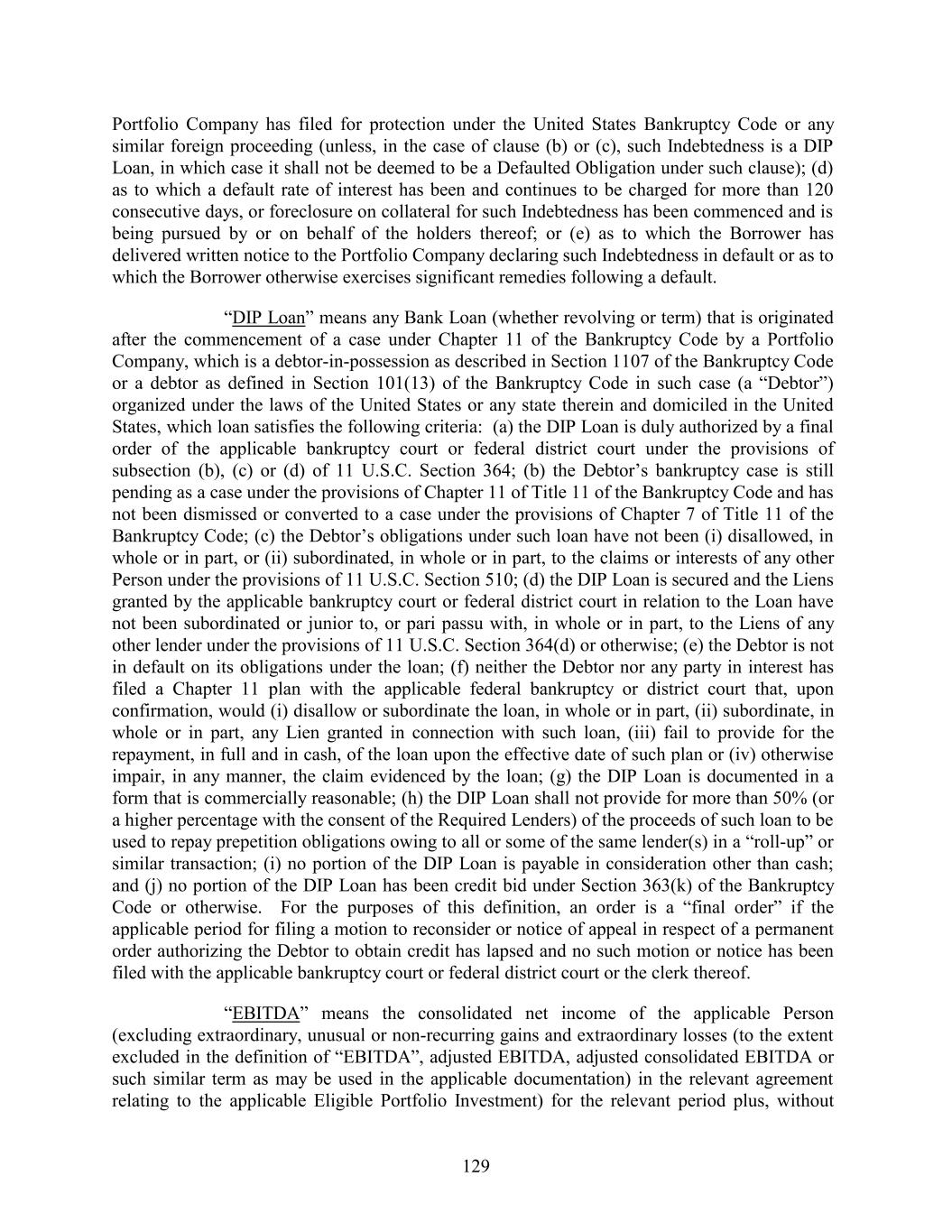 Portfolio Company has filed for protection under the United States Bankruptcy Code or any similar foreign proceeding (unless, in the case of clause (b) or (c), such Indebtedness is a DIP Loan, in which case it shall not be deemed to be a Defaulted Obligation under such clause); (d) as to which a default rate of interest has been and continues to be charged for more than 120 consecutive days, or foreclosure on collateral for such Indebtedness has been commenced and is being pursued by or on behalf of the holders thereof; or (e) as to which the Borrower has delivered written notice to the Portfolio Company declaring such Indebtedness in default or as to which the Borrower otherwise exercises significant remedies following a default. “DIP Loan” means any Bank Loan (whether revolving or term) that is originated after the commencement of a case under Chapter 11 of the Bankruptcy Code by a Portfolio Company, which is a debtor-in-possession as described in Section 1107 of the Bankruptcy Code or a debtor as defined in Section 101(13) of the Bankruptcy Code in such case (a “Debtor”) organized under the laws of the United States or any state therein and domiciled in the United States, which loan satisfies the following criteria: (a) the DIP Loan is duly authorized by a final order of the applicable bankruptcy court or federal district court under the provisions of subsection (b), (c) or (d) of 11 U.S.C. Section 364; (b) the Debtor’s bankruptcy case is still pending as a case under the provisions of Chapter 11 of Title 11 of the Bankruptcy Code and has not been dismissed or converted to a case under the provisions of Chapter 7 of Title 11 of the Bankruptcy Code; (c) the Debtor’s obligations under such loan have not been (i) disallowed, in whole or in part, or (ii) subordinated, in whole or in part, to the claims or interests of any other Person under the provisions of 11 U.S.C. Section 510; (d) the DIP Loan is secured and the Liens granted by the applicable bankruptcy court or federal district court in relation to the Loan have not been subordinated or junior to, or pari passu with, in whole or in part, to the Liens of any other lender under the provisions of 11 U.S.C. Section 364(d) or otherwise; (e) the Debtor is not in default on its obligations under the loan; (f) neither the Debtor nor any party in interest has filed a Chapter 11 plan with the applicable federal bankruptcy or district court that, upon confirmation, would (i) disallow or subordinate the loan, in whole or in part, (ii) subordinate, in whole or in part, any Lien granted in connection with such loan, (iii) fail to provide for the repayment, in full and in cash, of the loan upon the effective date of such plan or (iv) otherwise impair, in any manner, the claim evidenced by the loan; (g) the DIP Loan is documented in a form that is commercially reasonable; (h) the DIP Loan shall not provide for more than 50% (or a higher percentage with the consent of the Required Lenders) of the proceeds of such loan to be used to repay prepetition obligations owing to all or some of the same lender(s) in a “roll-up” or similar transaction; (i) no portion of the DIP Loan is payable in consideration other than cash; and (j) no portion of the DIP Loan has been credit bid under Section 363(k) of the Bankruptcy Code or otherwise. For the purposes of this definition, an order is a “final order” if the applicable period for filing a motion to reconsider or notice of appeal in respect of a permanent order authorizing the Debtor to obtain credit has lapsed and no such motion or notice has been filed with the applicable bankruptcy court or federal district court or the clerk thereof. “EBITDA” means the consolidated net income of the applicable Person (excluding extraordinary, unusual or non-recurring gains and extraordinary losses (to the extent excluded in the definition of “EBITDA”, adjusted EBITDA, adjusted consolidated EBITDA or such similar term as may be used in the applicable documentation) in the relevant agreement relating to the applicable Eligible Portfolio Investment) for the relevant period plus, without 129