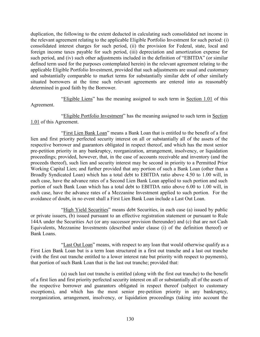 duplication, the following to the extent deducted in calculating such consolidated net income in the relevant agreement relating to the applicable Eligible Portfolio Investment for such period: (i) consolidated interest charges for such period, (ii) the provision for Federal, state, local and foreign income taxes payable for such period, (iii) depreciation and amortization expense for such period, and (iv) such other adjustments included in the definition of “EBITDA” (or similar defined term used for the purposes contemplated herein) in the relevant agreement relating to the applicable Eligible Portfolio Investment, provided that such adjustments are usual and customary and substantially comparable to market terms for substantially similar debt of other similarly situated borrowers at the time such relevant agreements are entered into as reasonably determined in good faith by the Borrower. “Eligible Liens” has the meaning assigned to such term in Section 1.01 of this Agreement. “Eligible Portfolio Investment” has the meaning assigned to such term in Section 1.01 of this Agreement. “First Lien Bank Loan” means a Bank Loan that is entitled to the benefit of a first lien and first priority perfected security interest on all or substantially all of the assets of the respective borrower and guarantors obligated in respect thereof, and which has the most senior pre-petition priority in any bankruptcy, reorganization, arrangement, insolvency, or liquidation proceedings; provided, however, that, in the case of accounts receivable and inventory (and the proceeds thereof), such lien and security interest may be second in priority to a Permitted Prior Working Capital Lien; and further provided that any portion of such a Bank Loan (other than a Broadly Syndicated Loan) which has a total debt to EBITDA ratio above 4.50 to 1.00 will, in each case, have the advance rates of a Second Lien Bank Loan applied to such portion and such portion of such Bank Loan which has a total debt to EBITDA ratio above 6.00 to 1.00 will, in each case, have the advance rates of a Mezzanine Investment applied to such portion. For the avoidance of doubt, in no event shall a First Lien Bank Loan include a Last Out Loan. “High Yield Securities” means debt Securities, in each case (a) issued by public or private issuers, (b) issued pursuant to an effective registration statement or pursuant to Rule 144A under the Securities Act (or any successor provision thereunder) and (c) that are not Cash Equivalents, Mezzanine Investments (described under clause (i) of the definition thereof) or Bank Loans. “Last Out Loan” means, with respect to any loan that would otherwise qualify as a First Lien Bank Loan but is a term loan structured in a first out tranche and a last out tranche (with the first out tranche entitled to a lower interest rate but priority with respect to payments), that portion of such Bank Loan that is the last out tranche; provided that: (a) such last out tranche is entitled (along with the first out tranche) to the benefit of a first lien and first priority perfected security interest on all or substantially all of the assets of the respective borrower and guarantors obligated in respect thereof (subject to customary exceptions), and which has the most senior pre-petition priority in any bankruptcy, reorganization, arrangement, insolvency, or liquidation proceedings (taking into account the 130